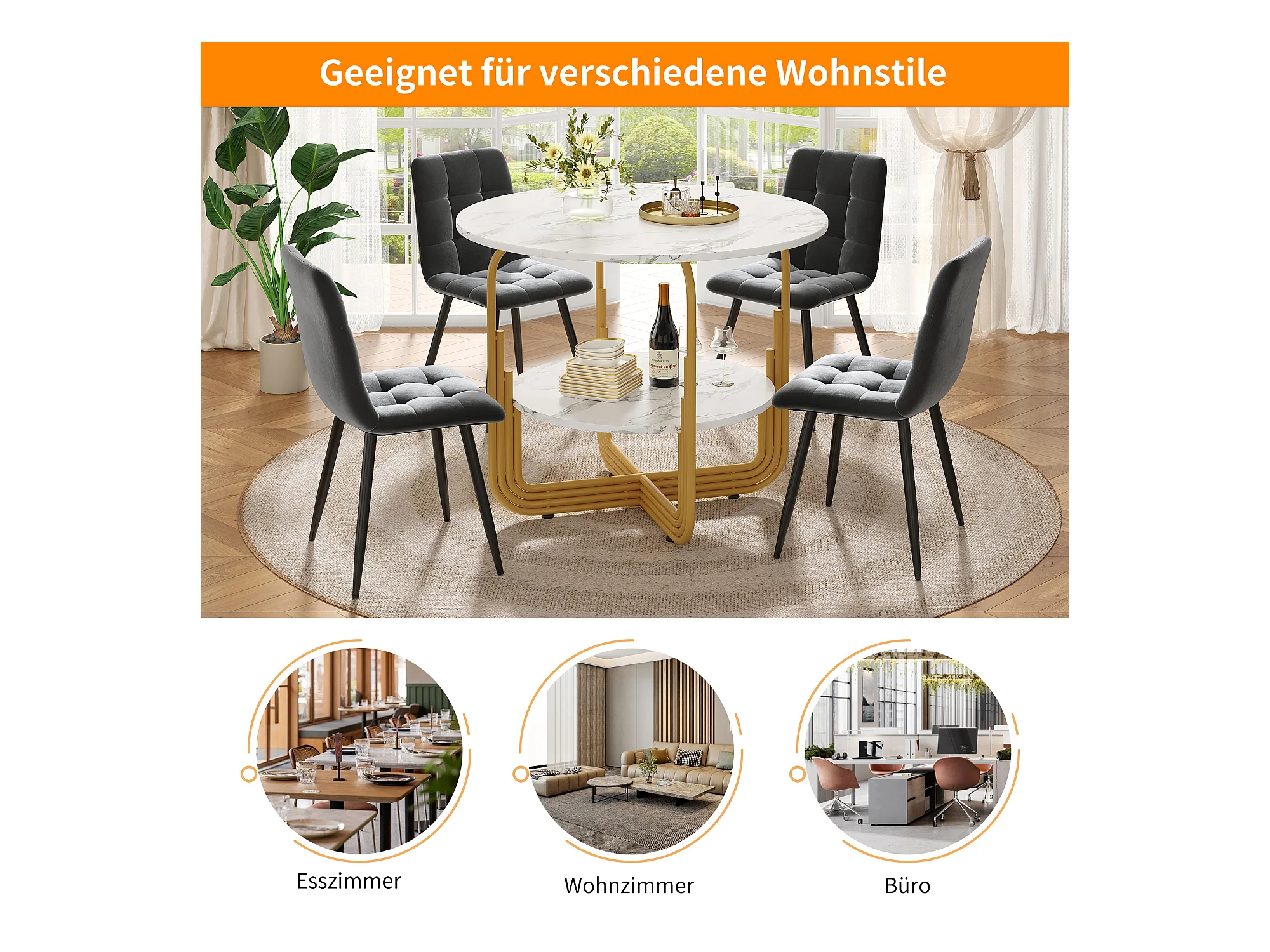 Ensemble table à manger et chaises (5 pièces), table ronde en marbre moderne + 4 chaises en velours gris avec pieds dorés (diamètre 50x75 cm)