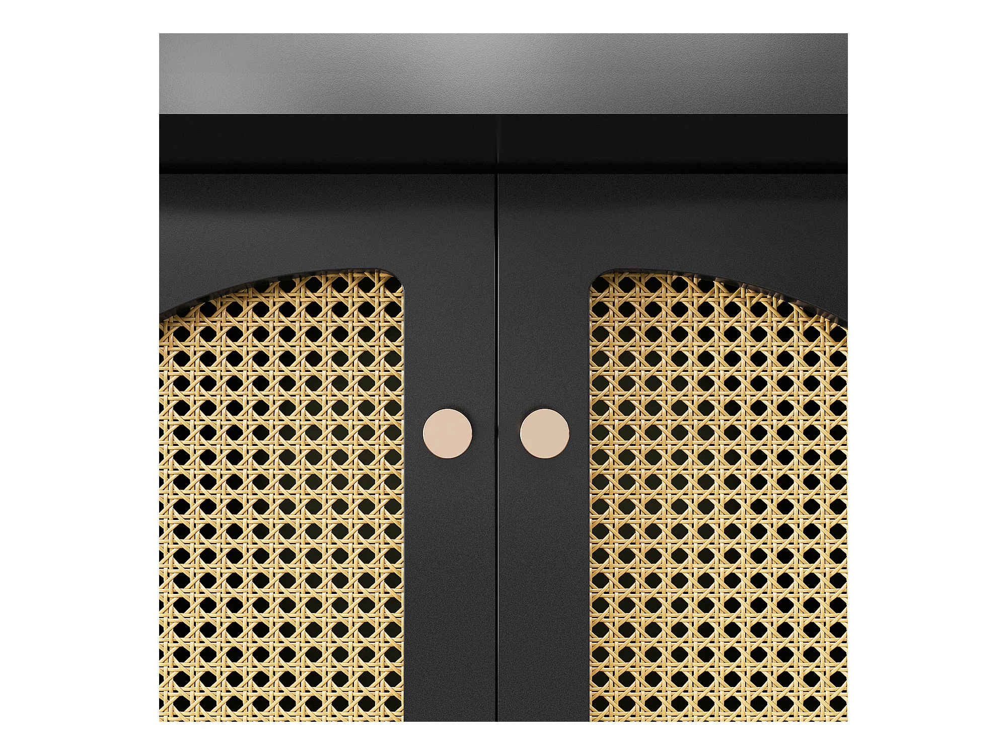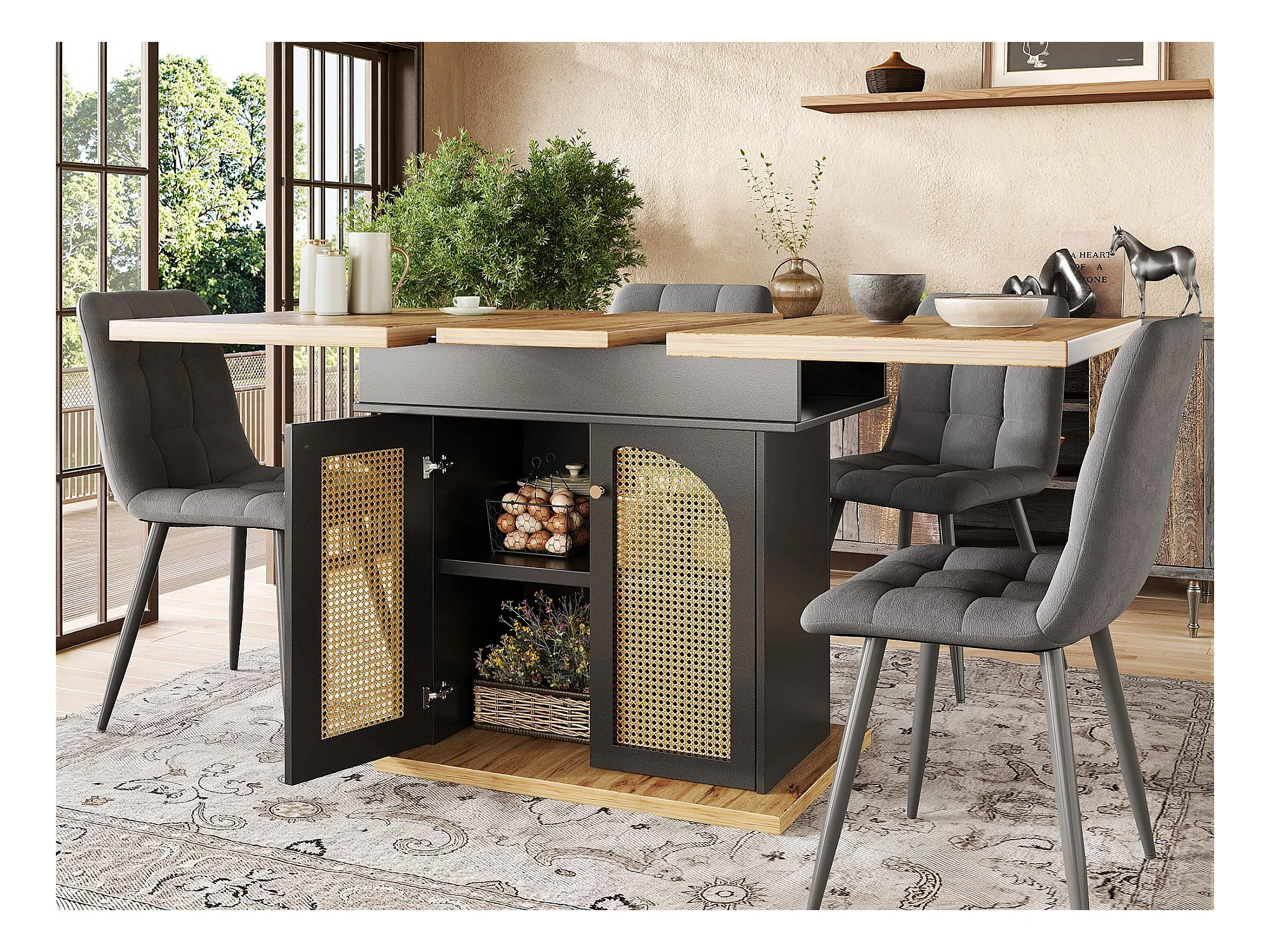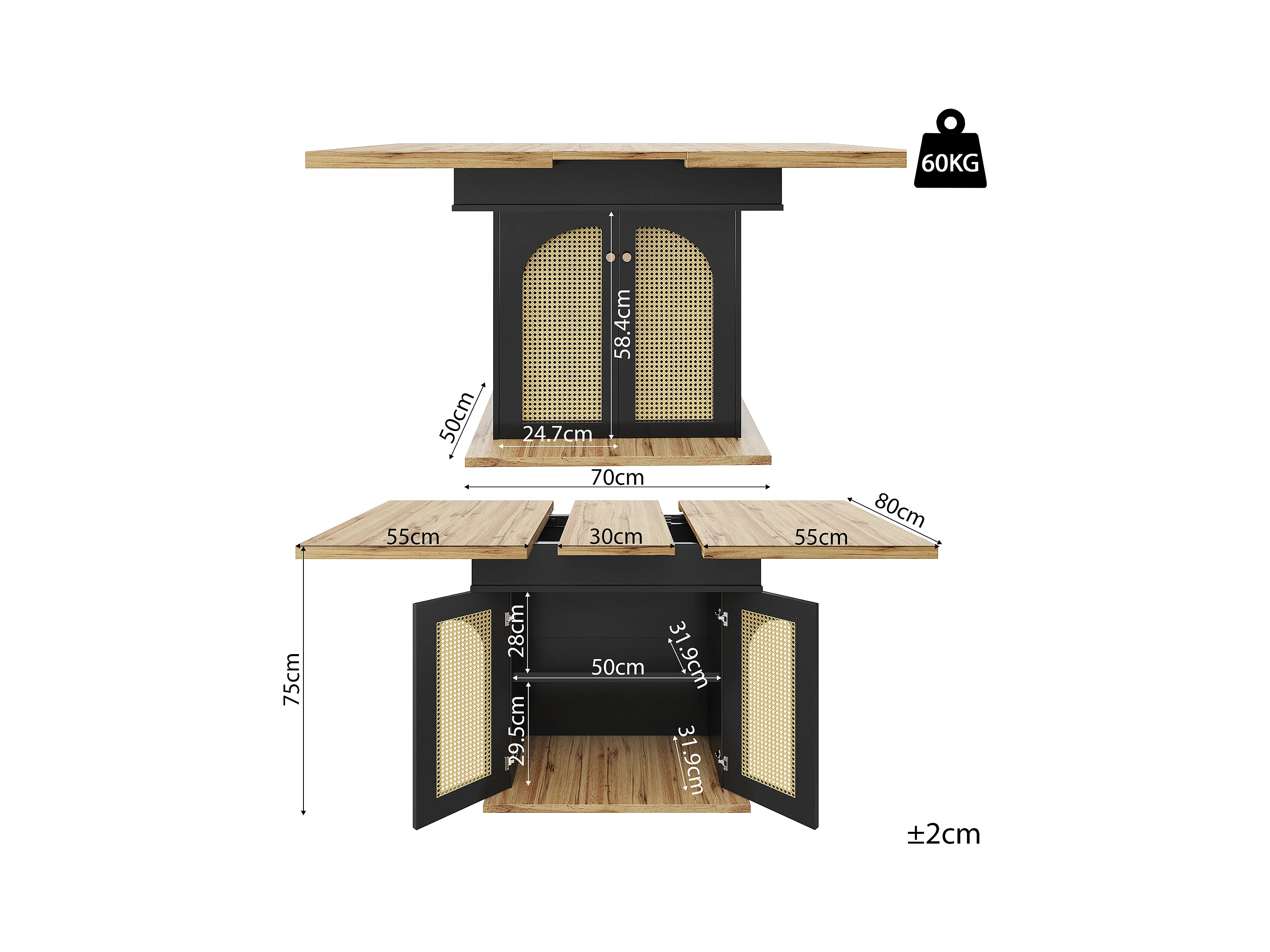 Table à manger extensible 110-140×80cm - 4-6 personnes - 2 portes en rotin PE - style rétro - Noir + Naturel