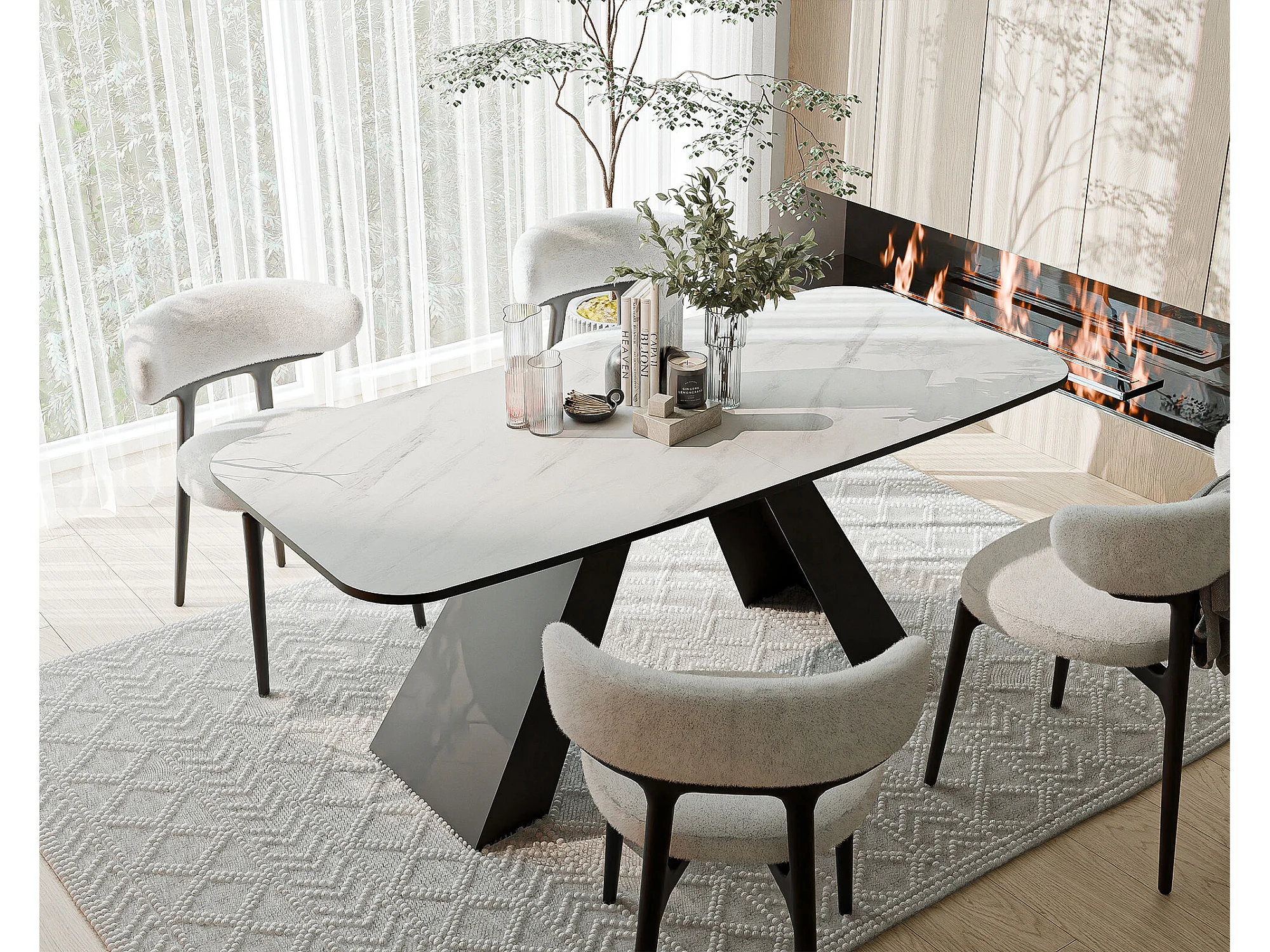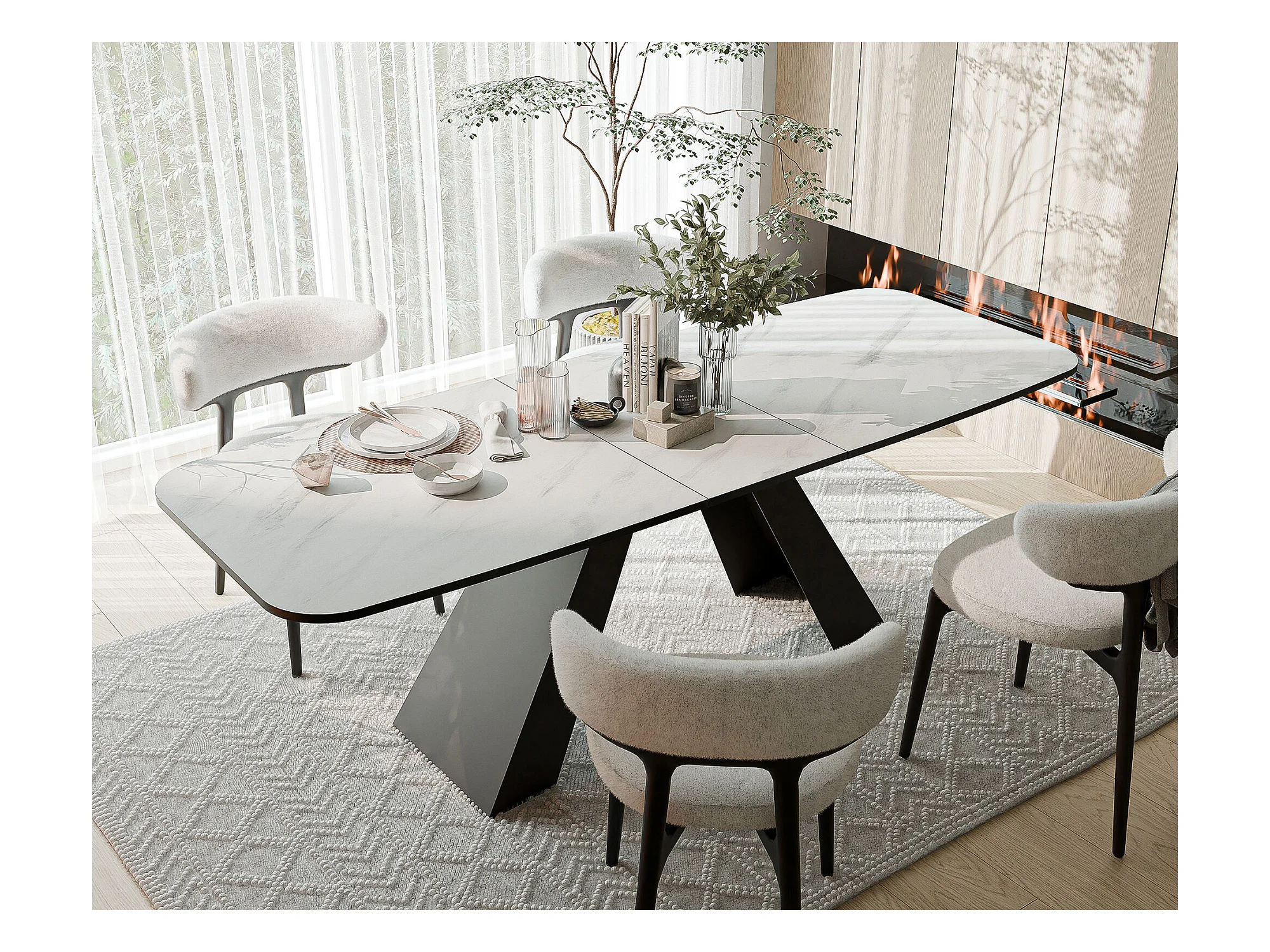 Table à manger extensible 180/218 en MDF, pieds en métal noir, marbre bianco