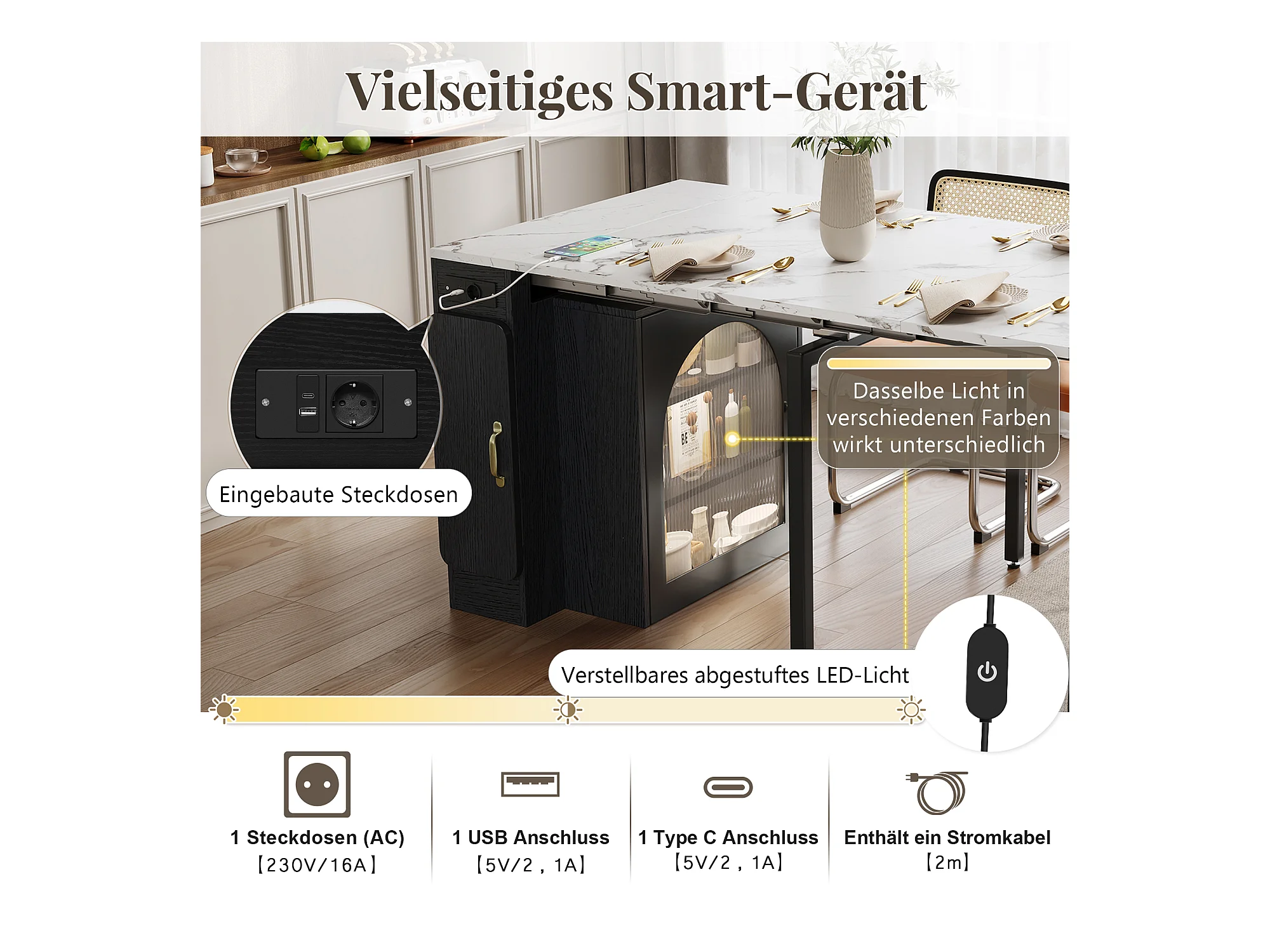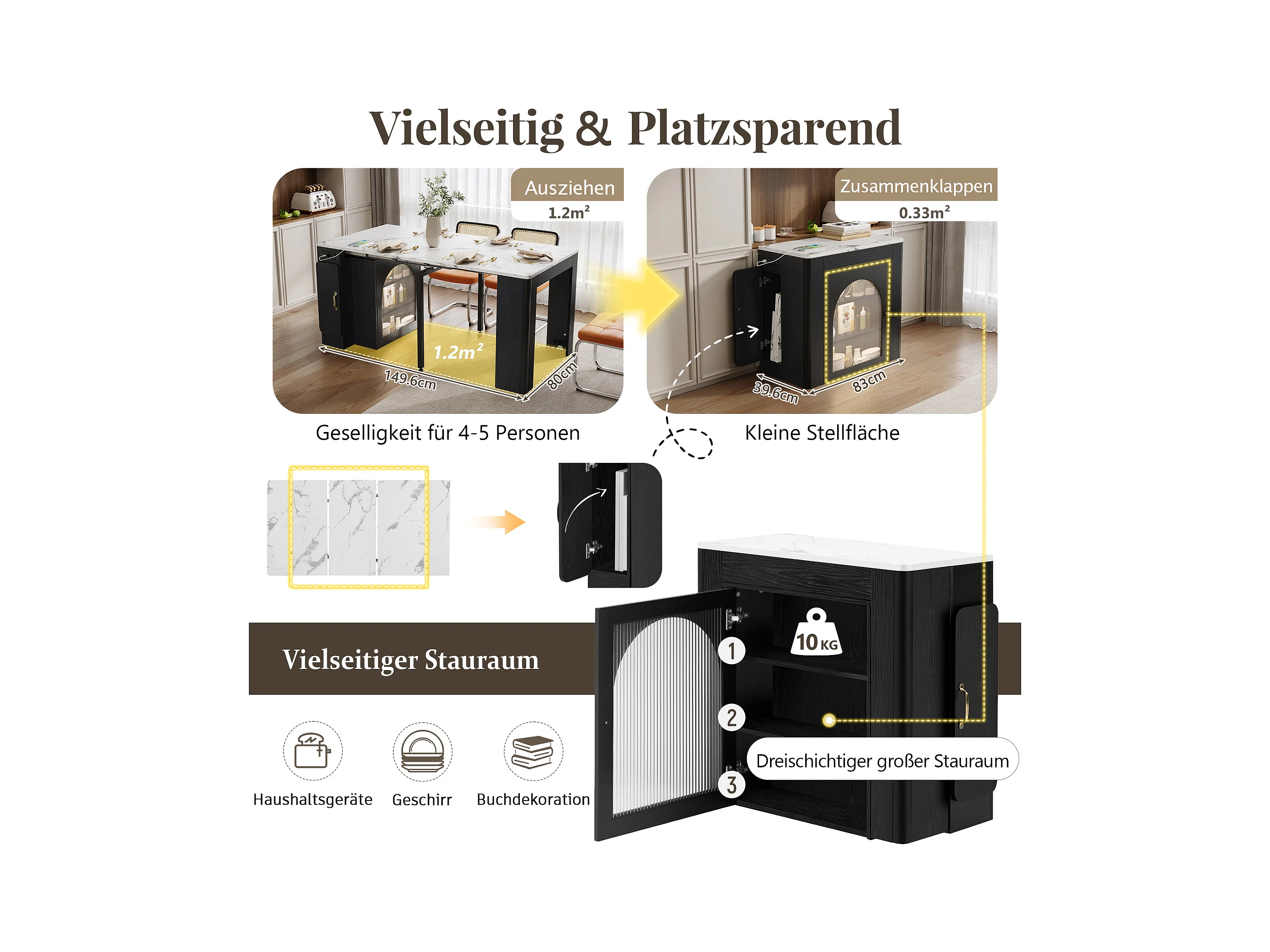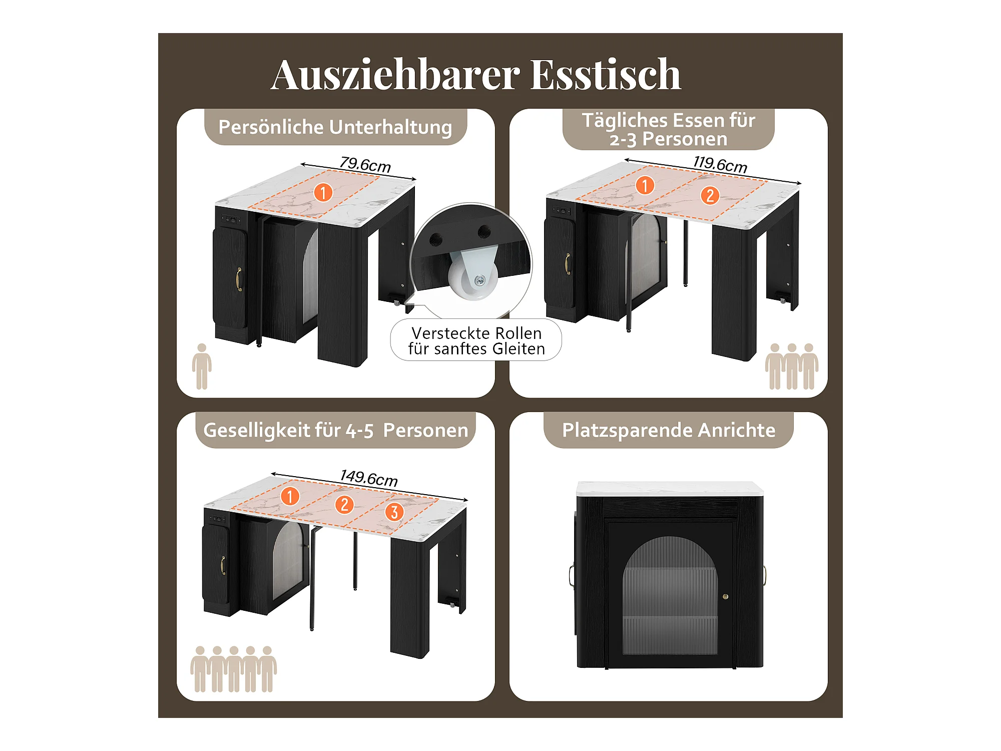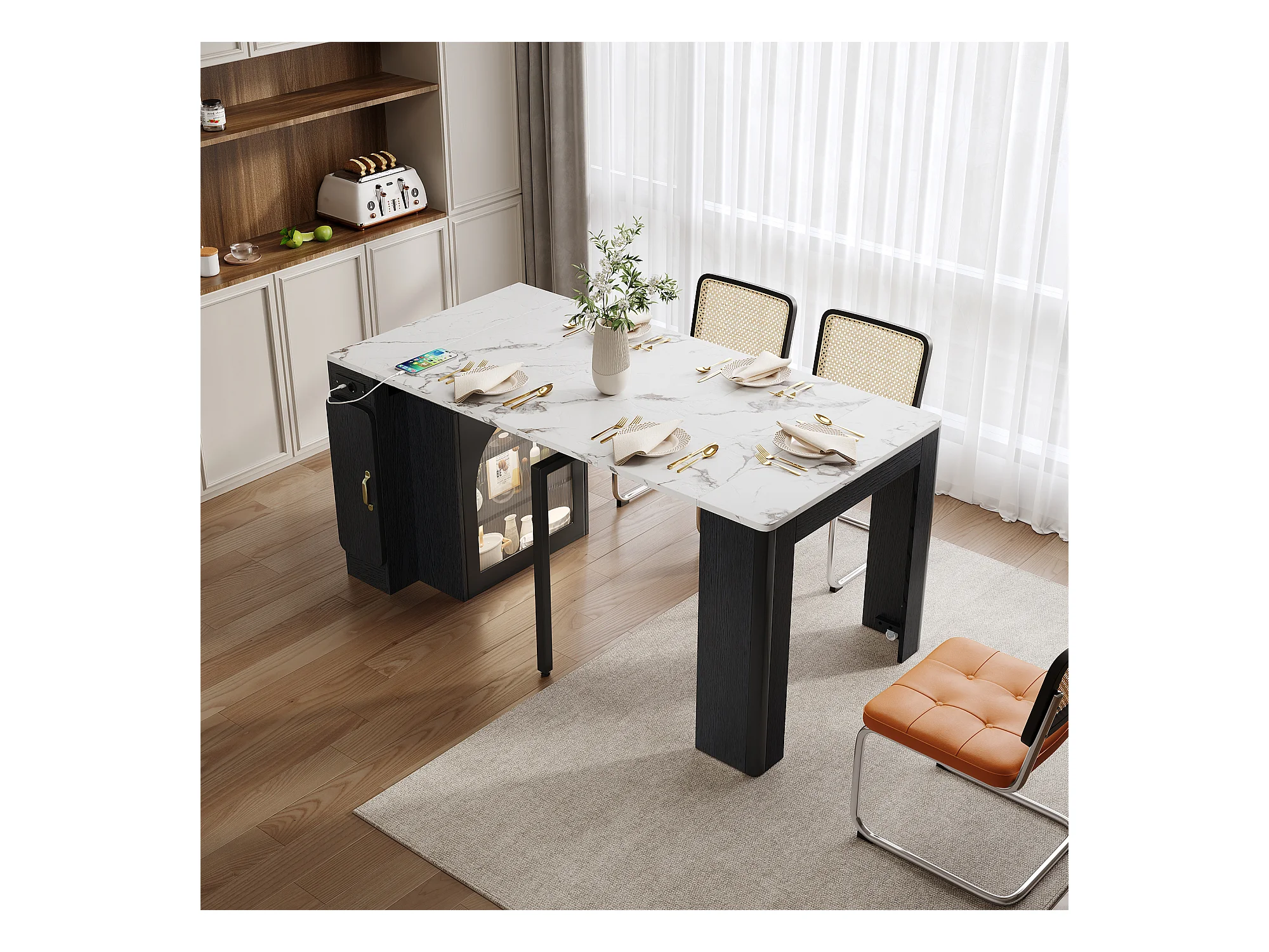 Table à manger extensible avec plateau amovible - 83 x 39.6/79.6/149.6 x 77 cm - avec rangement - MDF + verre - noir + blanc