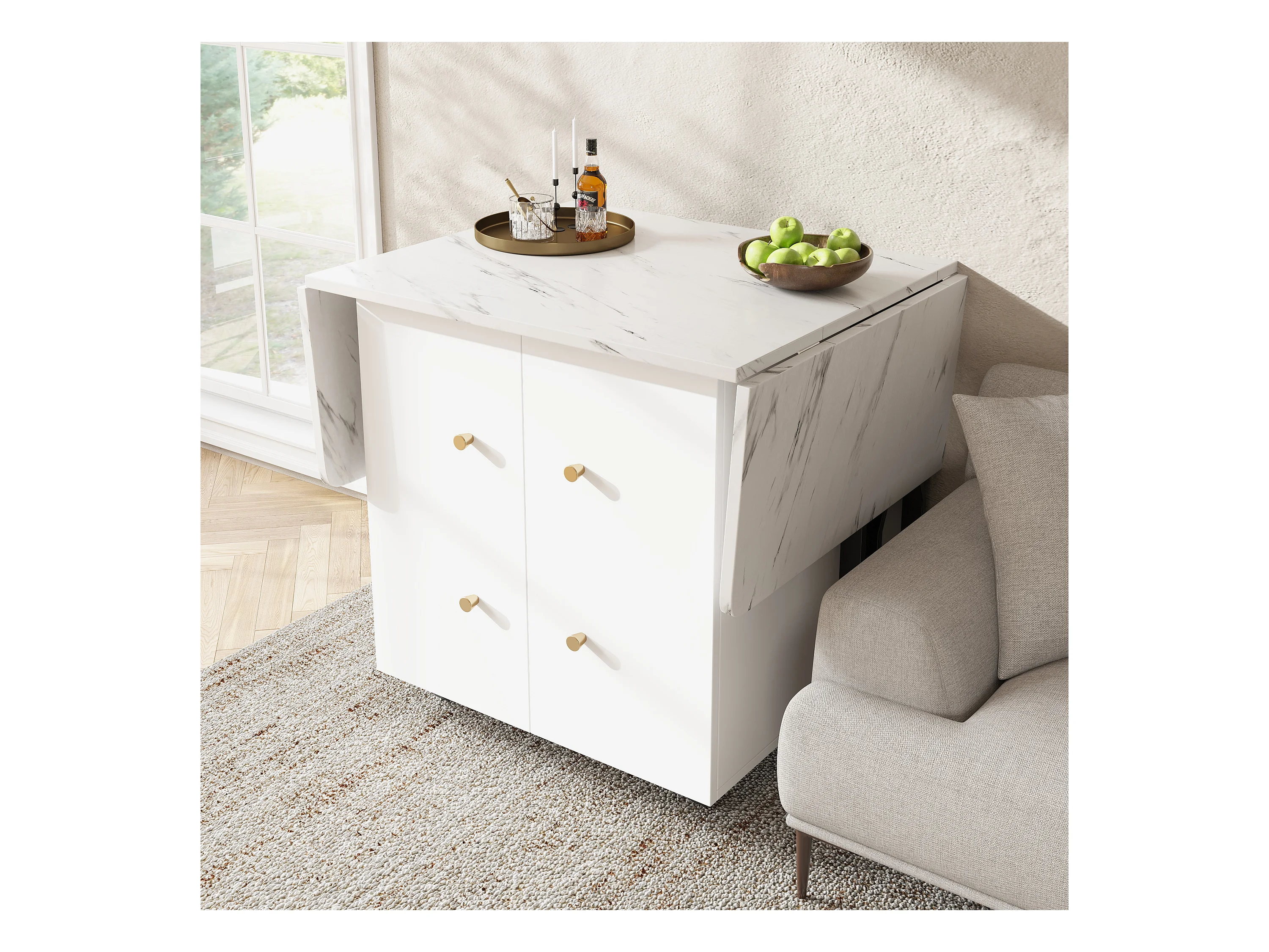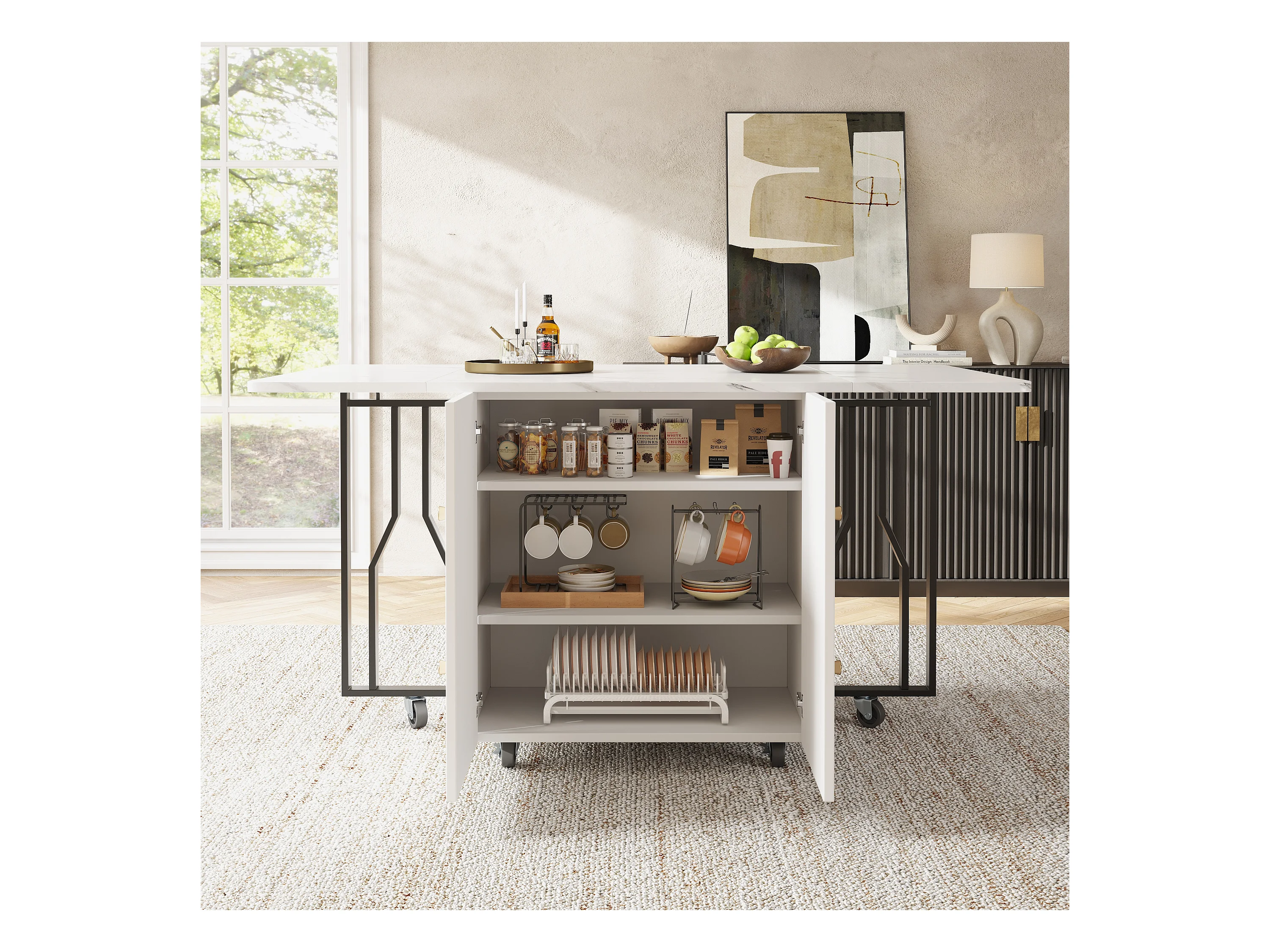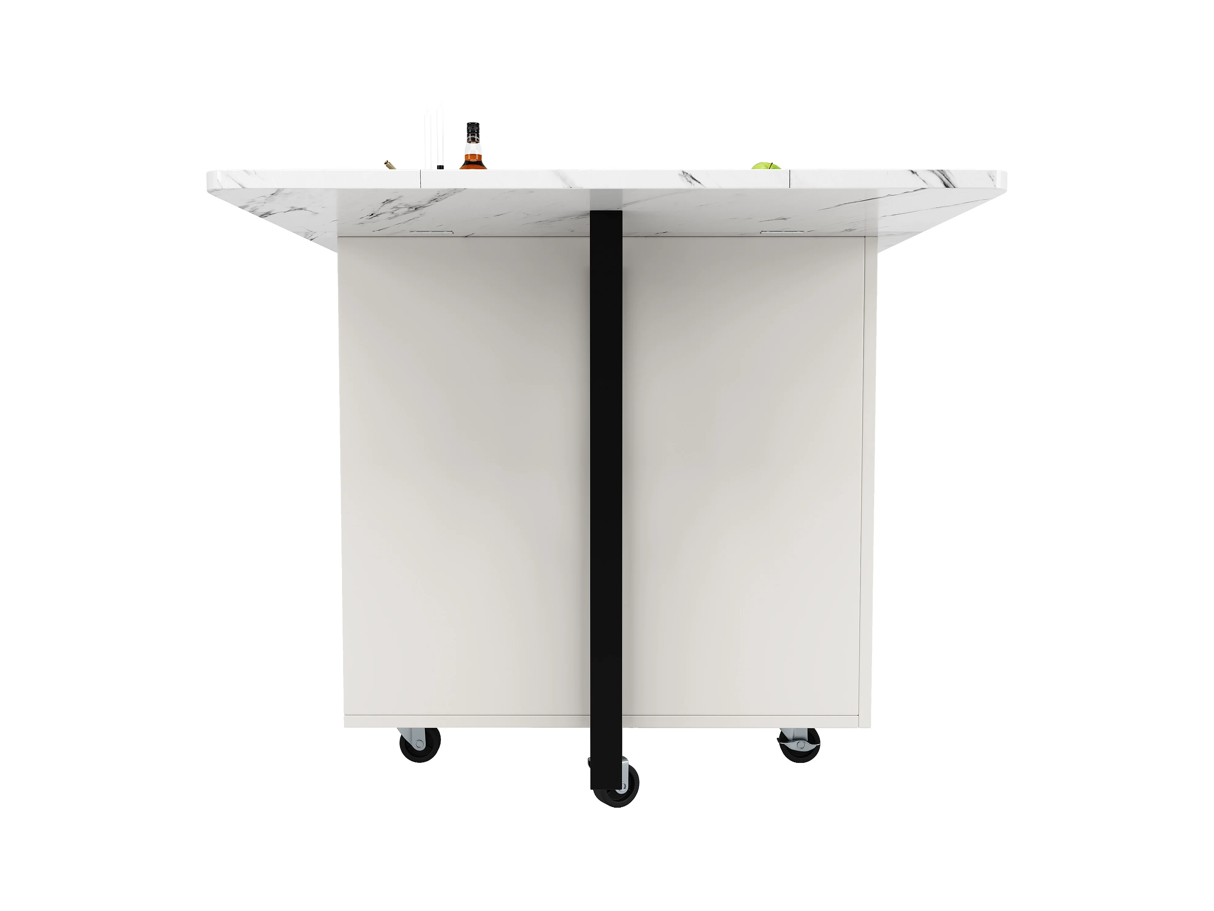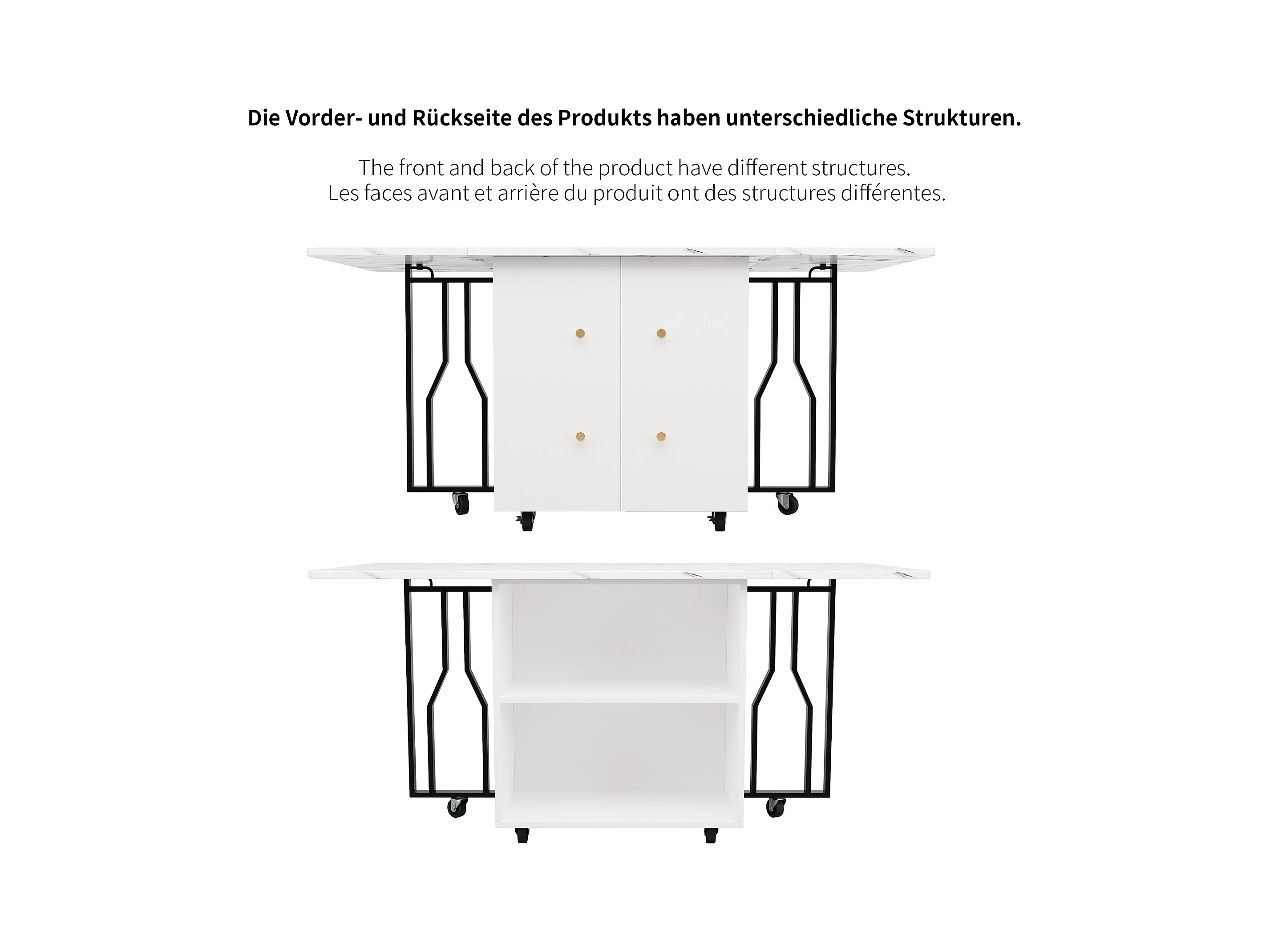 Table à manger extensible, Effet marbre blanc, - 140x75x76.3 cm - avec rangement, 6 roulettes, pieds noirs