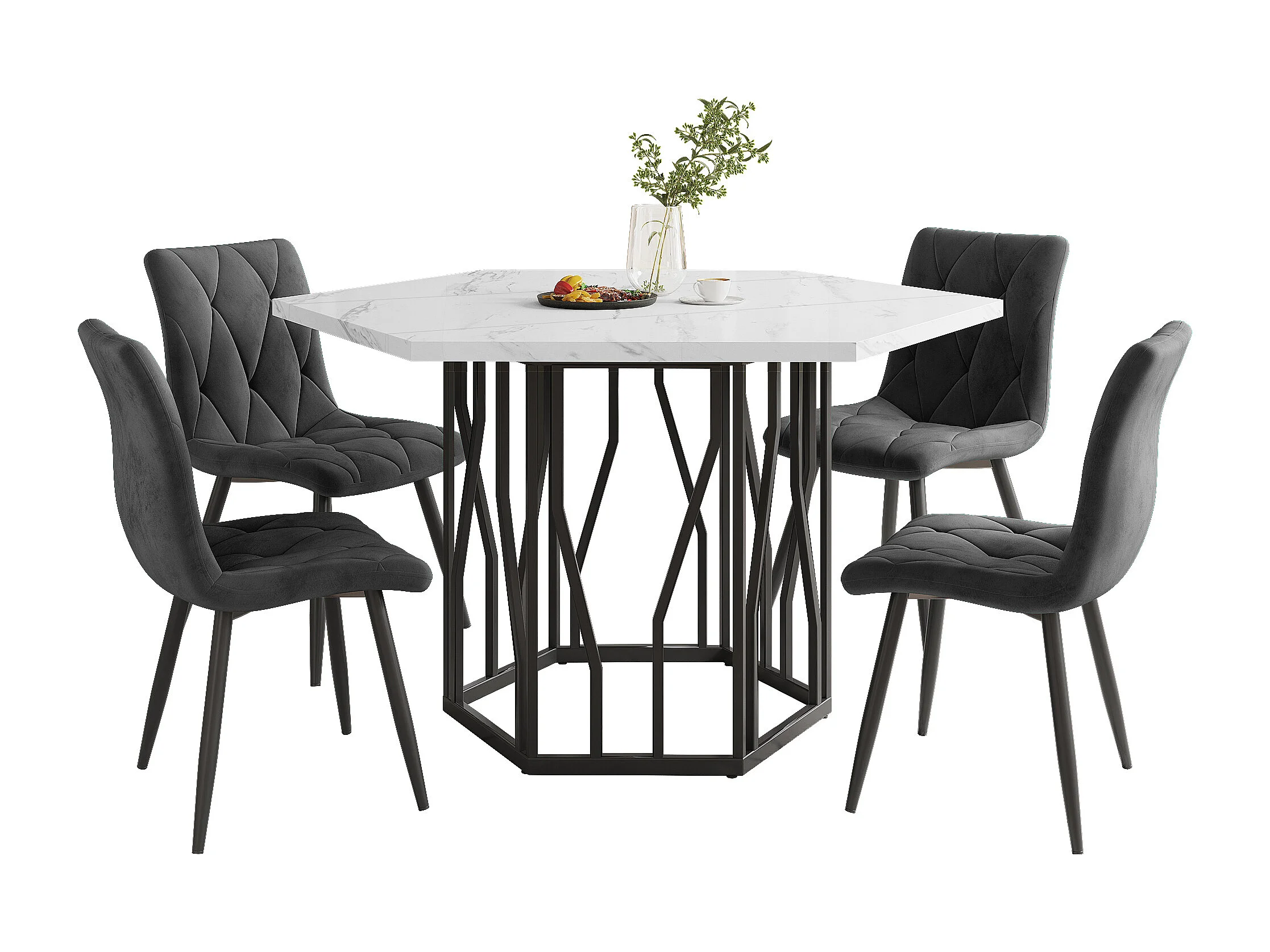 Table à manger hexagonale moderne, MDF + Métal, Marmoréale + Noir, (140×80×76 cm)
