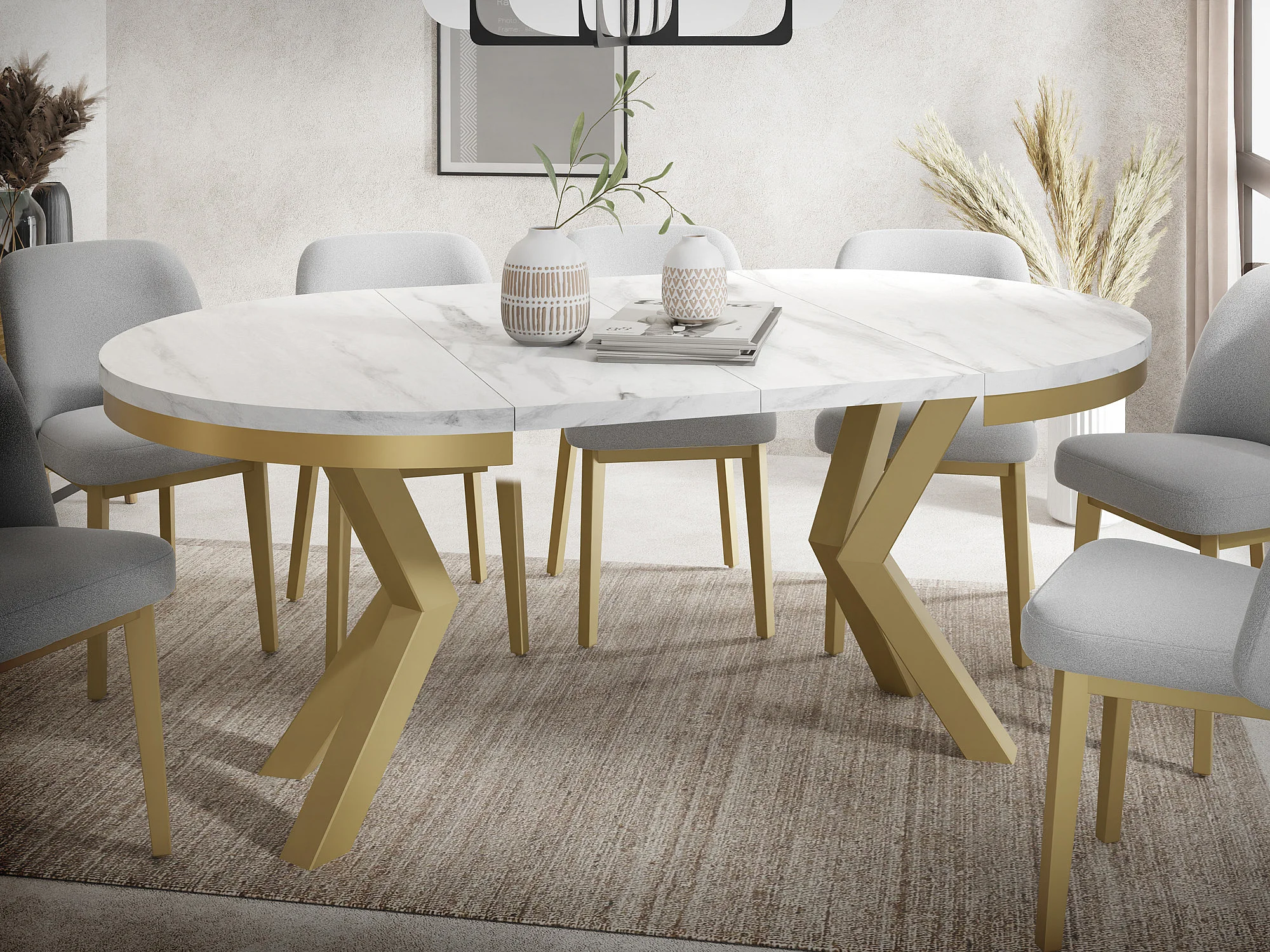 Table à Manger Ronde Extensible Style Loft - Table avec Pieds Métalliques Dorés - Table Gain de Place pour Salon - Marbre Blanc - 100 à 180 cm
