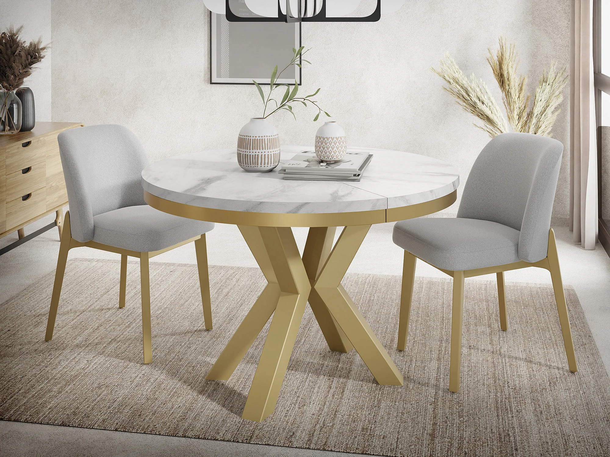 Table à Manger Ronde Extensible Style Loft - Table avec Pieds Métalliques Dorés - Table Gain de Place pour Salon - Marbre Blanc - 120 à 200 cm