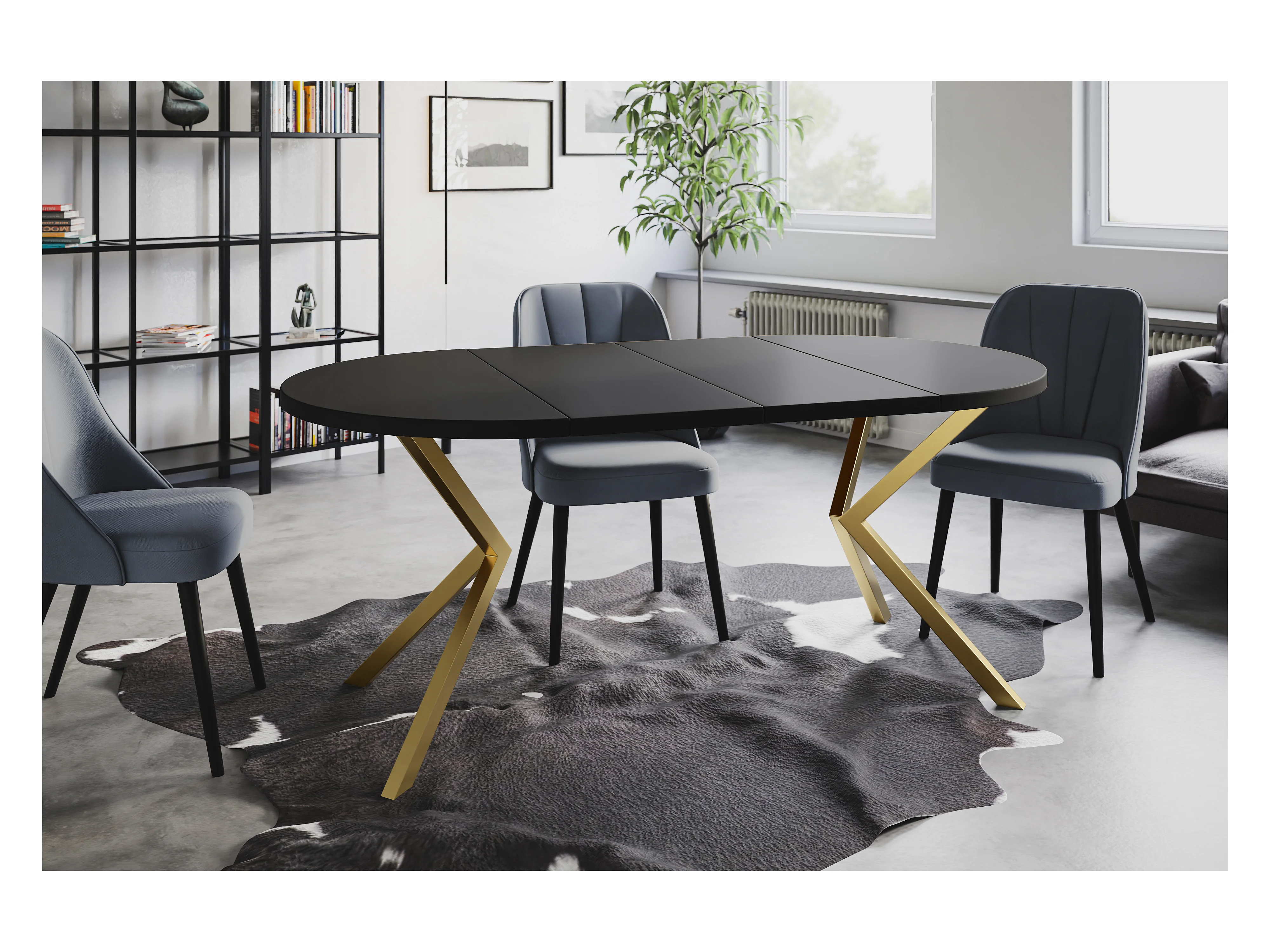 Table à manger ronde LITEN, table à rallonges Diamètre : 120 cm/200 cm, couleur de la table basse : noir, avec pieds métalliques couleur or