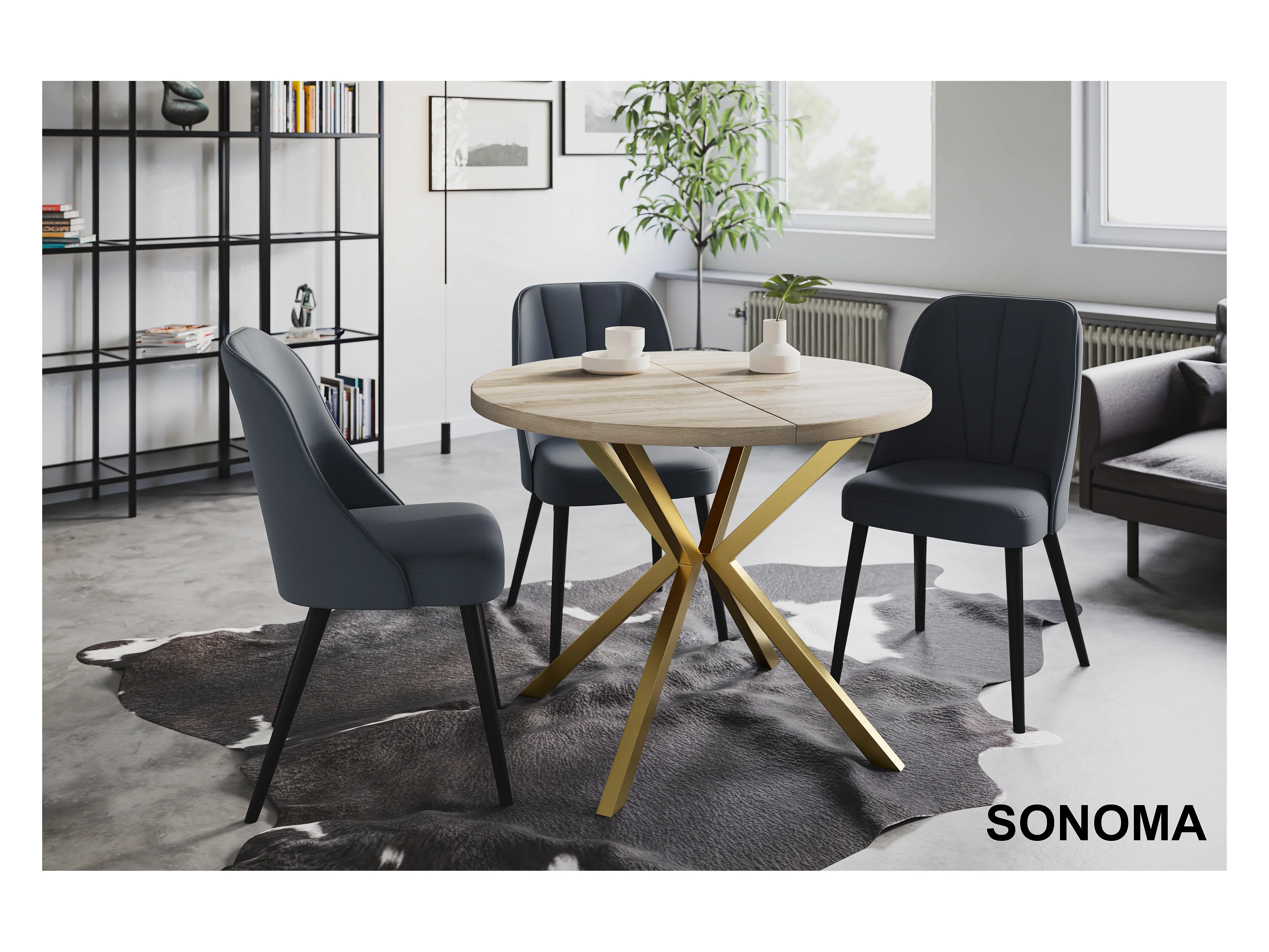 Table à manger ronde LITEN, table à rallonges Diamètre : 120 cm/200 cm, couleur de la table de salon : beige, avec pieds métalliques couleur or