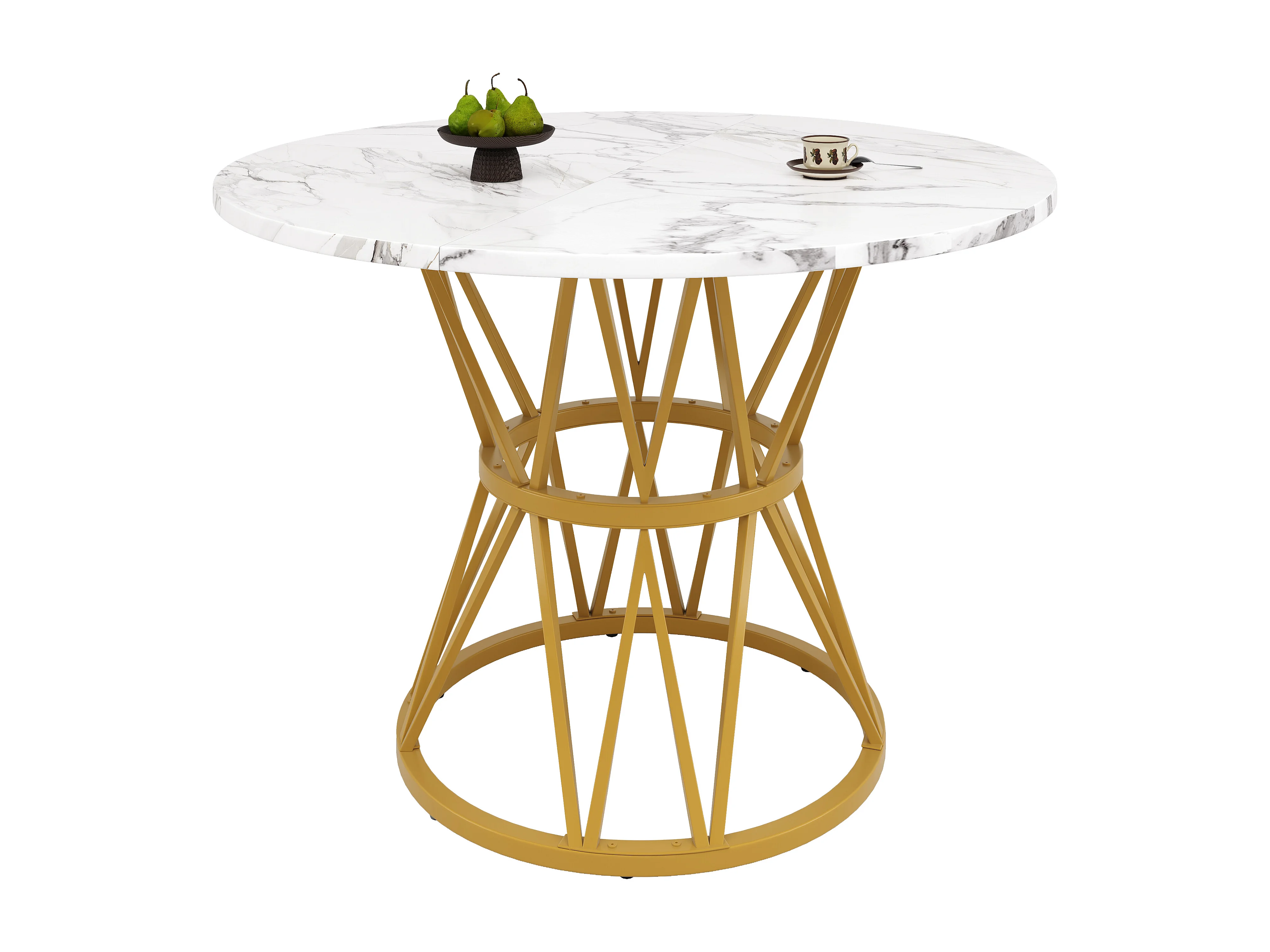 Table à manger ronde 100x100x76 cm pour 4 personnes - pied en métal doré - plateau mdf motif marbre blanc