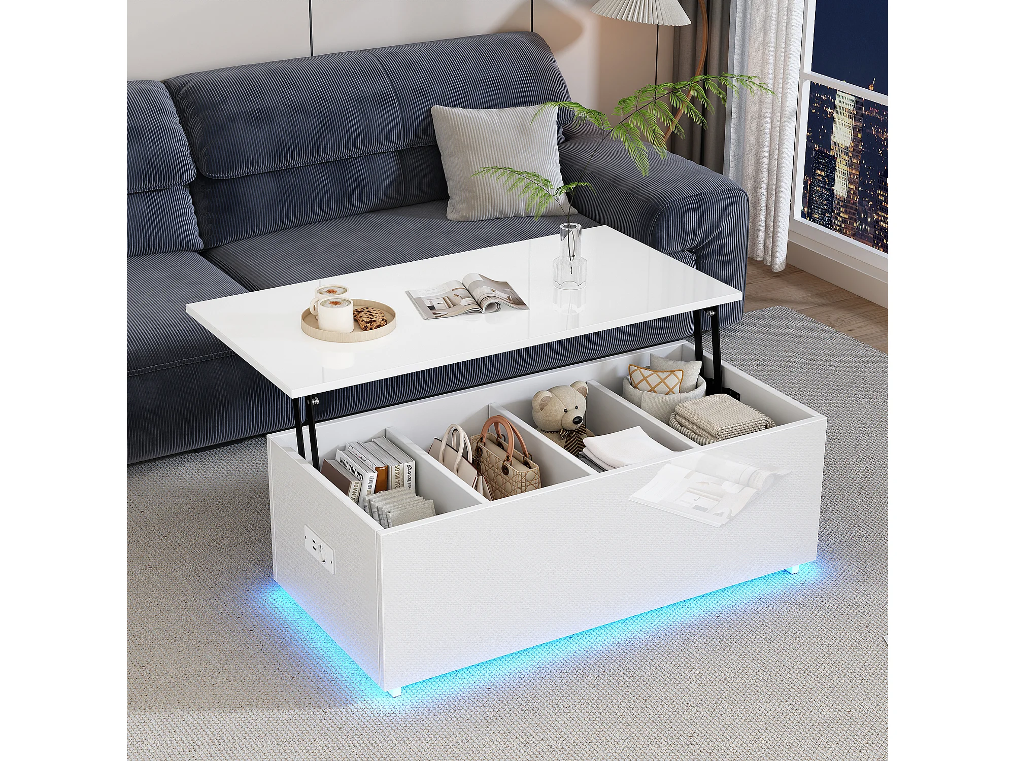 Table basse 100x50x55cm LED levage hydraulique rangement multi-niveaux Blanc pour salon