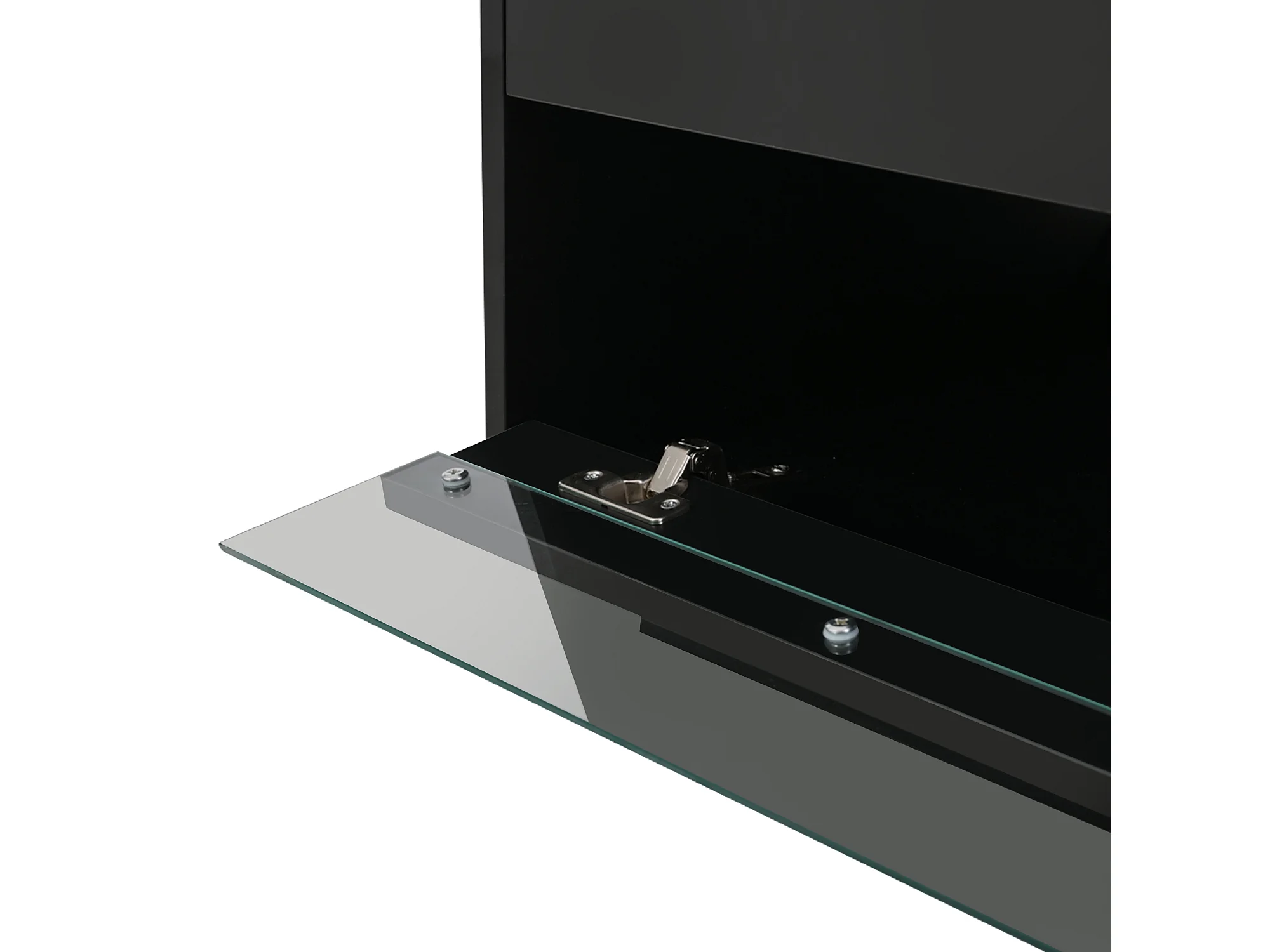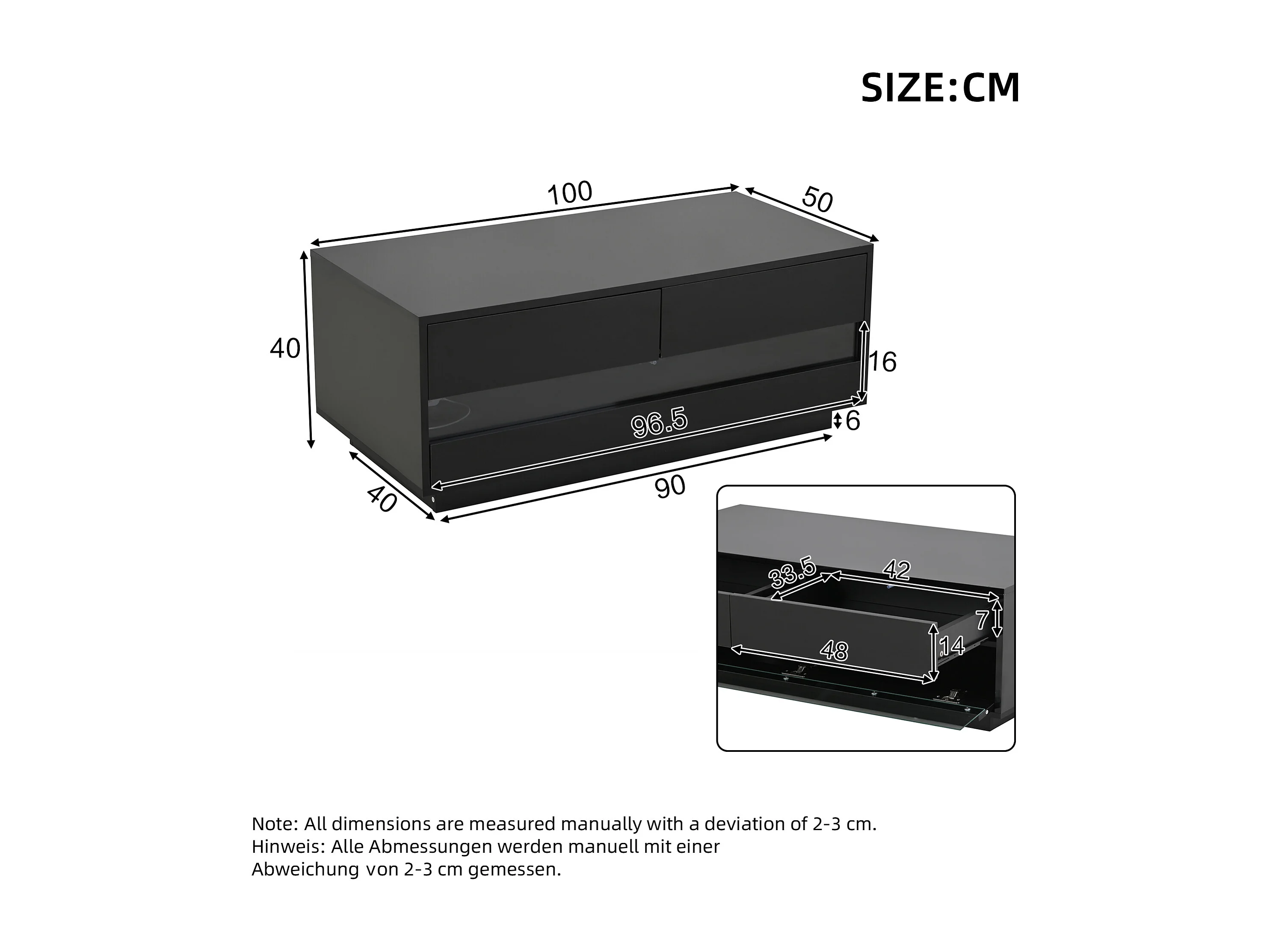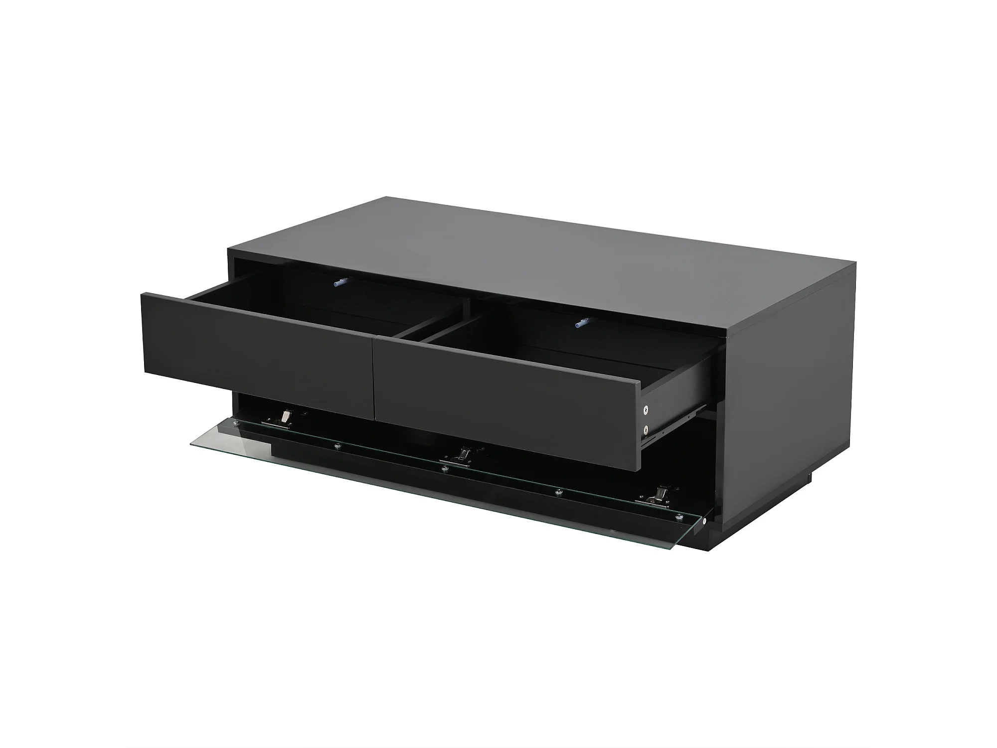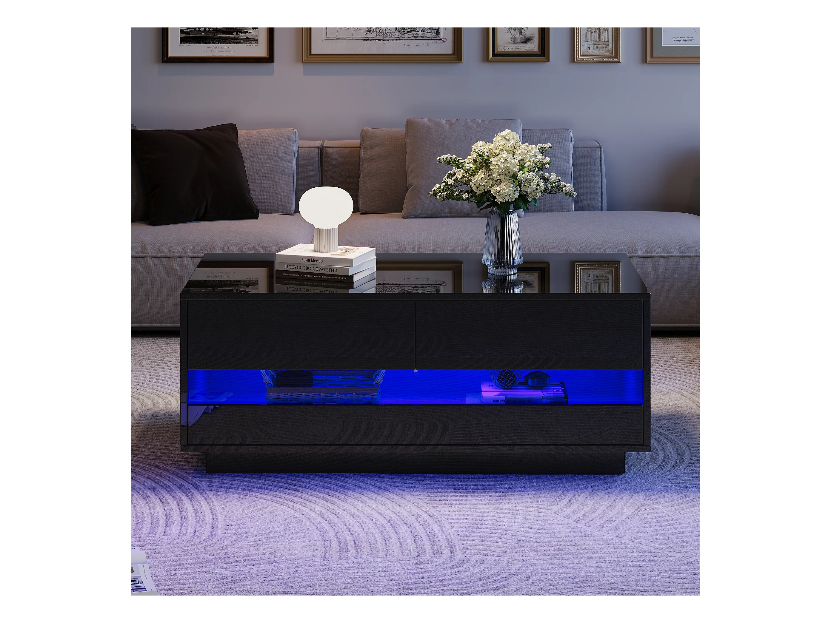 Table basse 100x50x40 cm LED 2 tiroirs brillant verre trempé insonorisé rangement intégré noir salon design