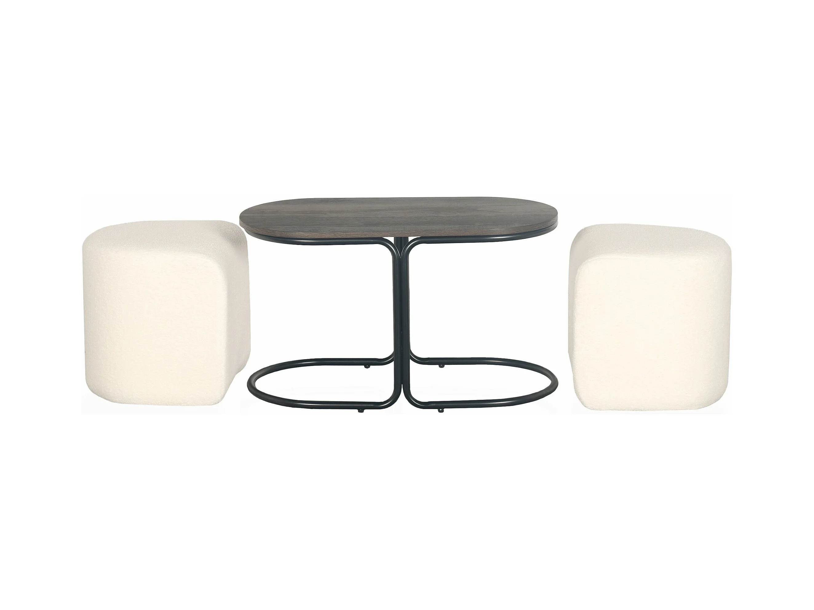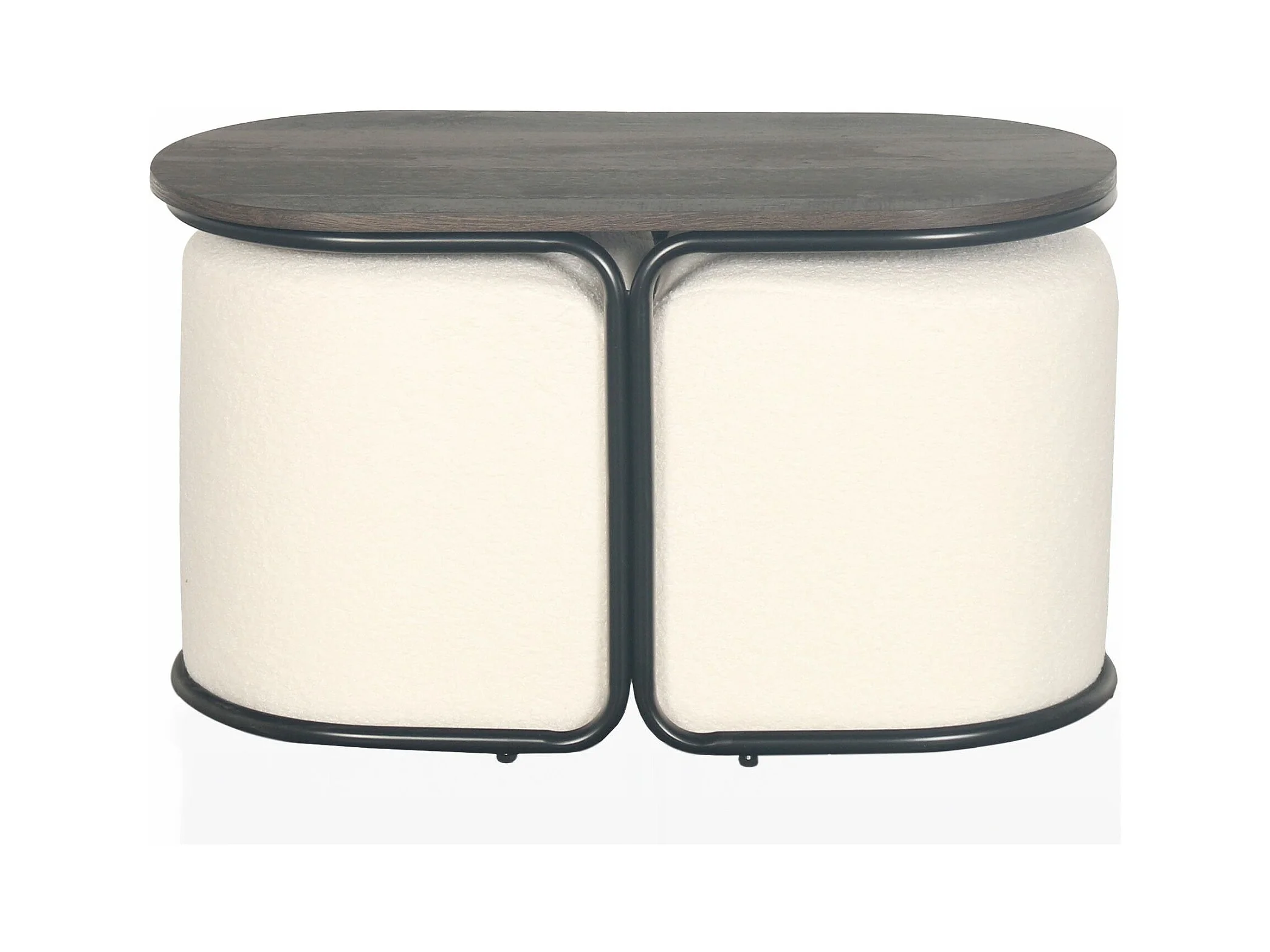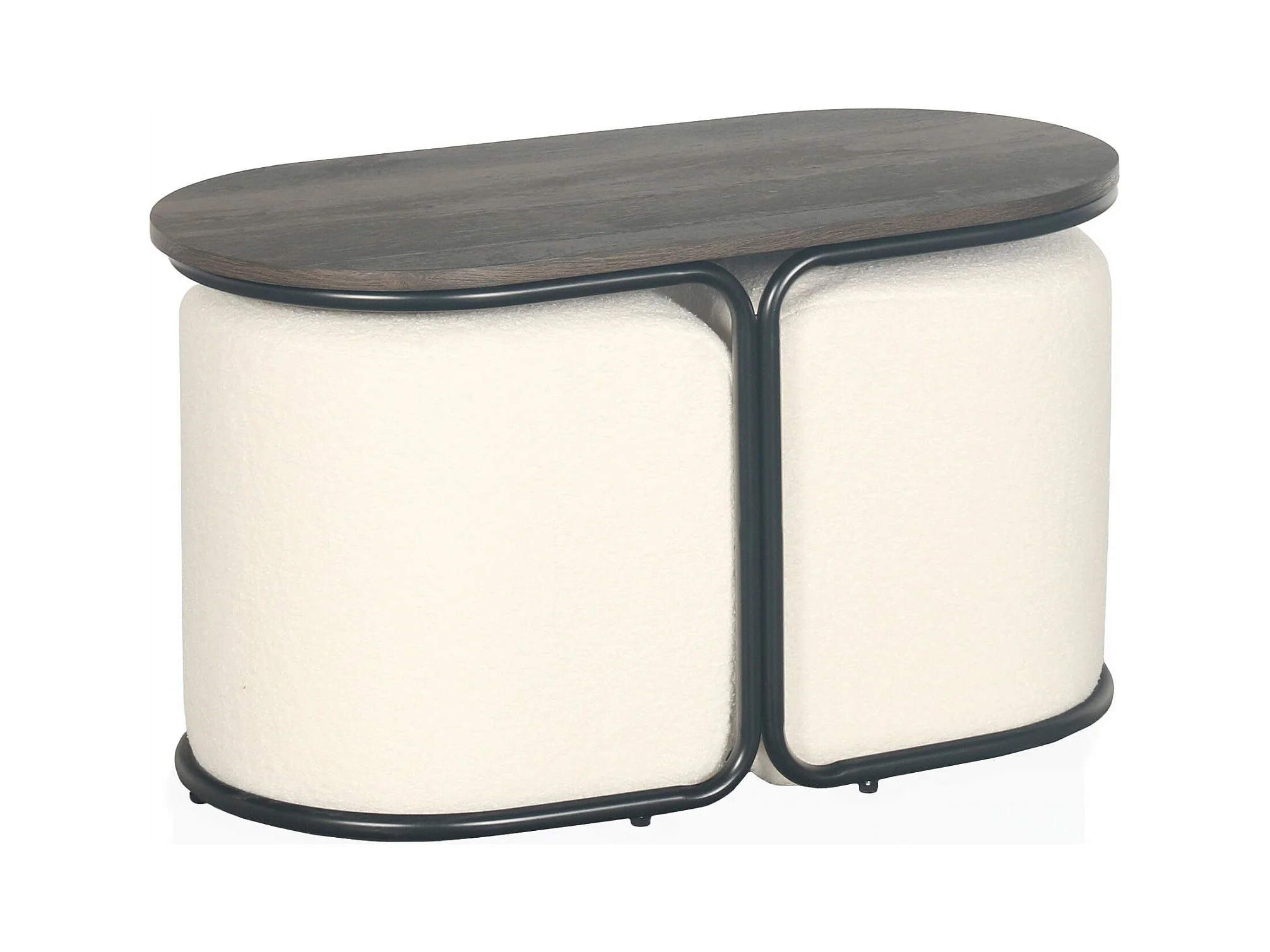 Table basse avec 2 poufs Livaretti Bois foncé et Tissu bouclette Crème