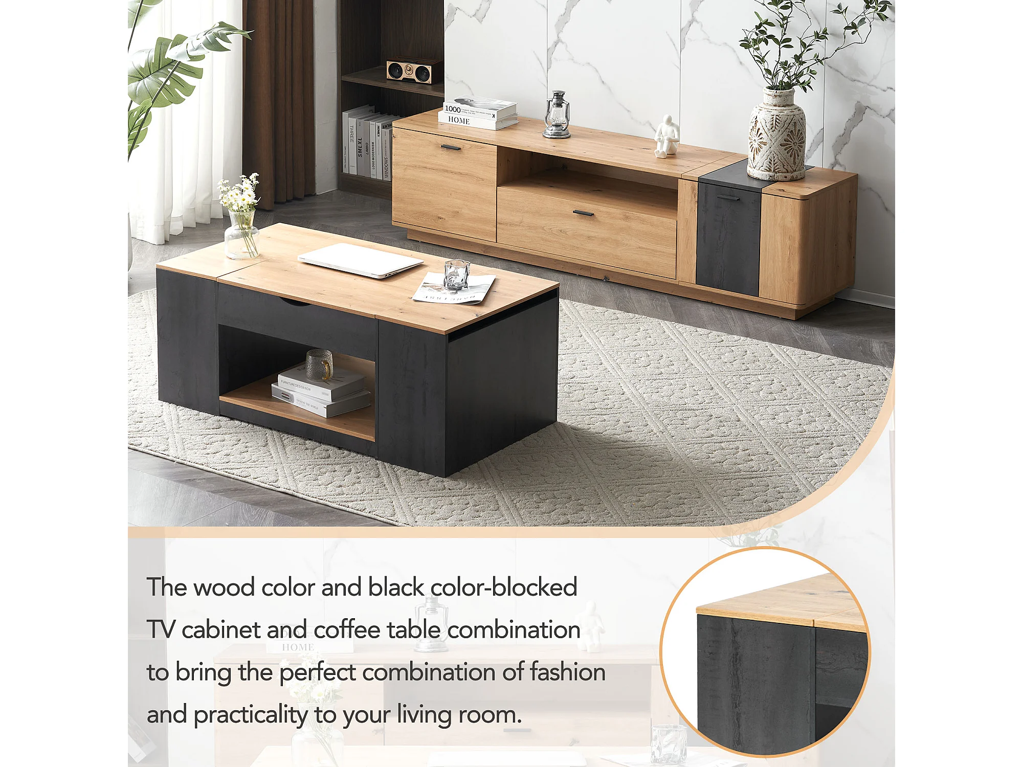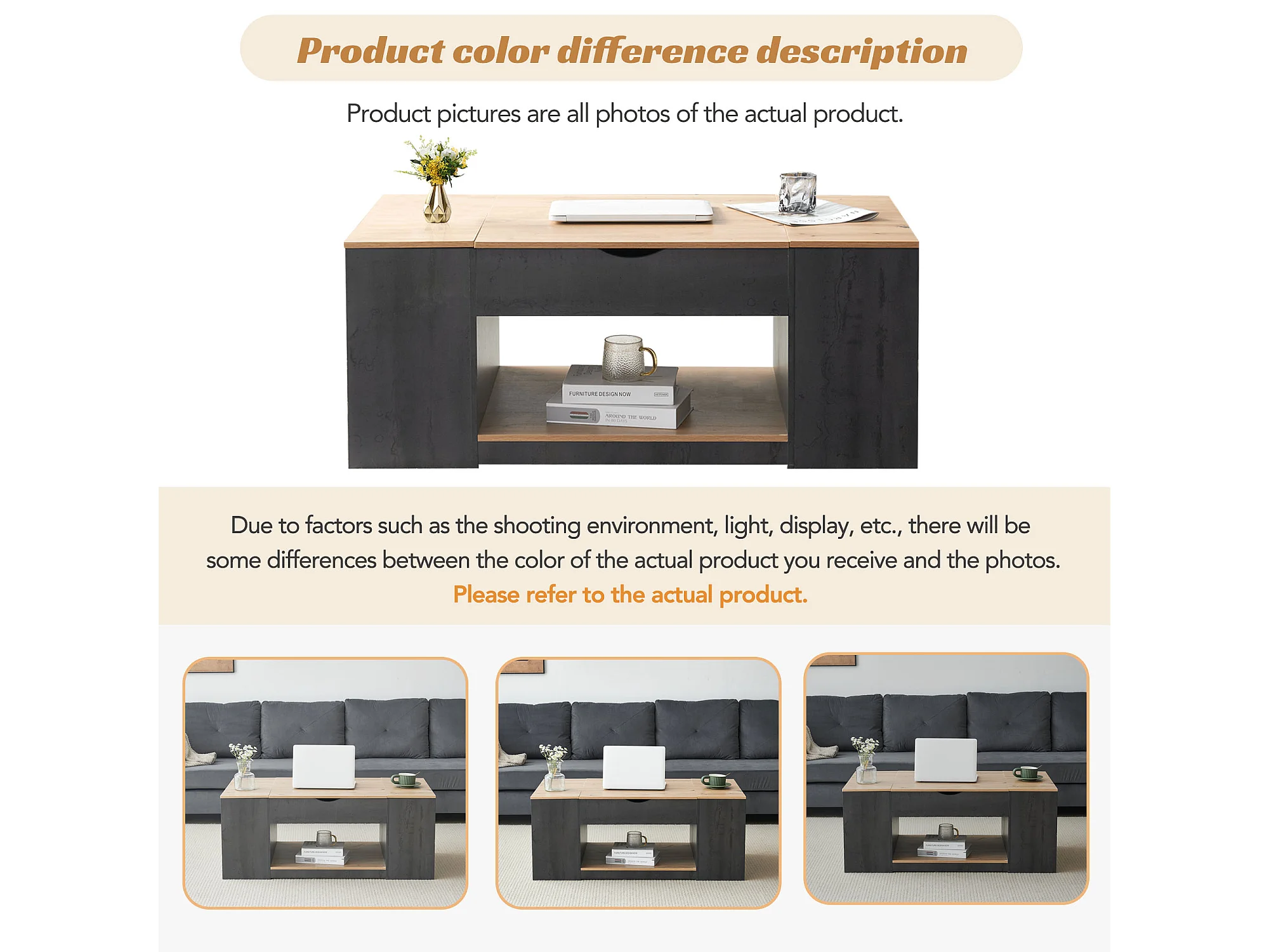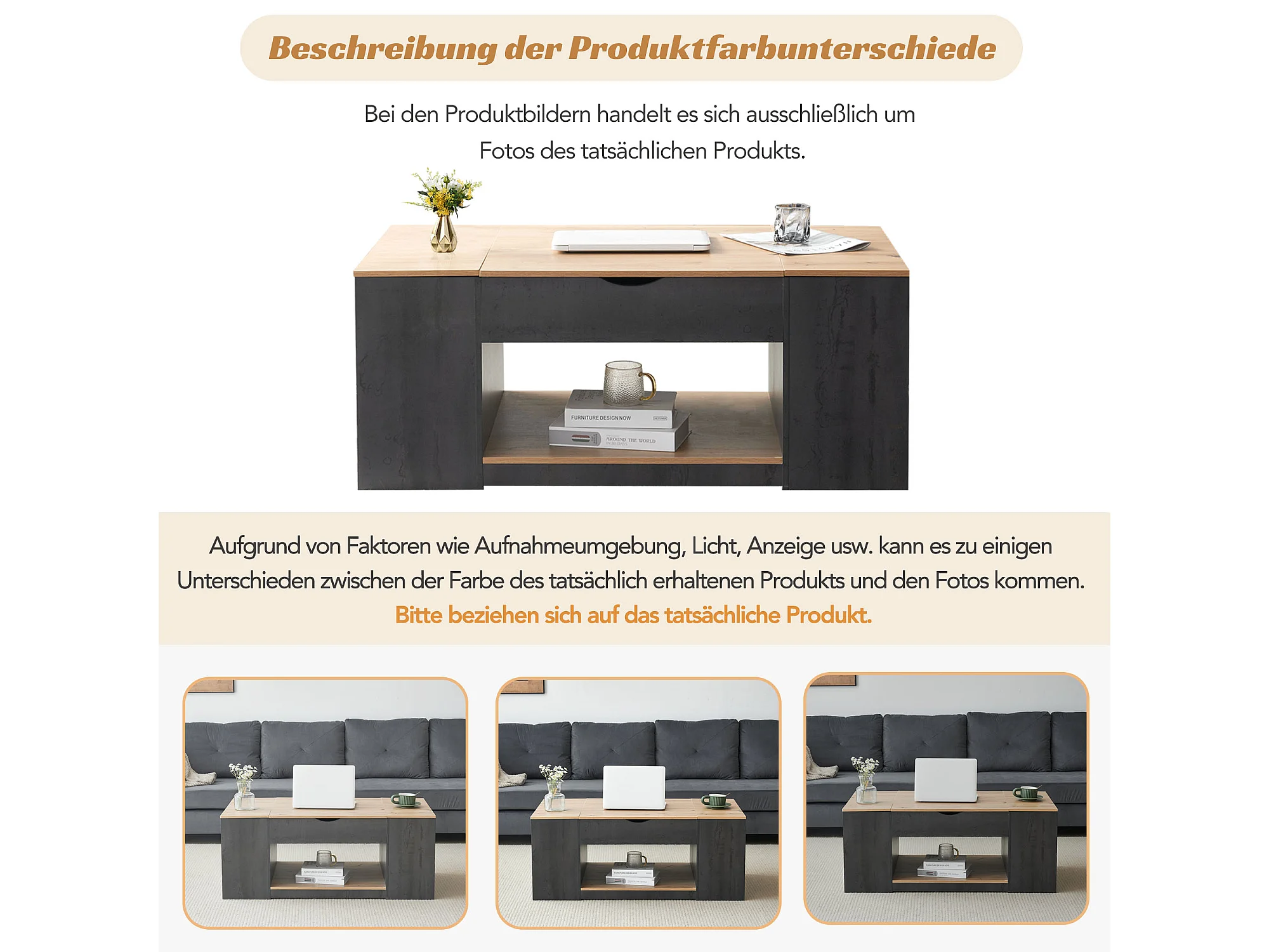 Table basse avec fonction élévatrice, design moderne, structure grise, MDF, couleur gris + bois (109.5x59.7x43 cm)
