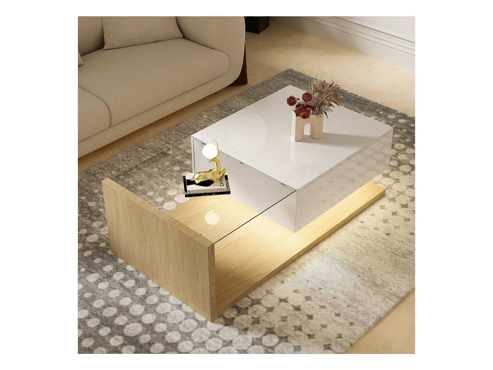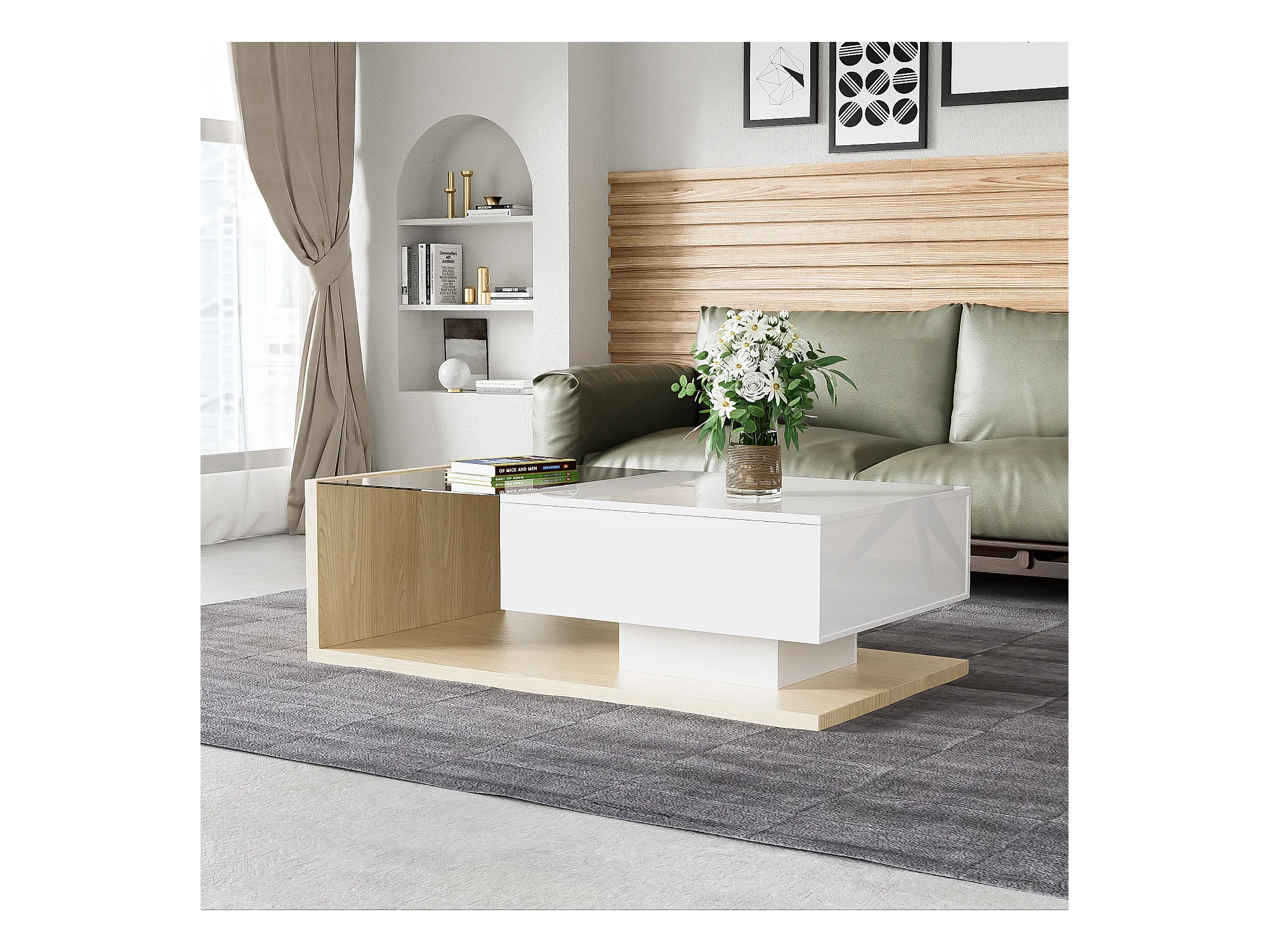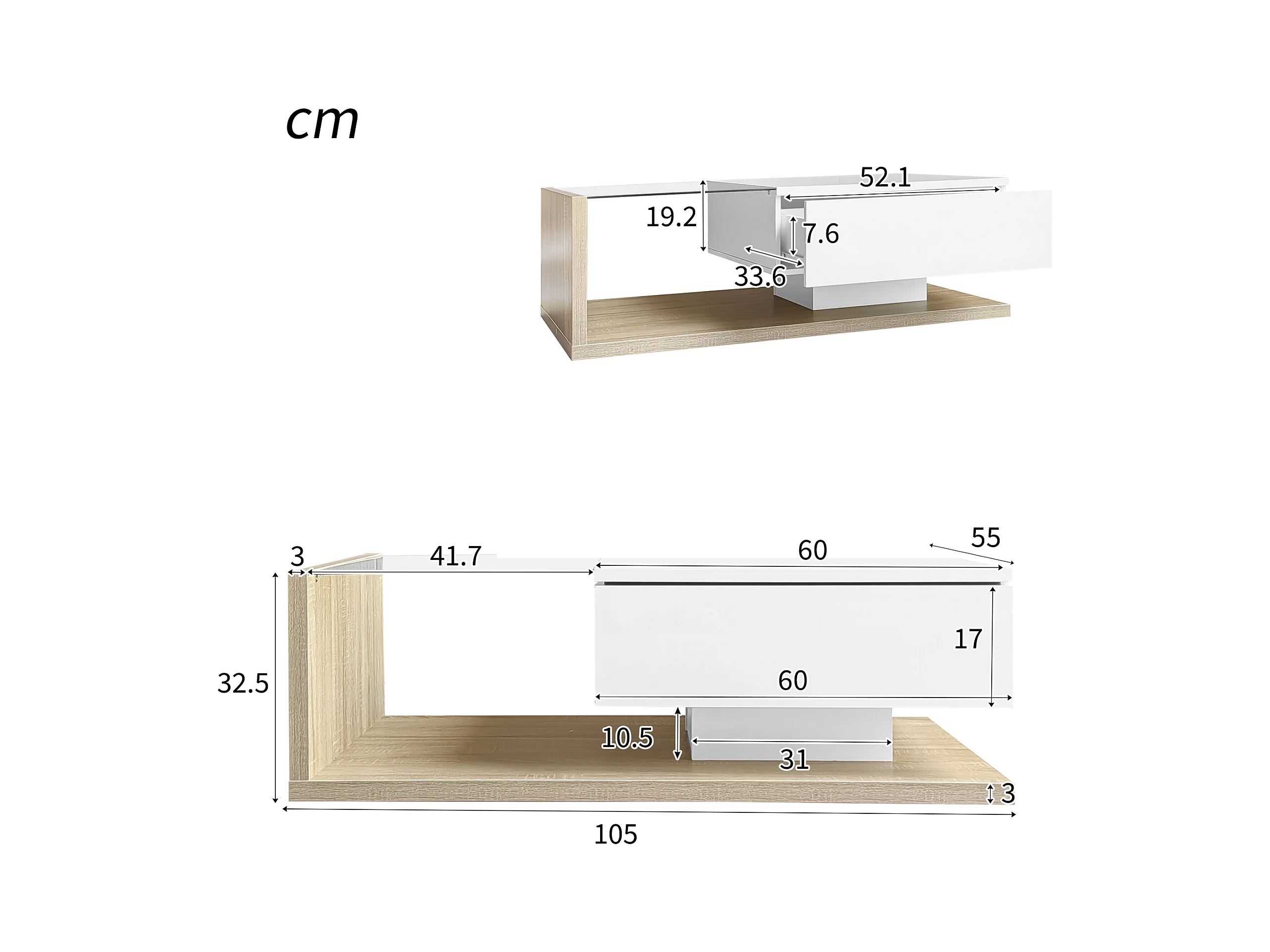 Table basse avec un tiroir et étagères - LEDs - 105x55x32,5cm - Panneaux de particules - Blanc brillant et bois
