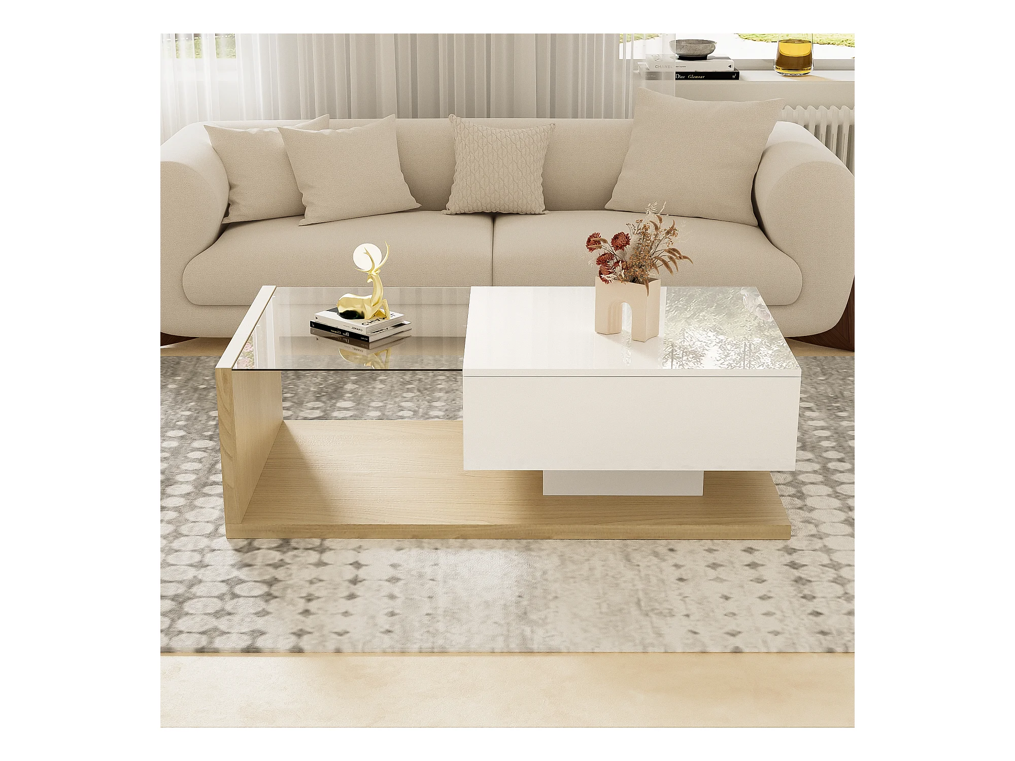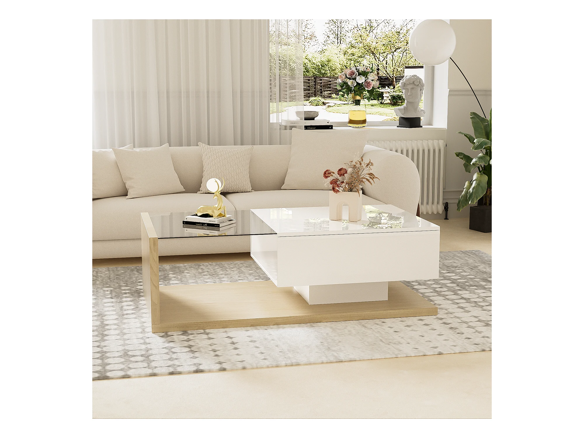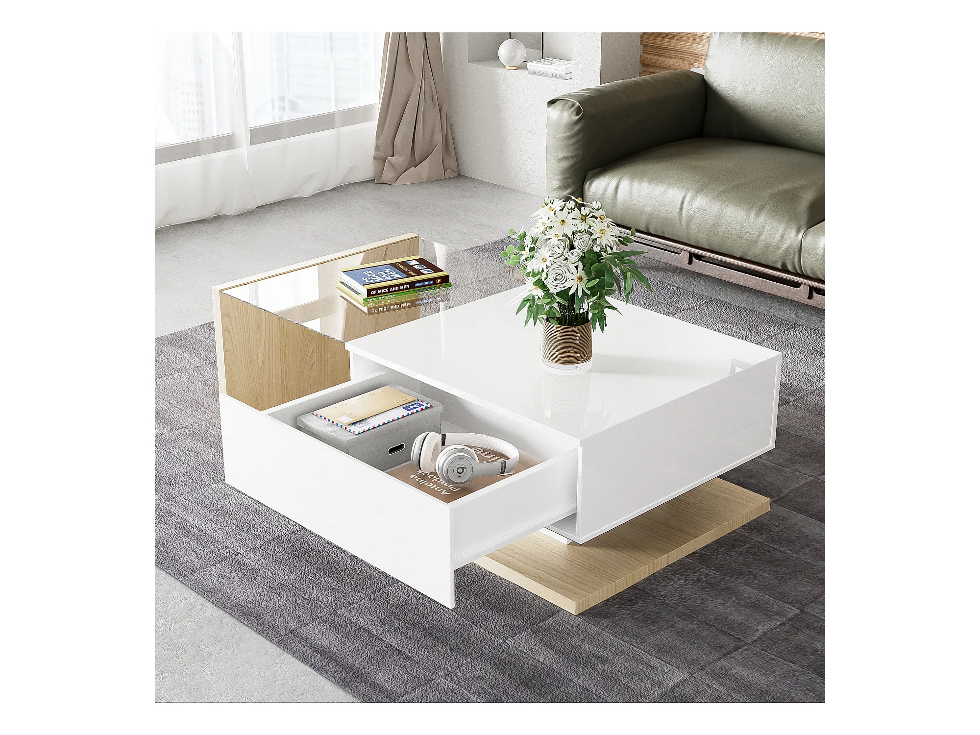 Table basse avec un tiroir et étagères - LEDs - 105x55x32,5cm - Panneaux de particules - Blanc brillant et bois