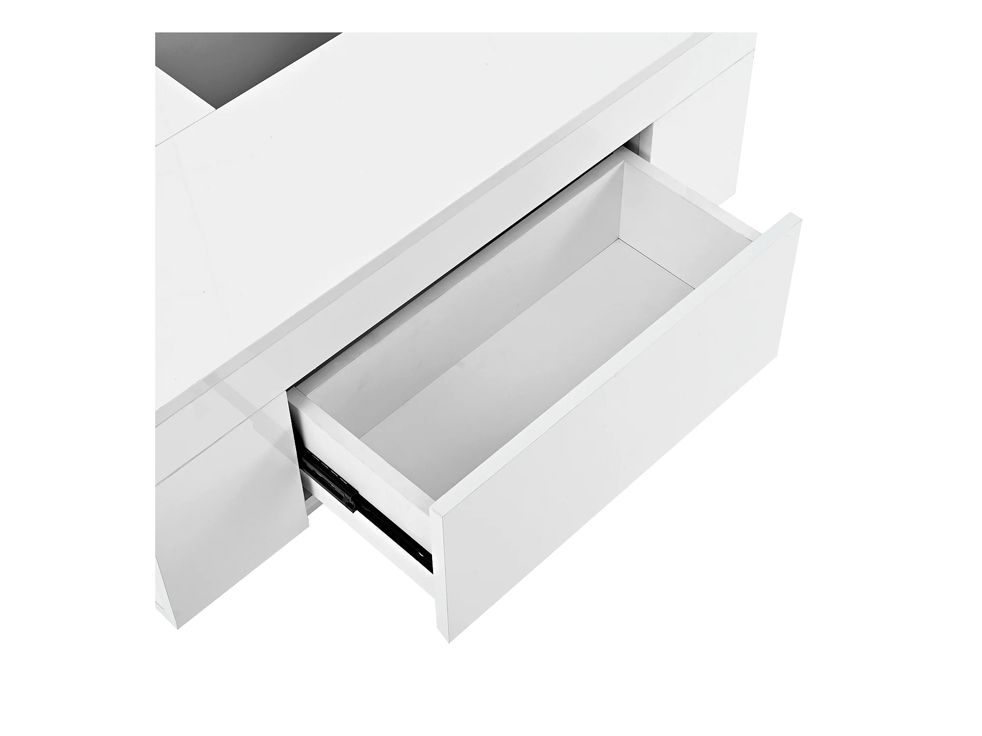 Table basse blanche avec 2 tiroirs de rangement, panneaux latéraux en verre et éclairage LED