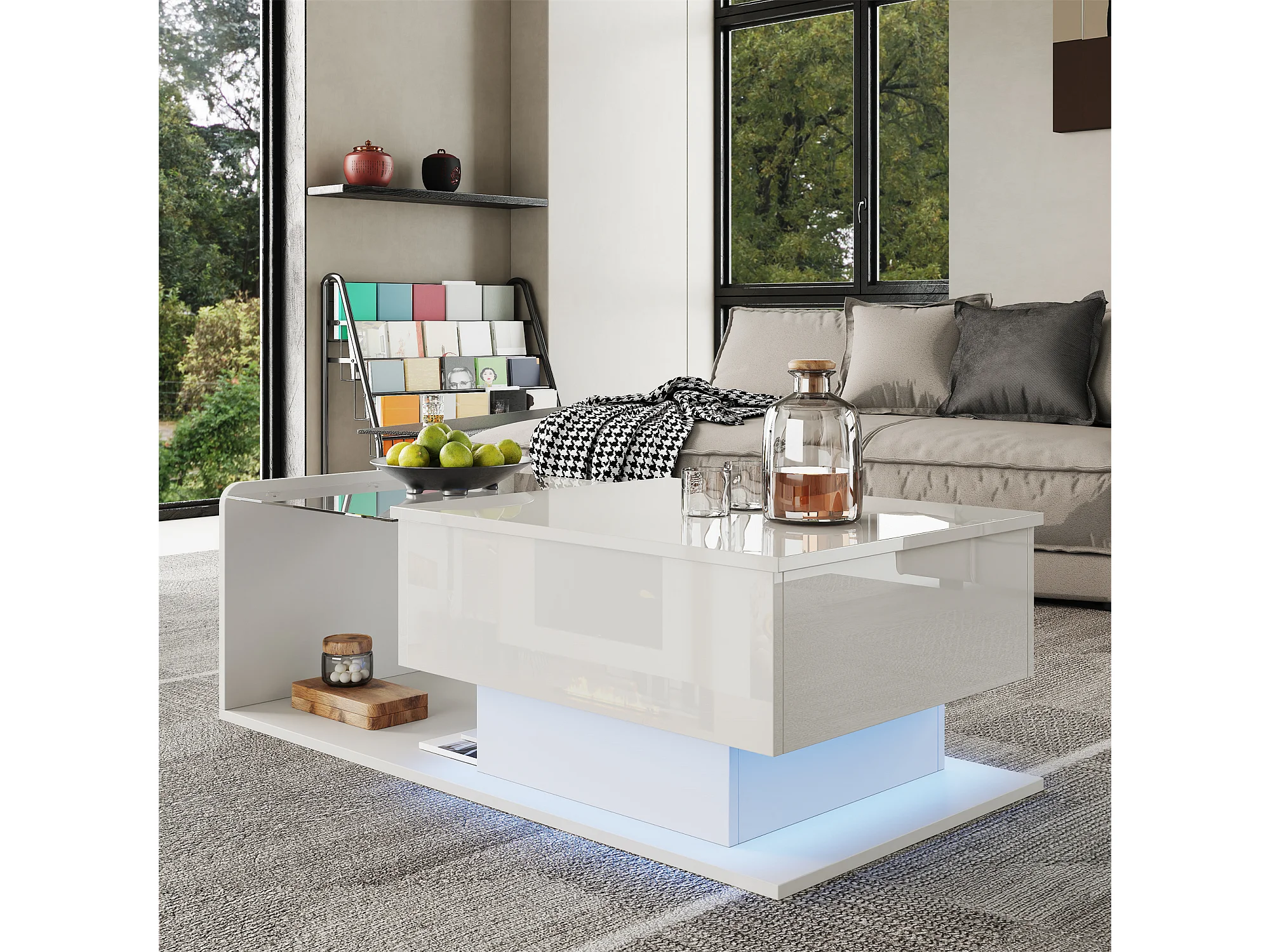 Table basse brillante - 100 x 50 x 33/47.5 cm - vec plateau en verre + Leds + rangement - aggloméré - blanc