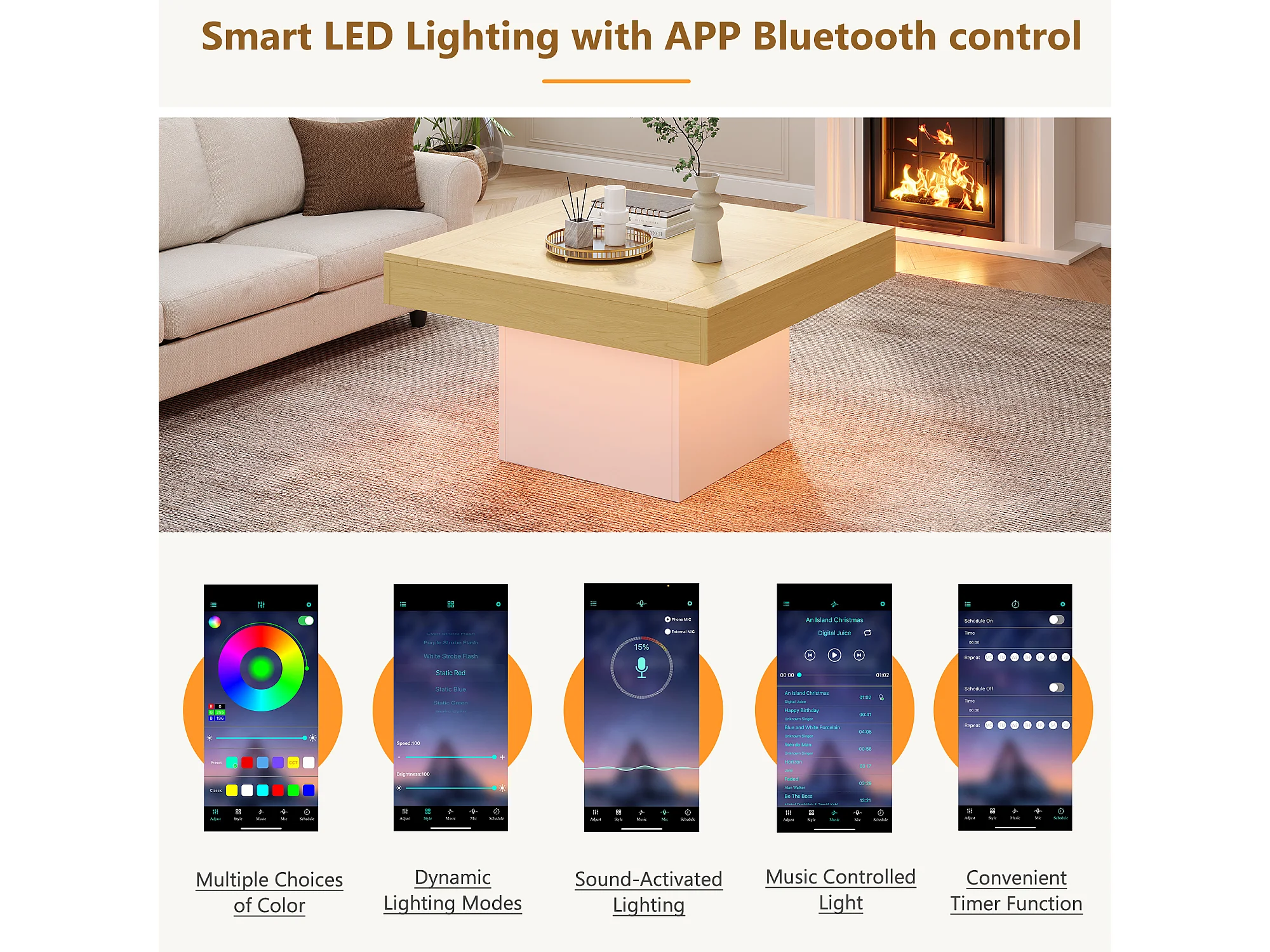 Table basse carrée - 70 x 70 x 40 cm - LEDs - Panneaux de particules - Blanc + Chêne clair