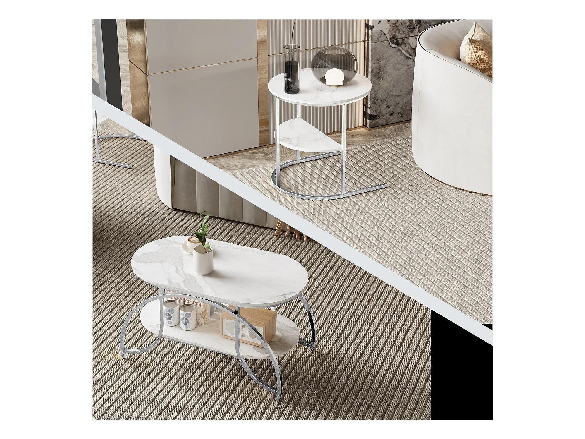 Table basse carrée en marbre blanc avec structure en métal argenté - design moderne, stable et polyvalent