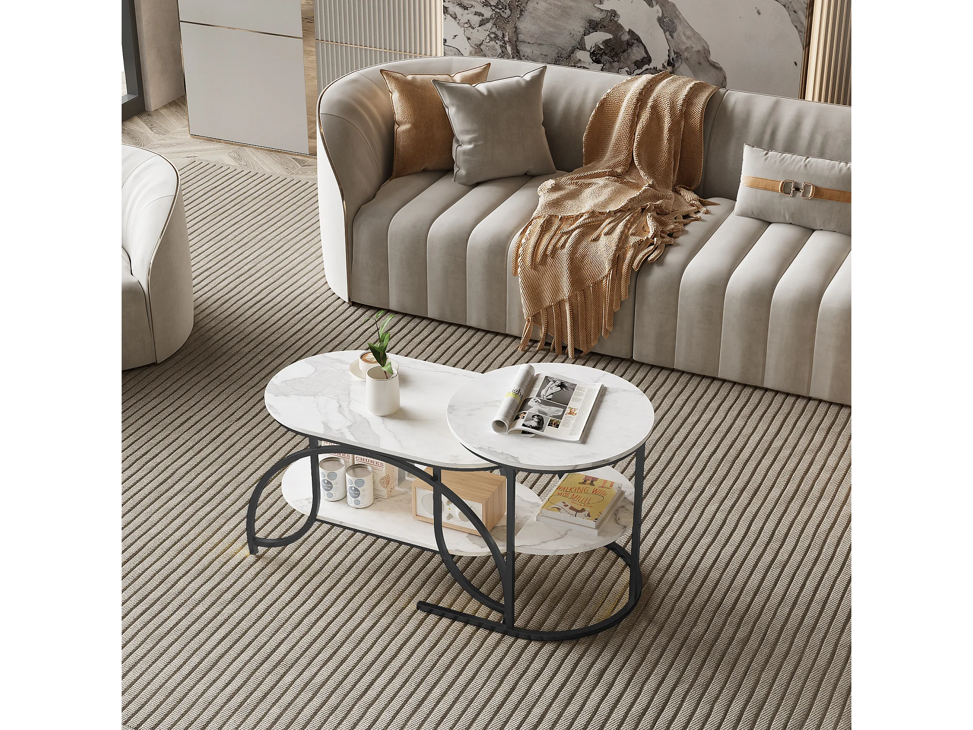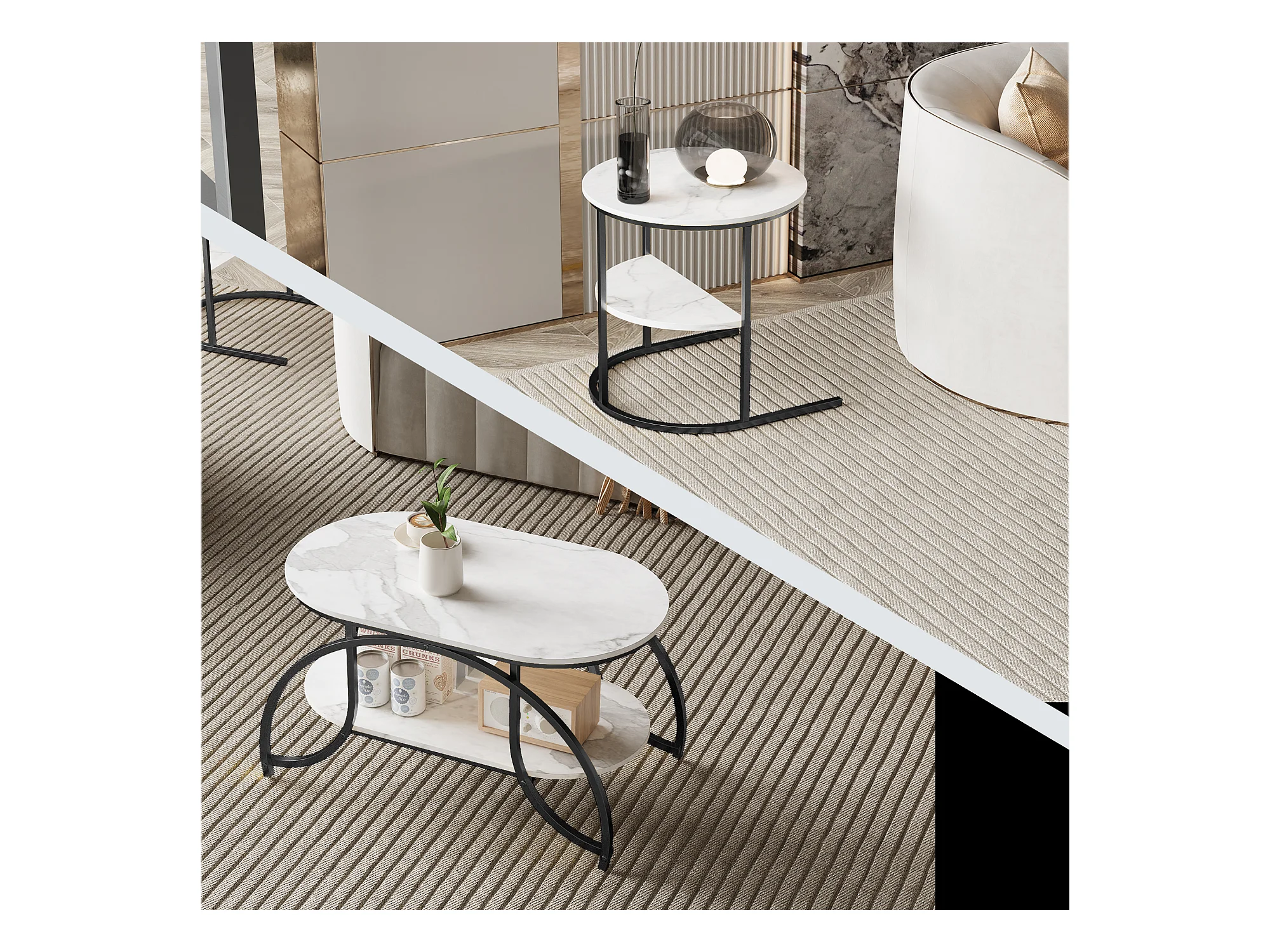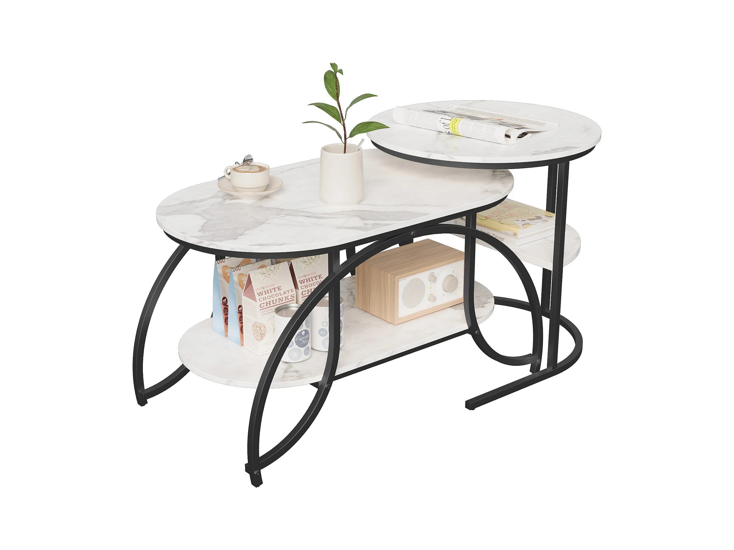 Tables basses gigognes carrées en marbre blanc avec cadres noirs - Ensemble moderne deux pièces