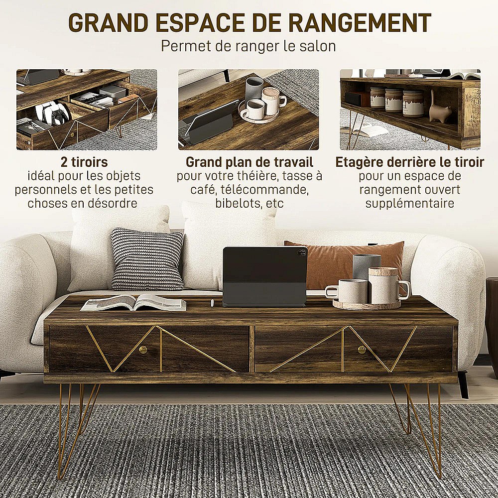 Table basse salon table de salon rectangulaire vaste plateau 2 tiroir pieds fuselés marron