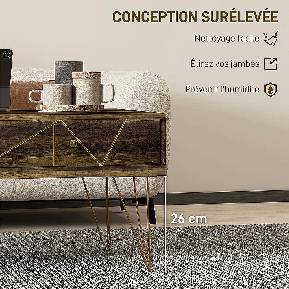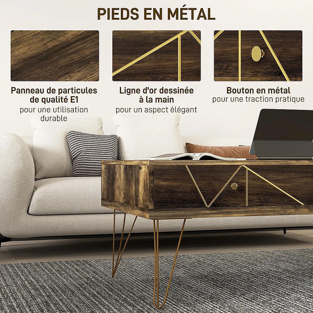 Table basse en bois grand plateau et 2 tiroirs design de luxe Élégant décoration avec lignes dorées peintes à la main brun