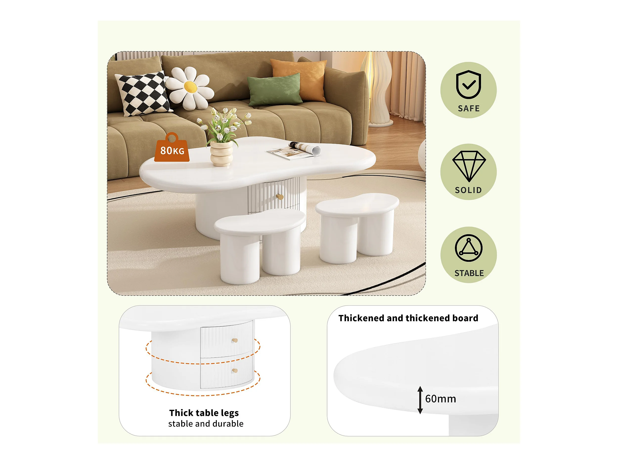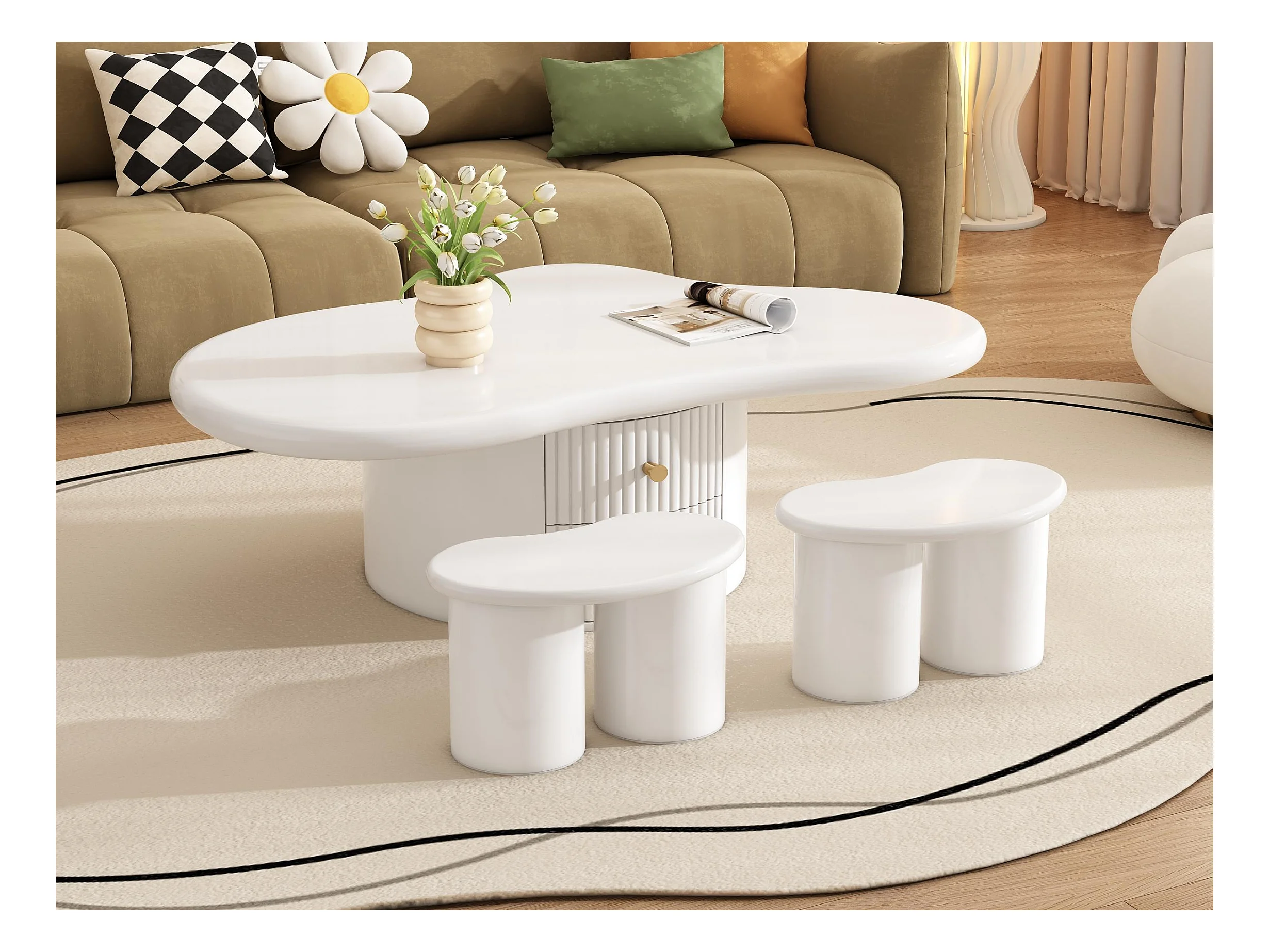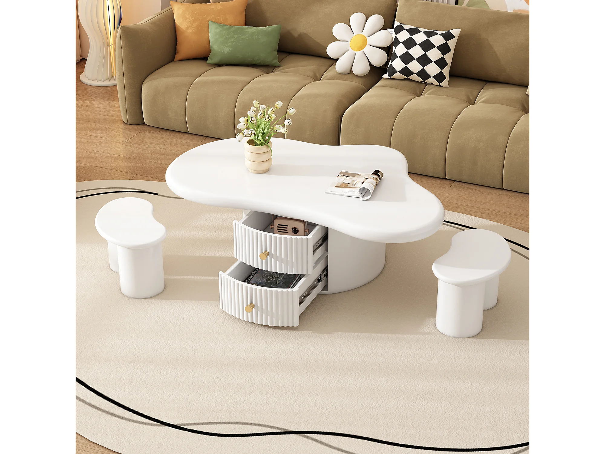 Table basse en MDF - avec 2 tiroirs et 2 tabourets - Blanc