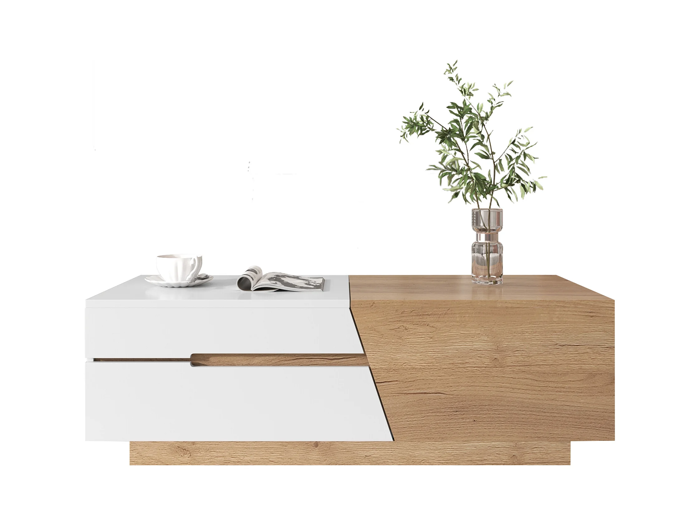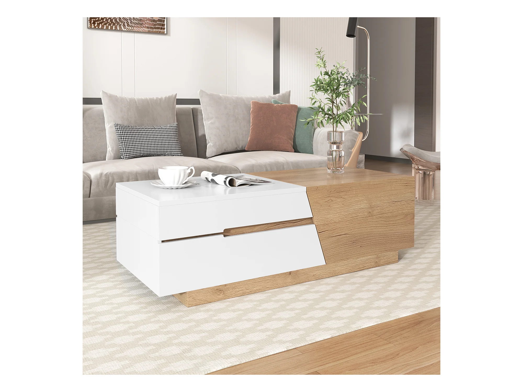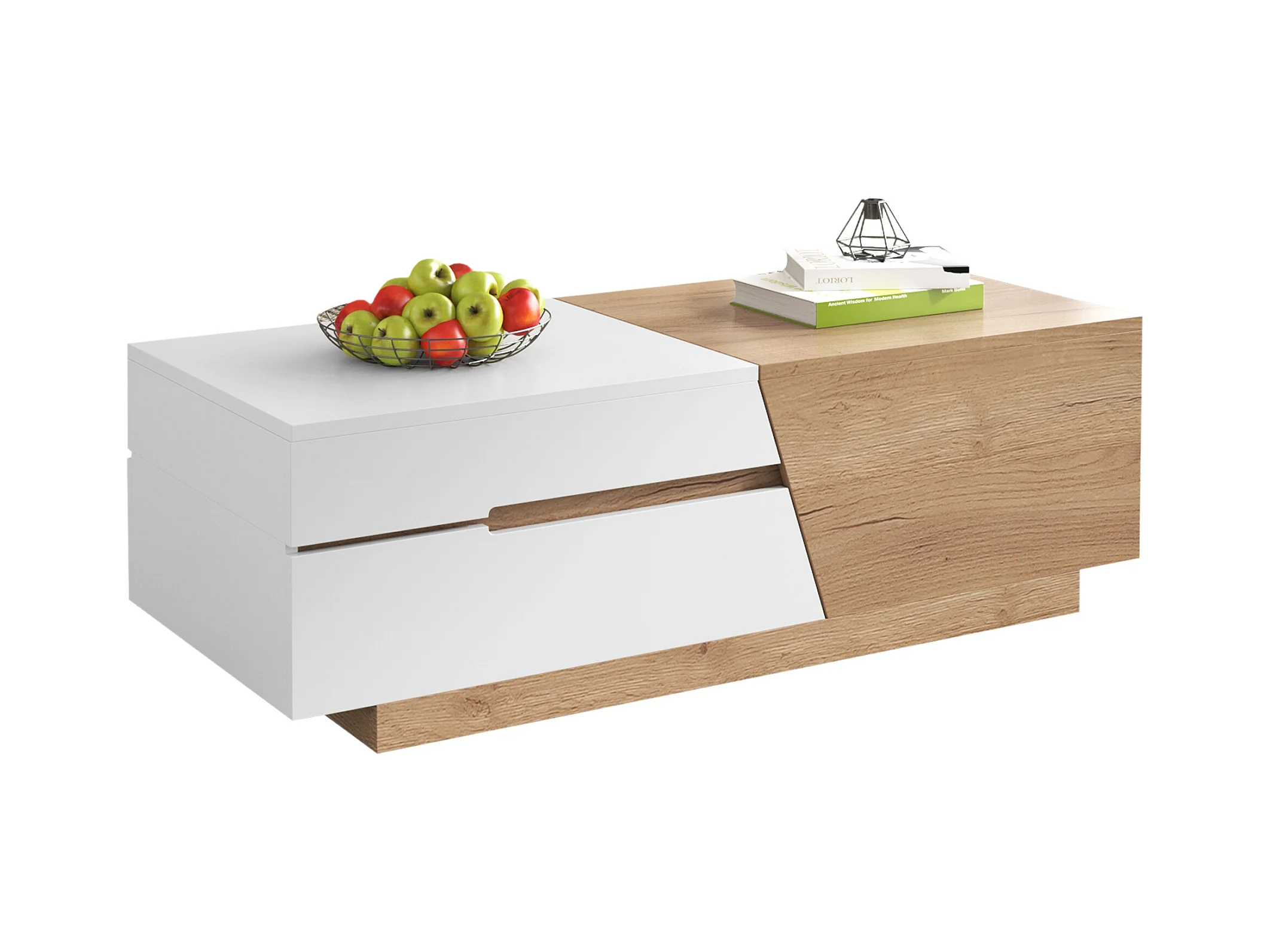 Table basse extensible avec 2 tiroirs - 120 x 50 x 37.5 cm - Panneaux de particules - Blanc + naturel