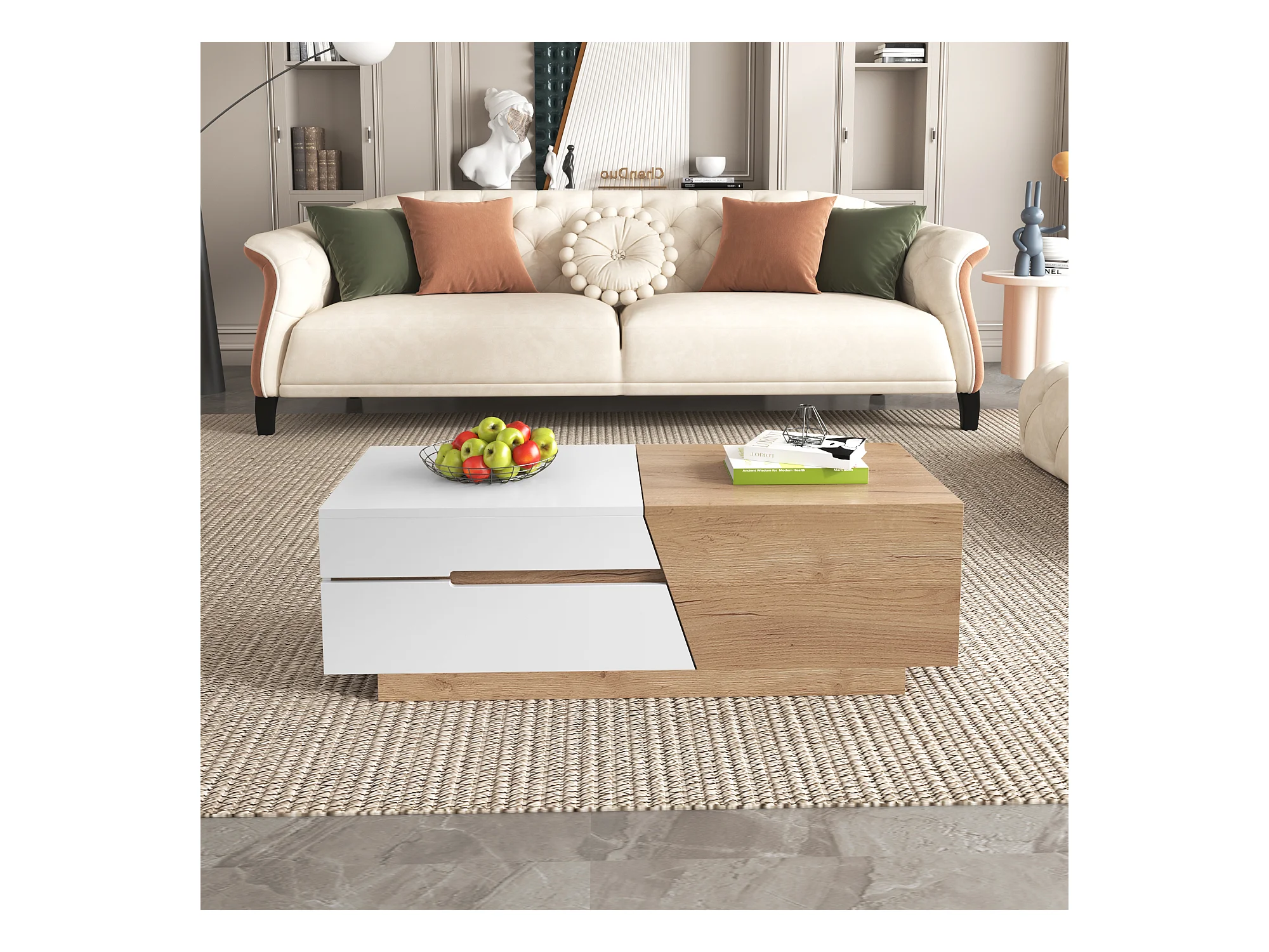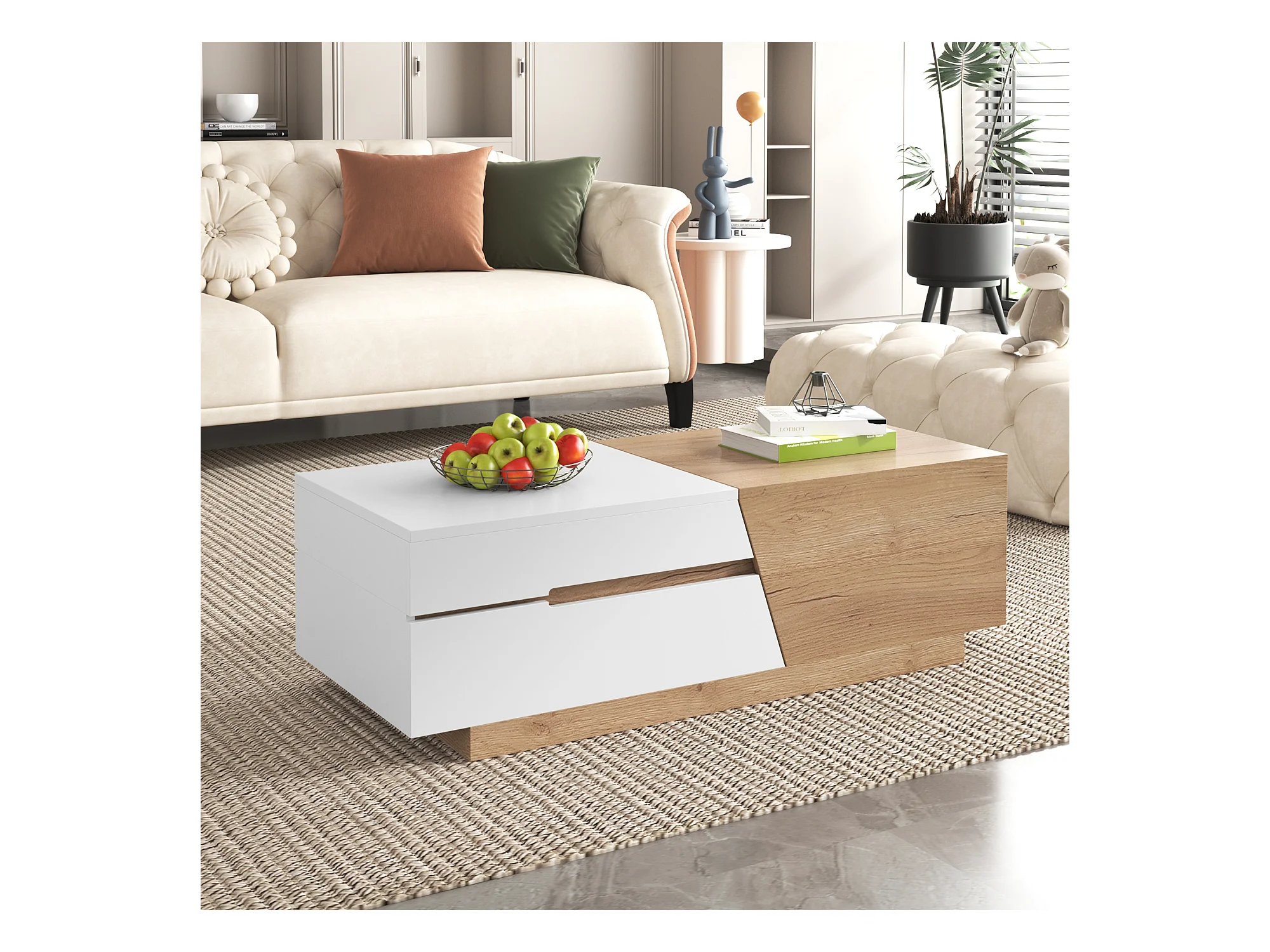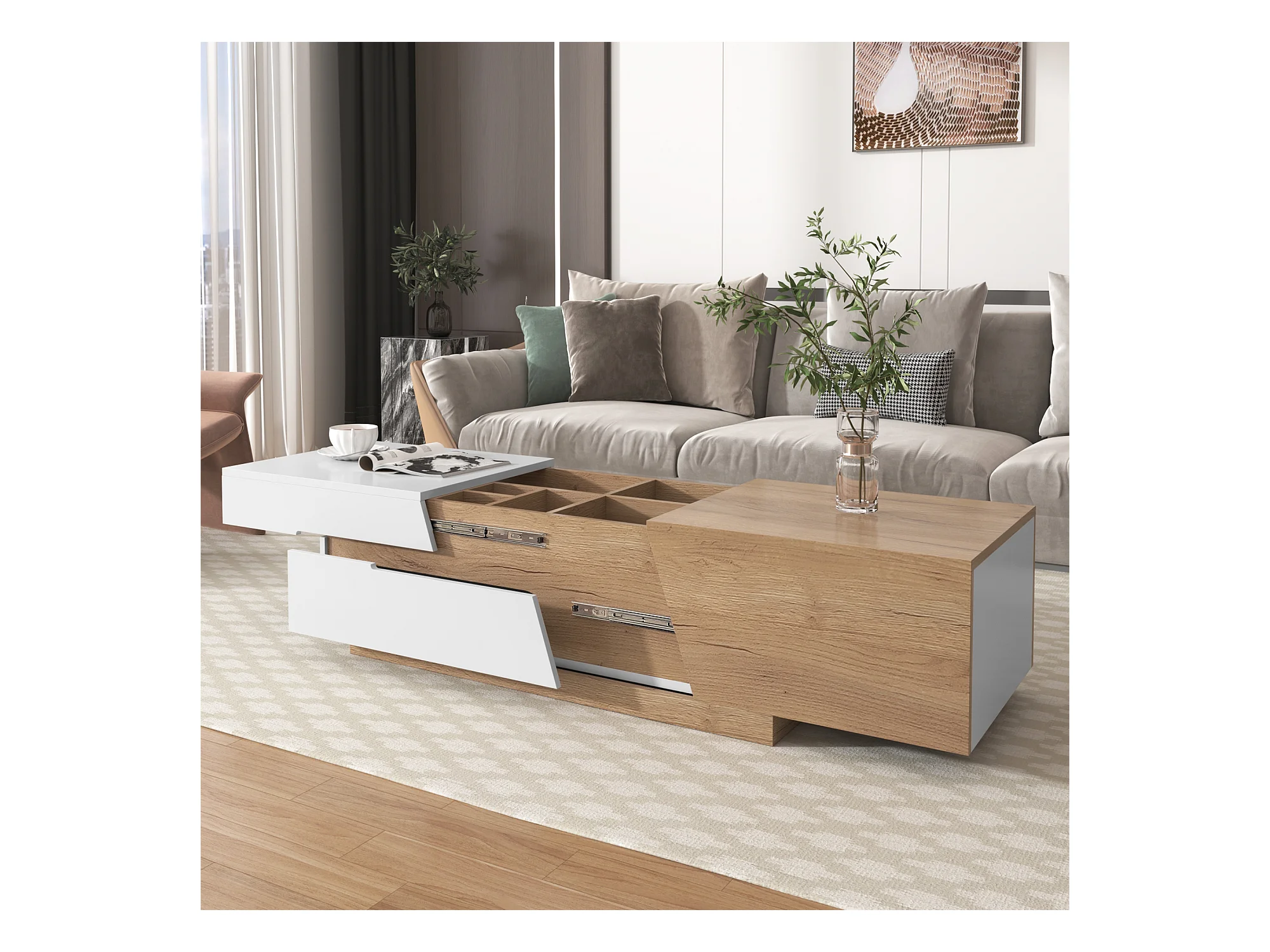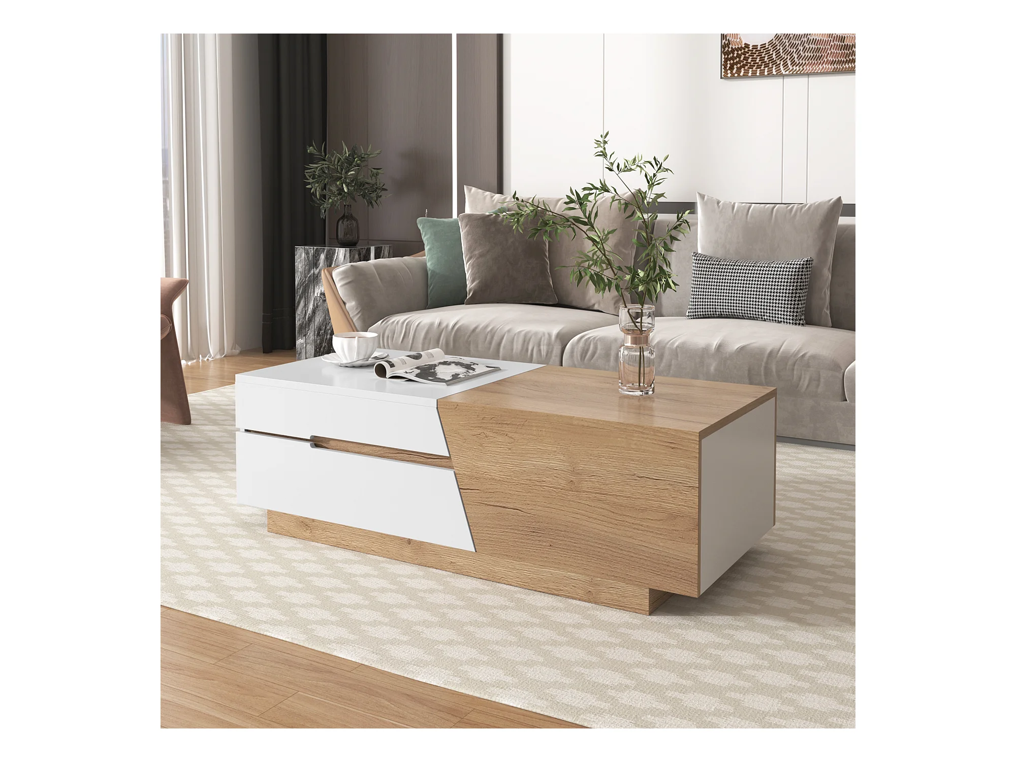 Table basse extensible avec 2 tiroirs - 120 x 50 x 37.5 cm - Panneaux de particules - Blanc + naturel