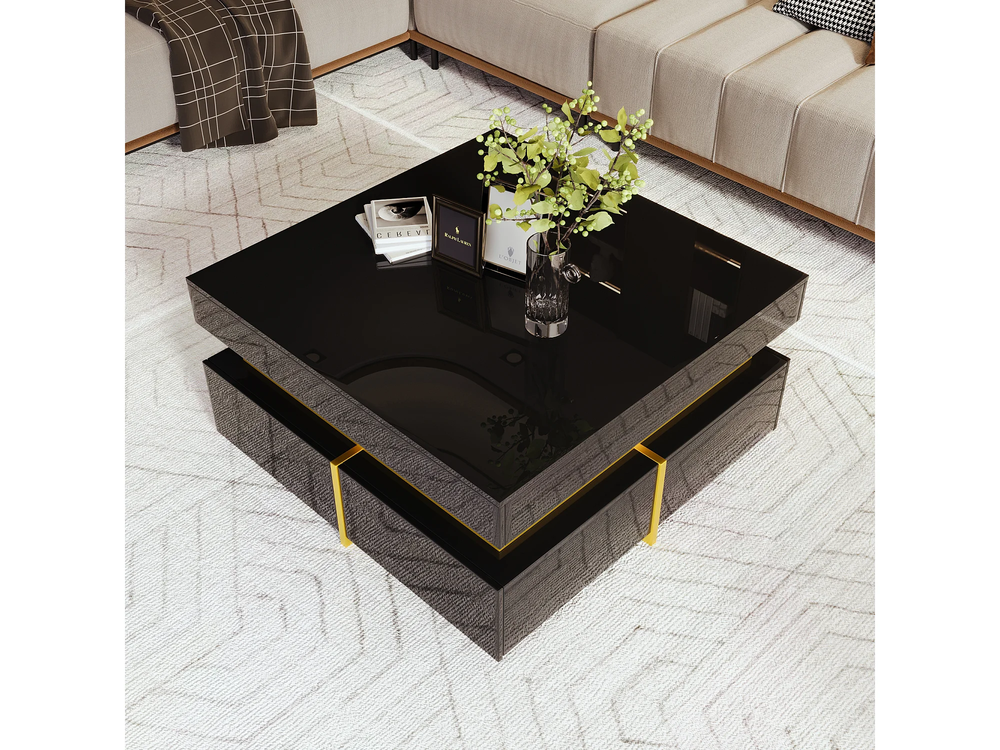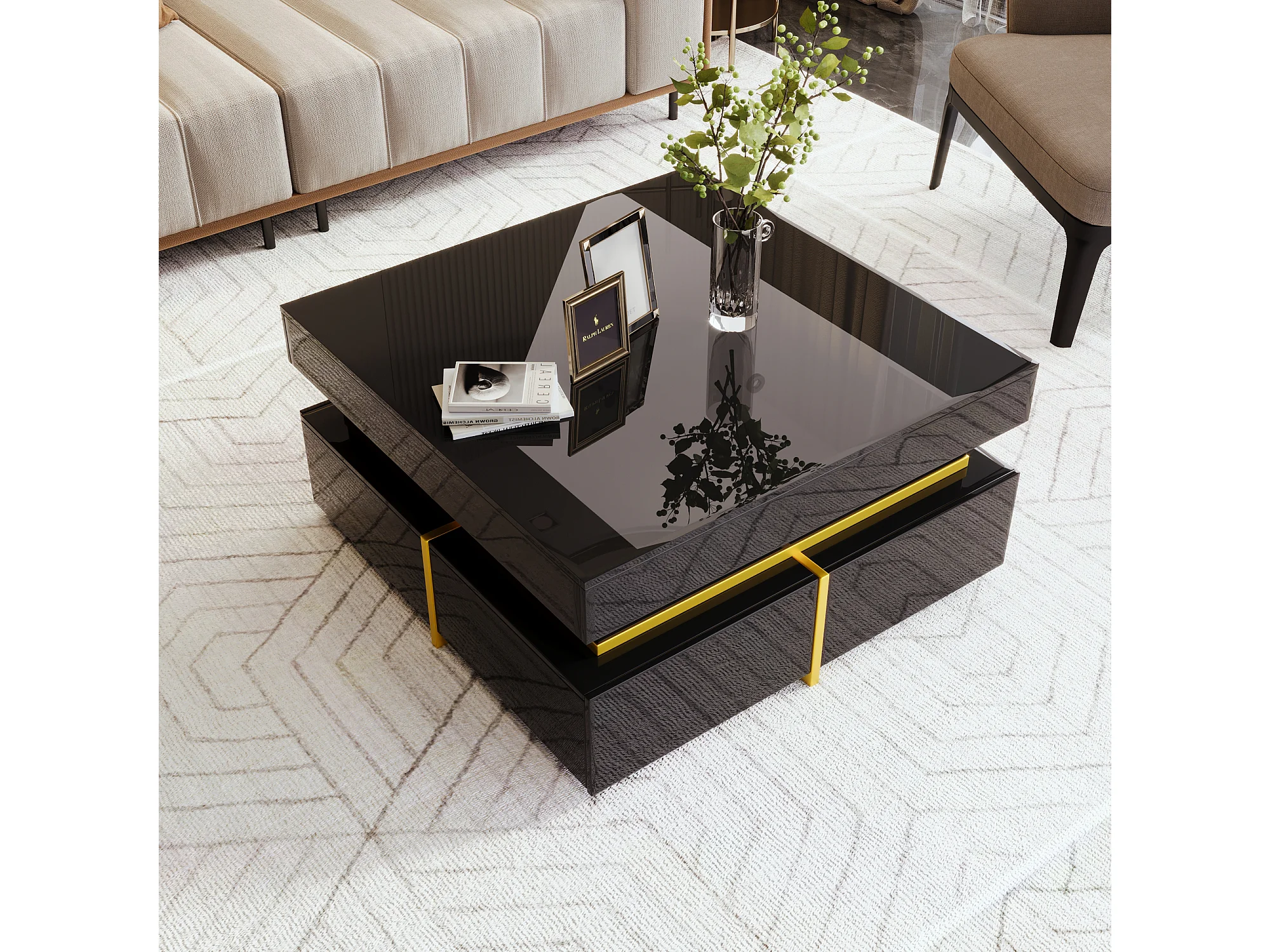 Table Basse Hautement Brillante avec Accents Dorés, Table de Salon avec Deux Tiroirs – Design Élégant et Pratique