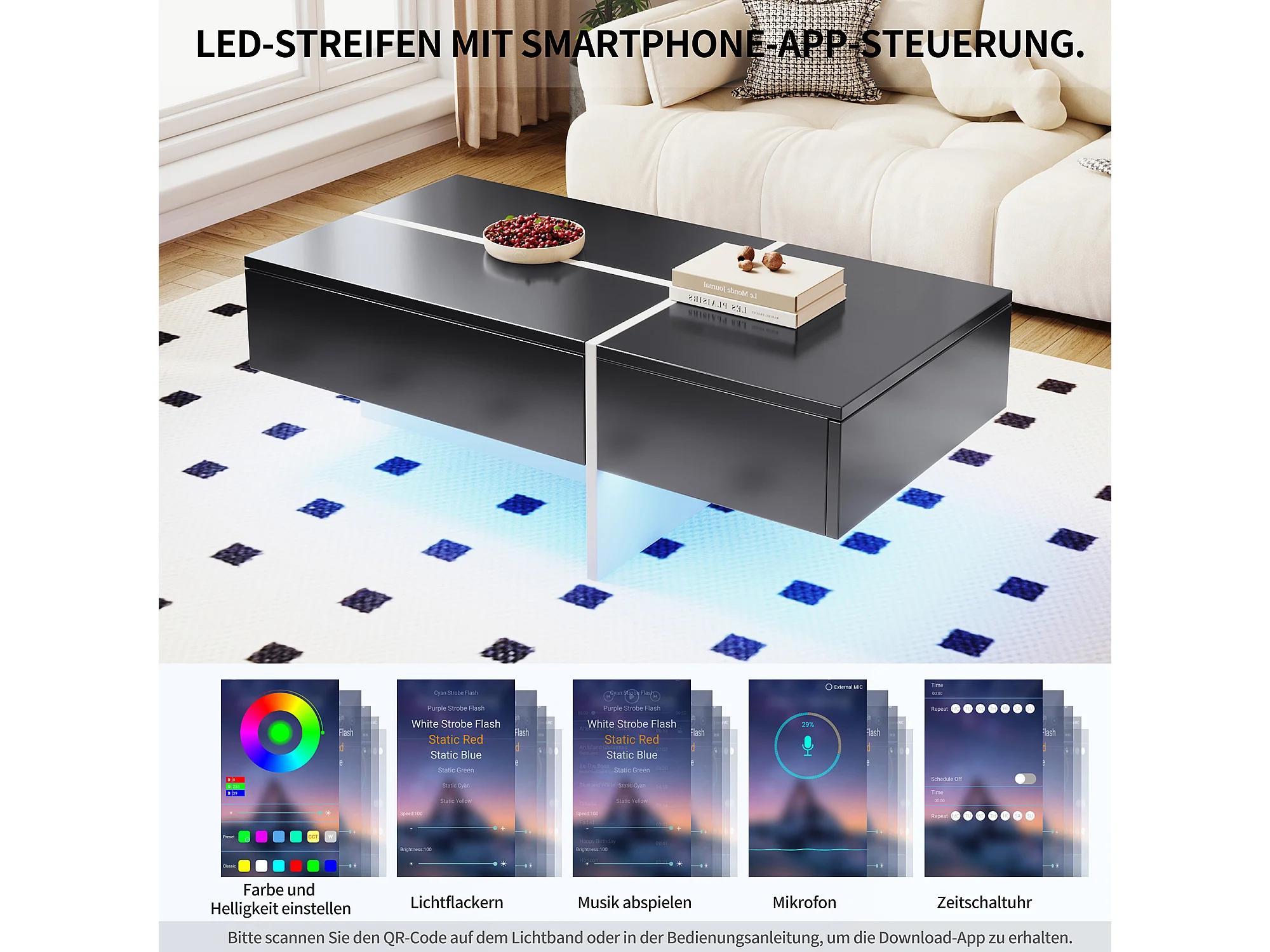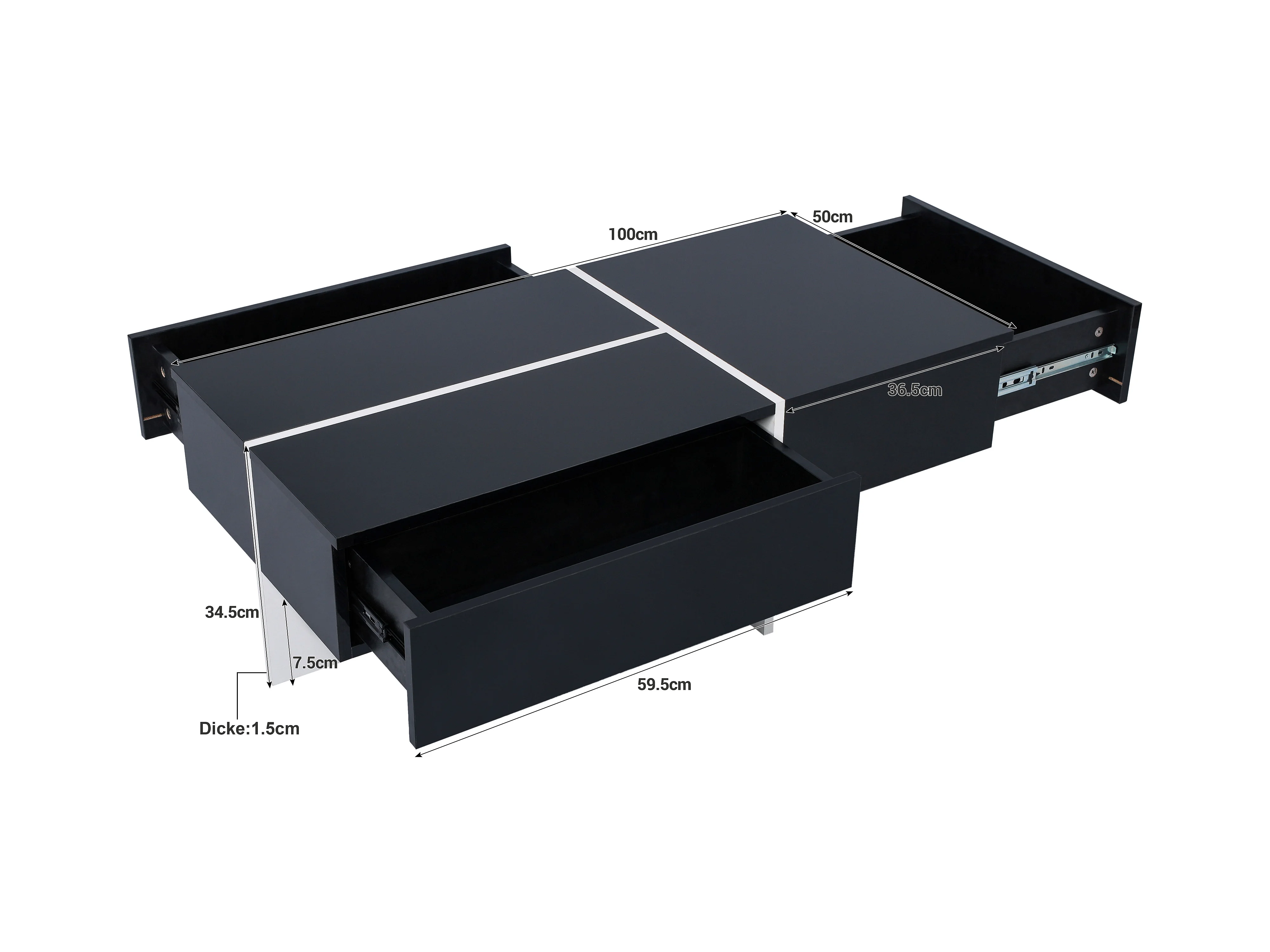 Table basse hautement brillante avec bande LED, structure colorblock noir et blanc, avec 4 tiroirs de rangement (100x50x34.5 cm)
