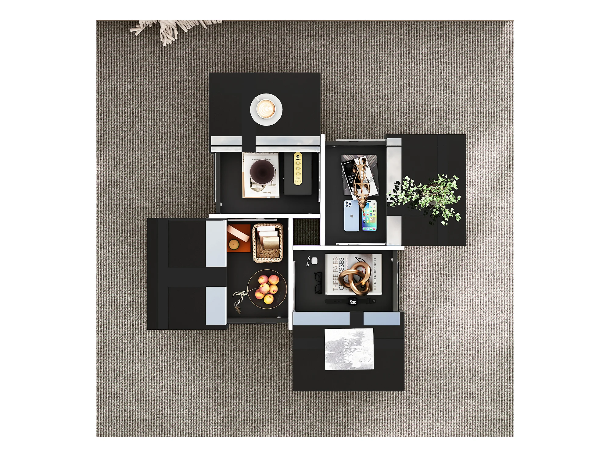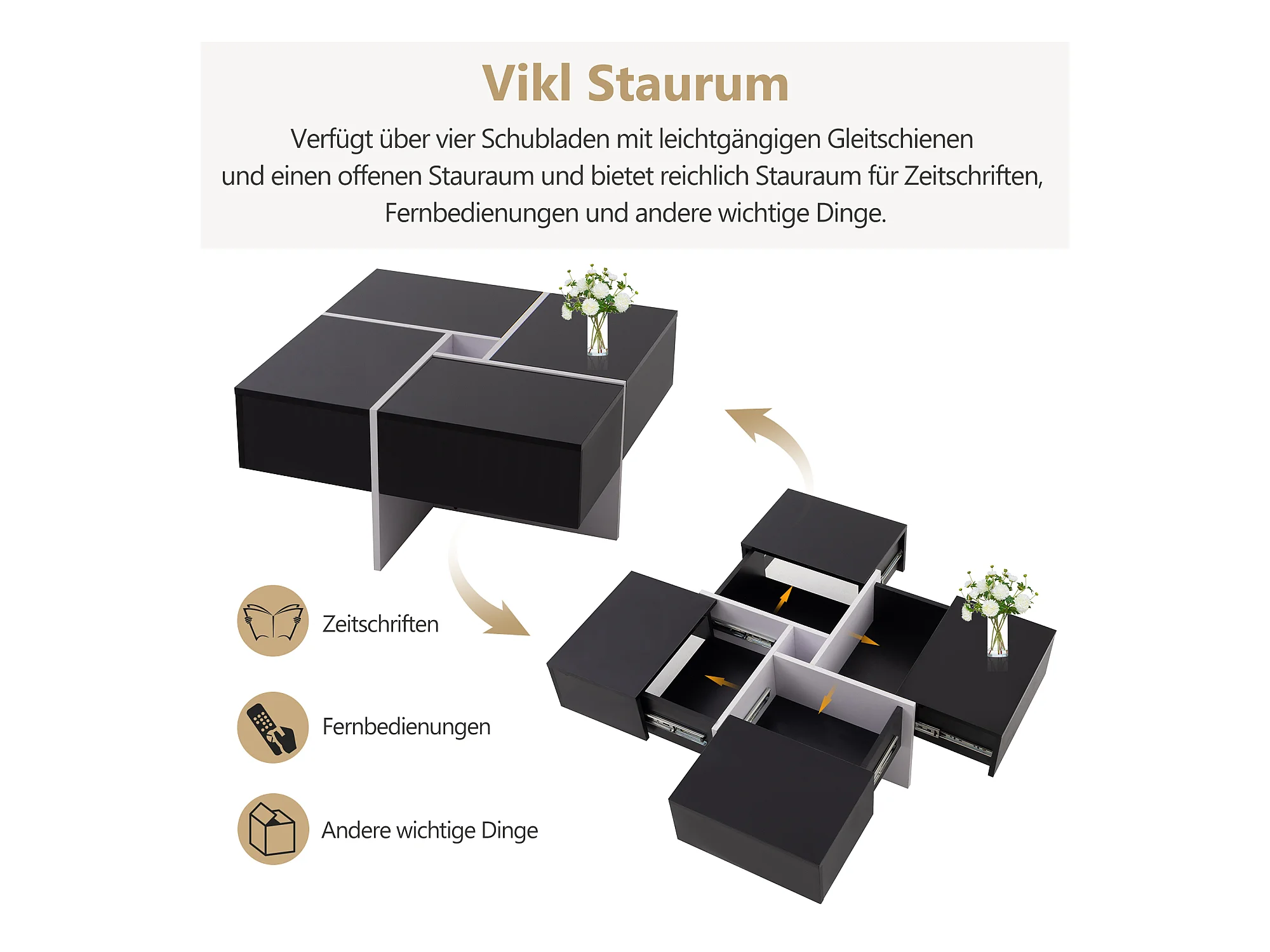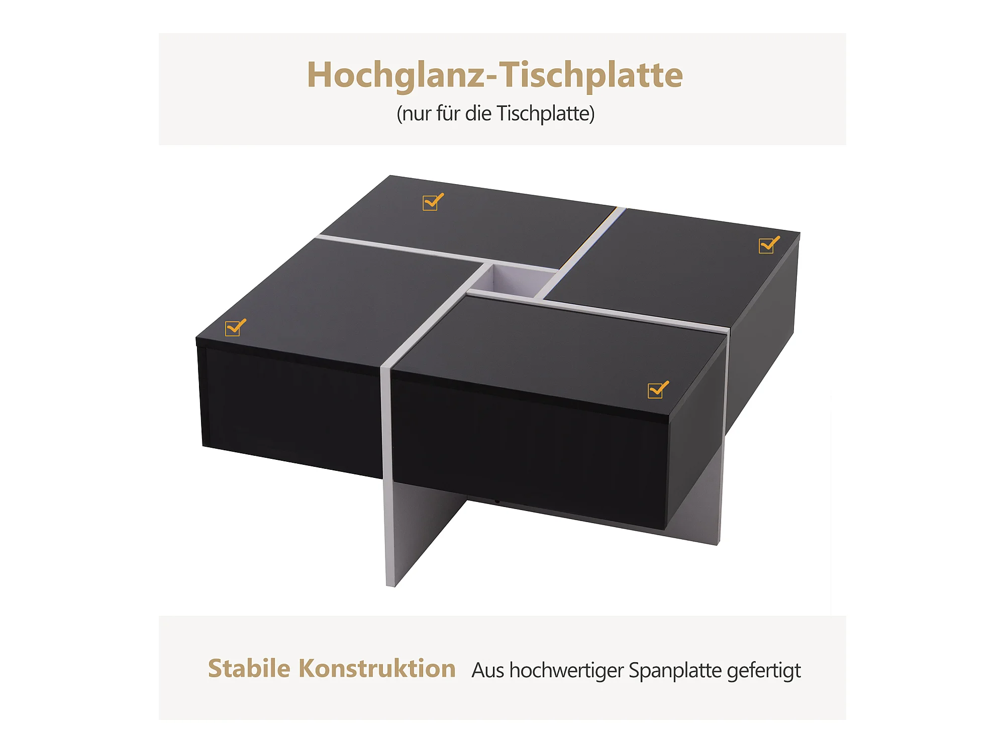Table basse laquée élégante avec 4 tiroirs et compartiment central, panneau de particules, noir et blanc (70x70x35cm)