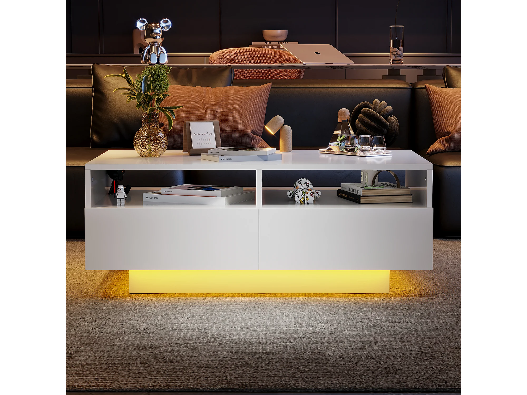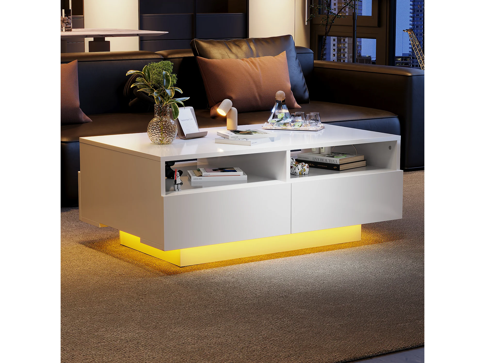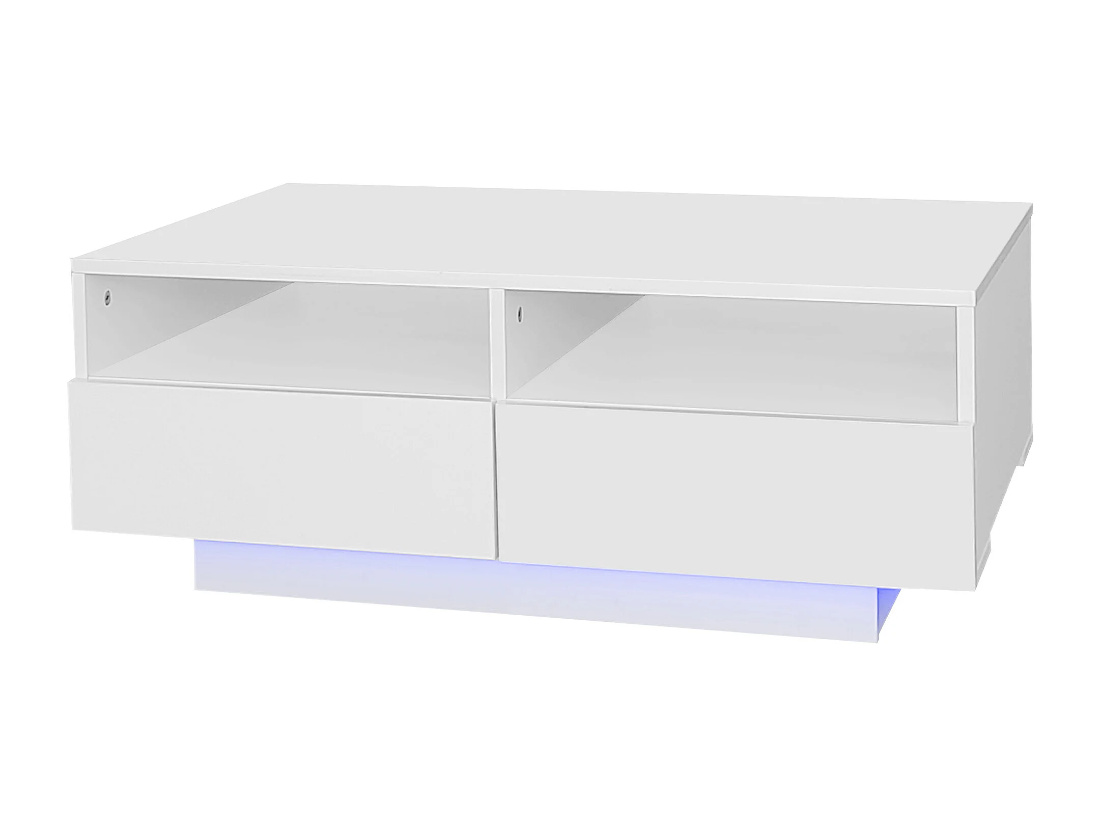 Table basse LED avec 4 tiroirs, design moderne, blanc, (90x55x35 cm)