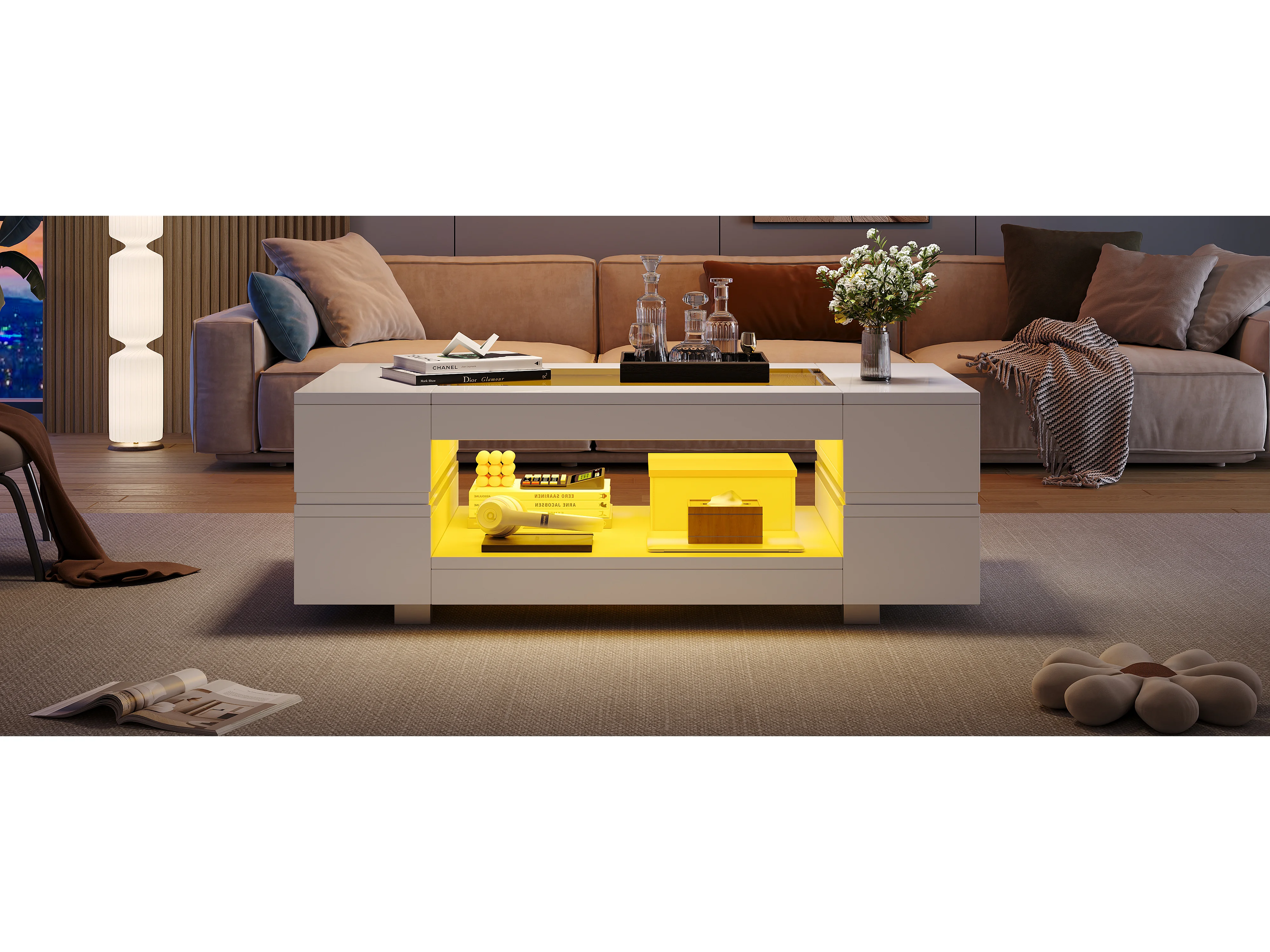 Table Basse LED avec Contrôle App Bluetooth, Design Moderne, Plateau en Panneaux de Particules, Blanc (100x50x35.5 cm)