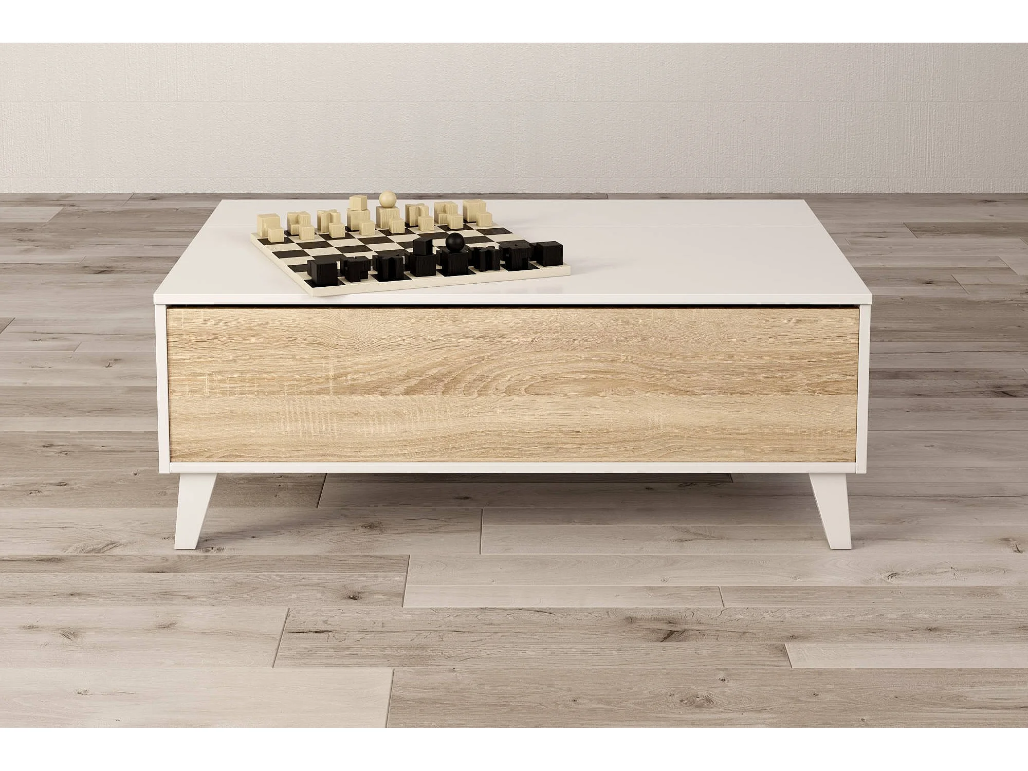 Table basse Lincoln, Table basse avec plateau élévateur, Table basse de salon, 100x68h38 cm, Blanc brillant et chêne