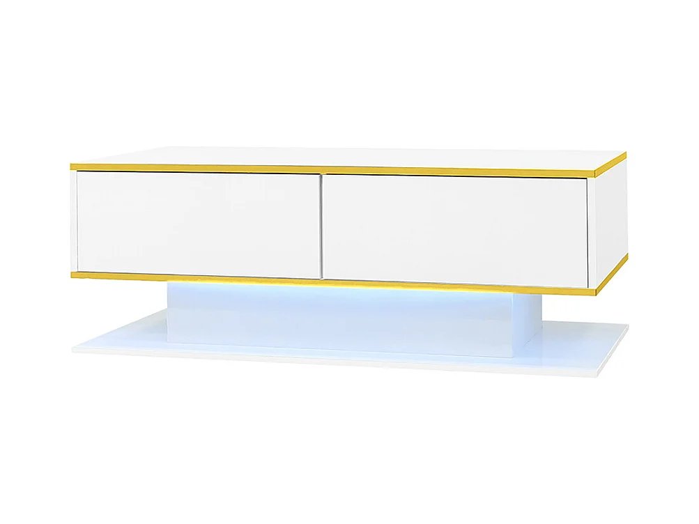 Table basse moderne à LED avec surface brillante ornements dorés trois tiroirs et un compartiment ouvert couleur blanc