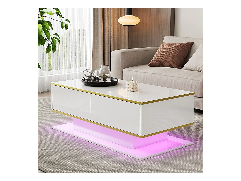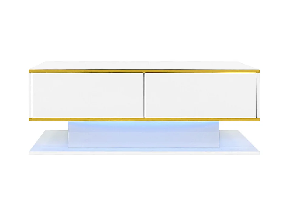 Table basse moderne LED plateau tiroirs ondulé pieds blanc doré 2 tiroirs bande lumineuse couleur variable blanc