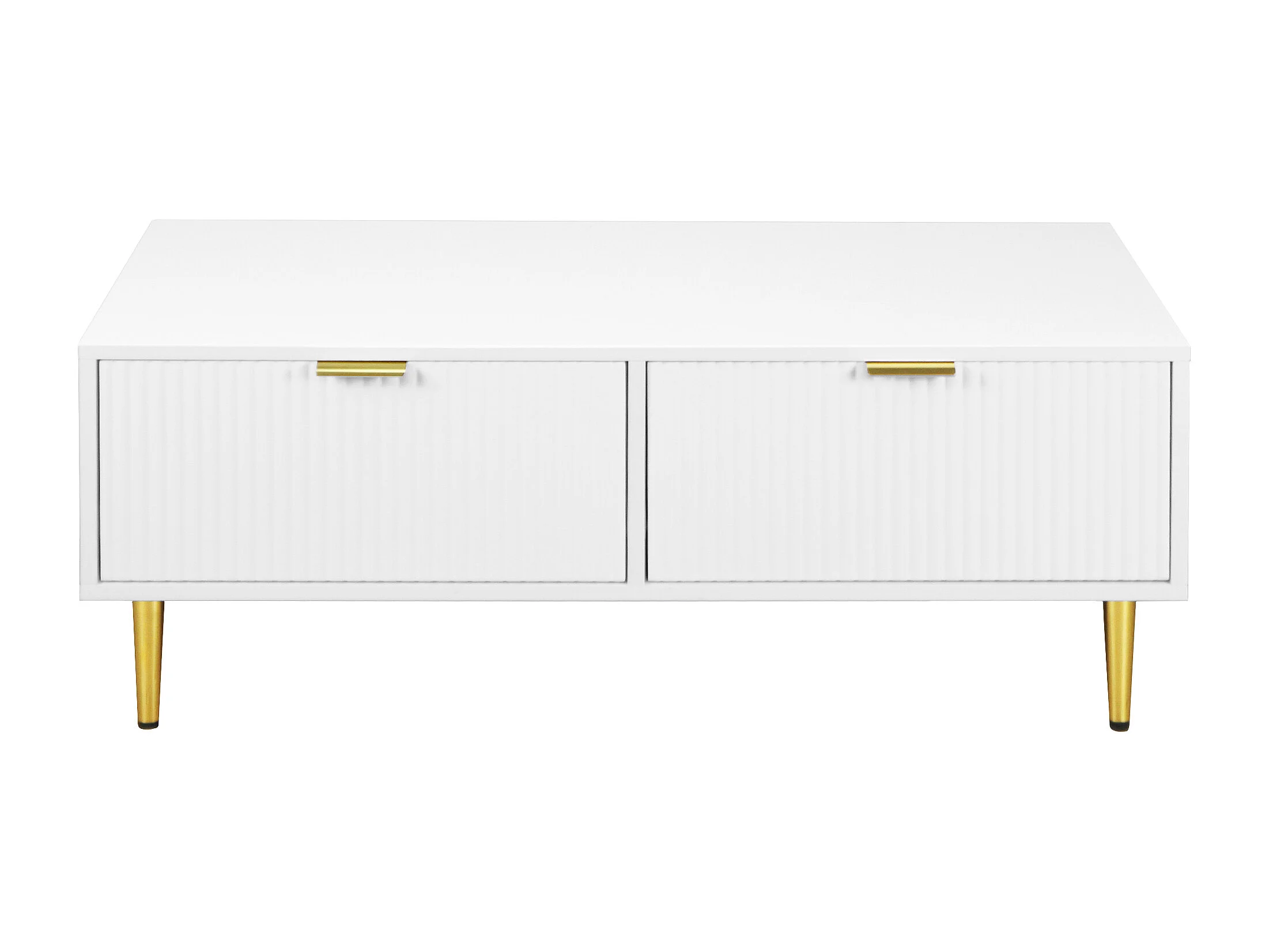 Table basse moderne avec 2 tiroirs, MDF, blanche avec accents dorés (100x50x40cm)