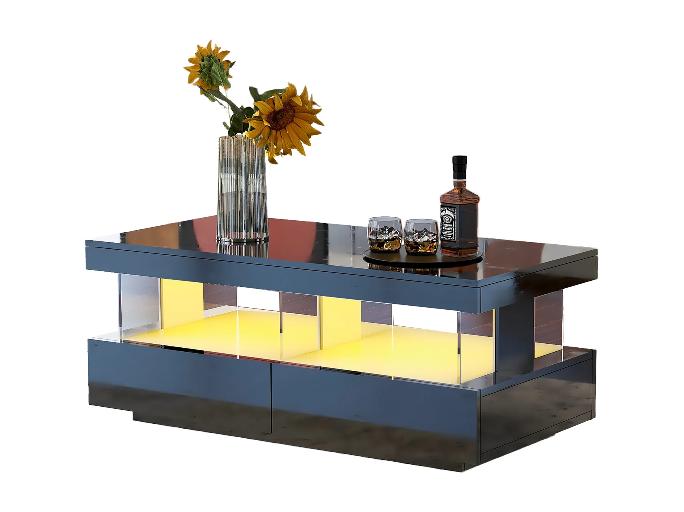Table basse moderne avec éclairage LED, plateau haut brillant, panneaux acryliques et 2 tiroirs, panneau de particules, noir (100x60x49.5cm)
