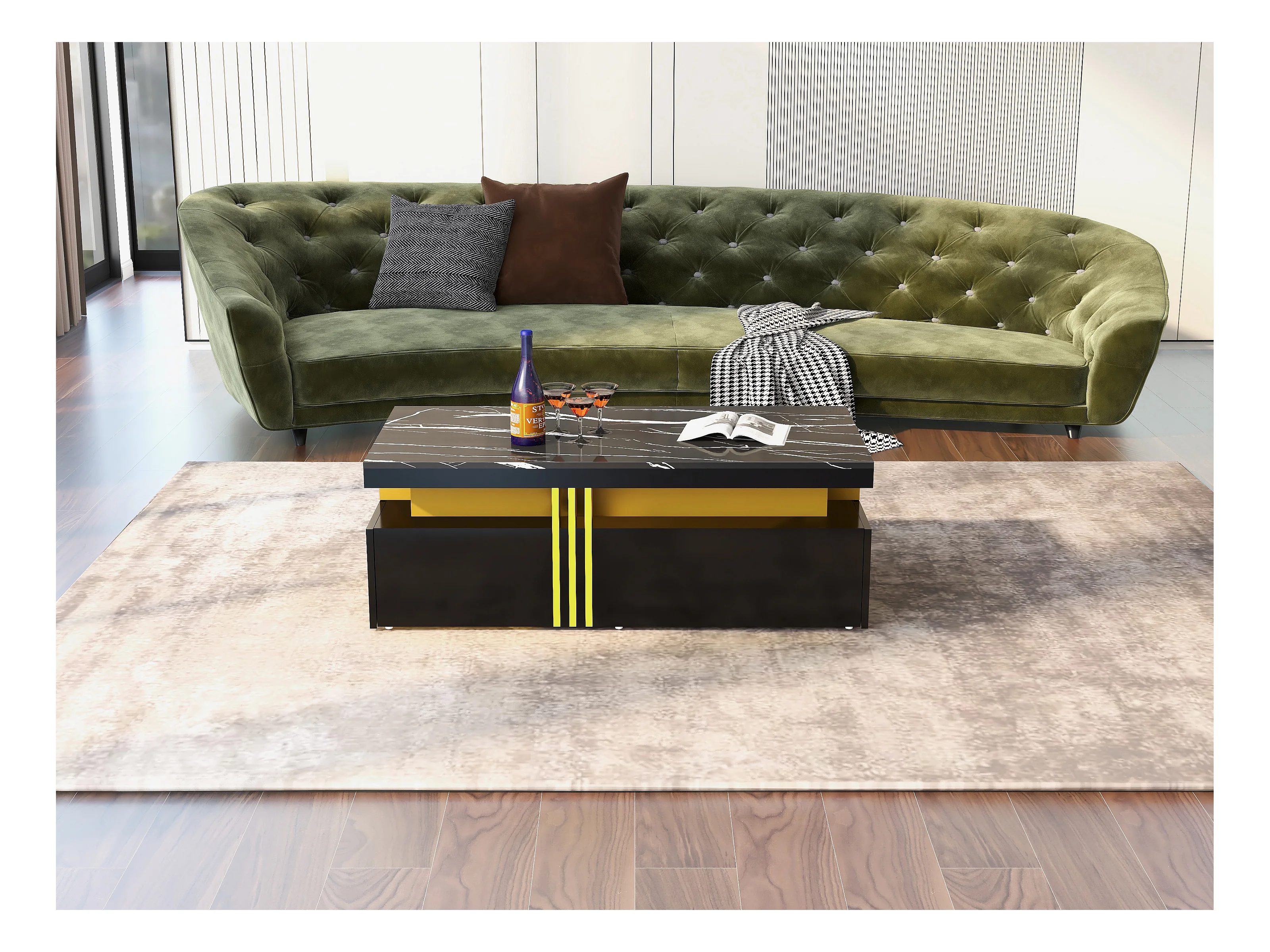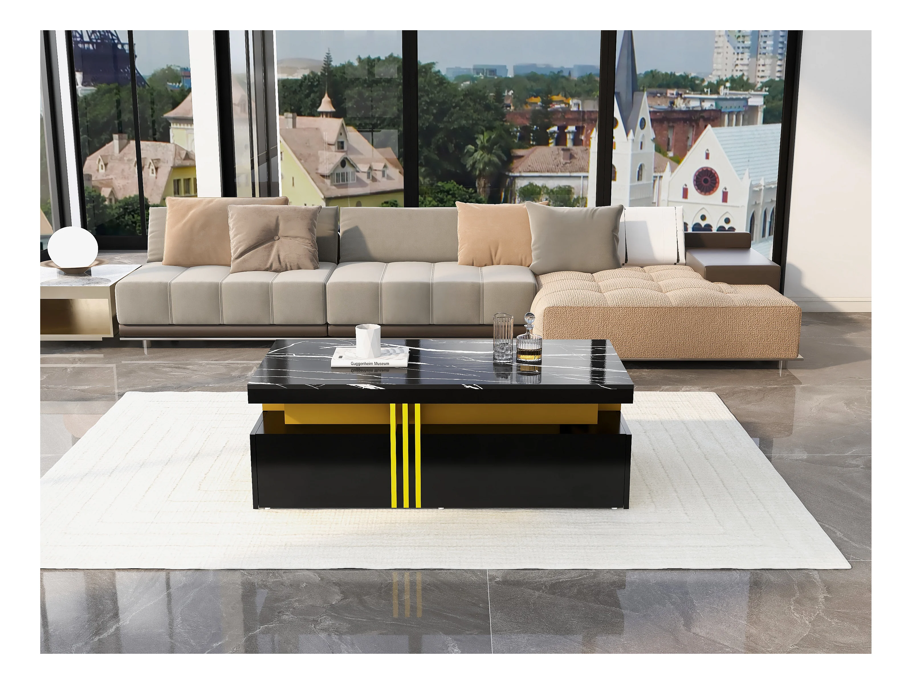 Table basse moderne avec plateau laqué brillant, 2 tiroirs en bois, plateau marbré, panneaux MDF noir (100x50x40cm)