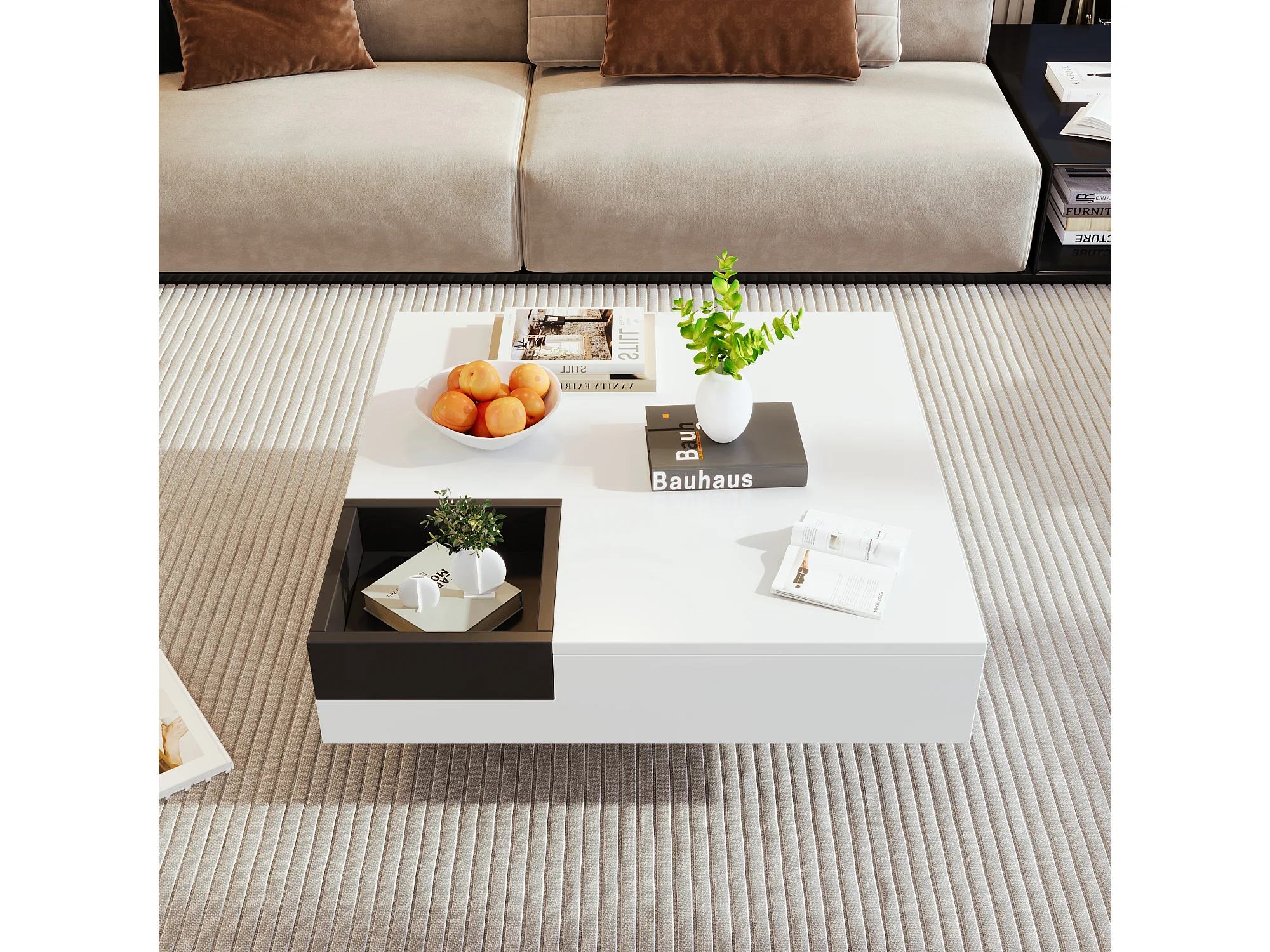 Table Basse Moderne Haute Brillance 72x72x30 cm – Design Colorblock Noir et Blanc avec Boîte de Rangement Amovible et Effet LED Multicolore