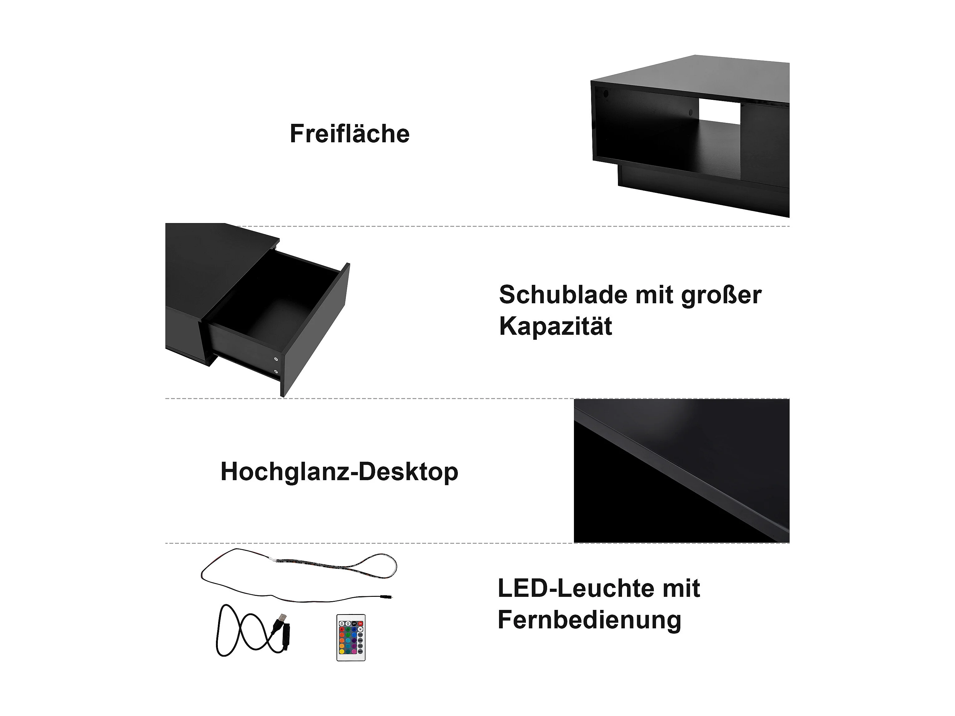 Table basse moderne laquée avec plateau extensible et rangement, panneau de particules, noir (95x55x32cm)