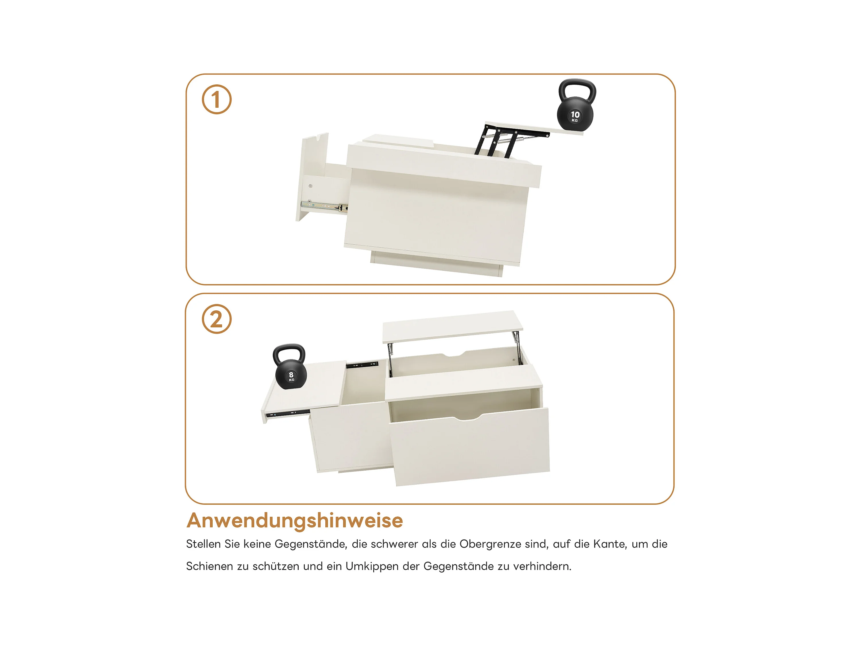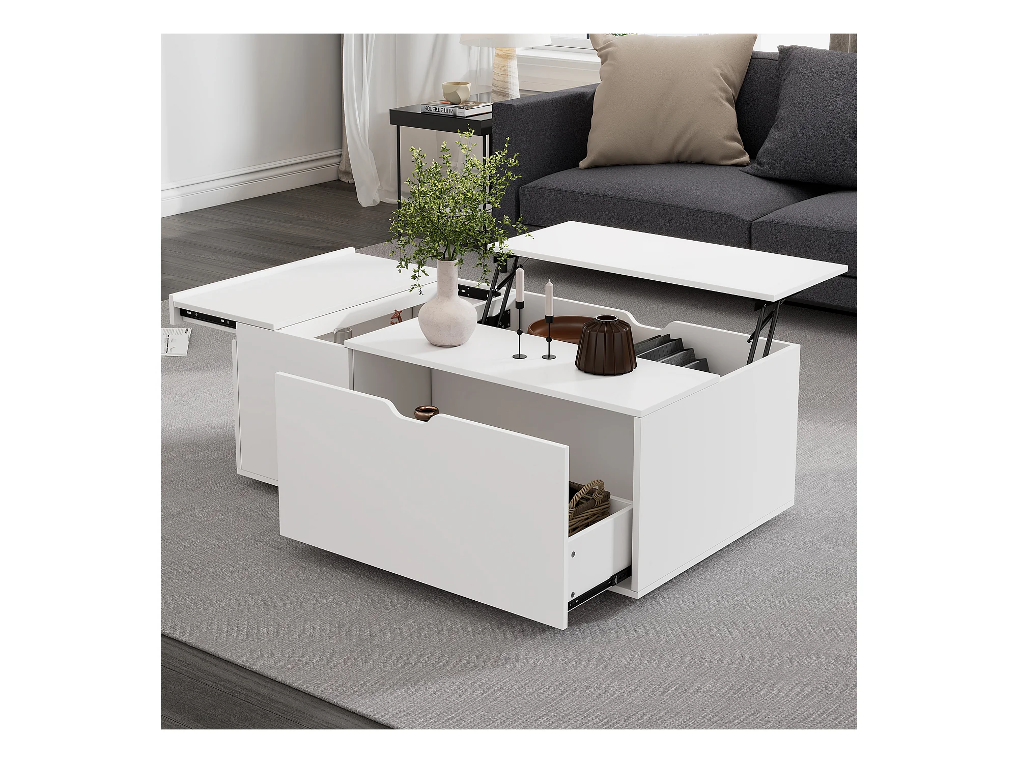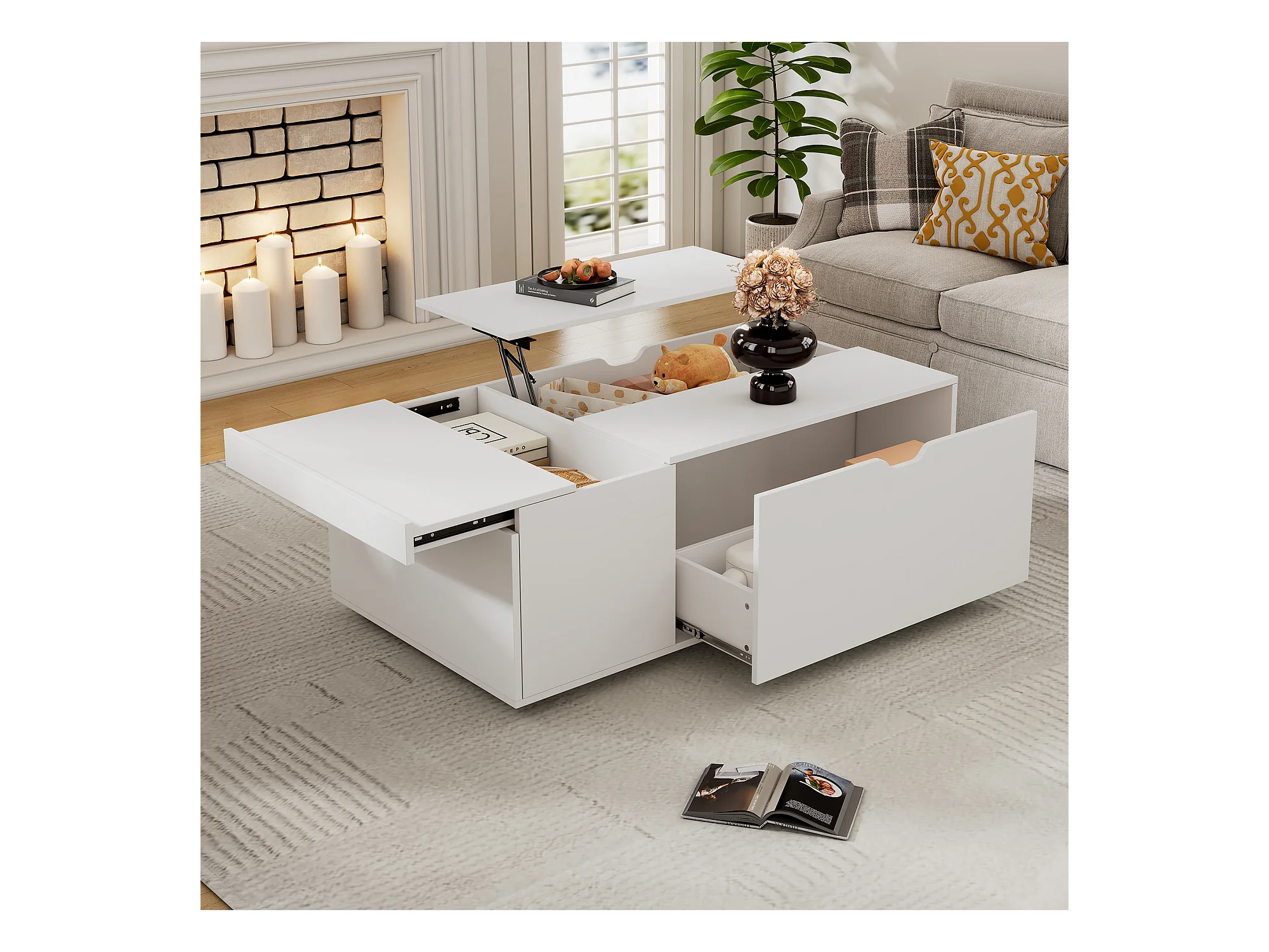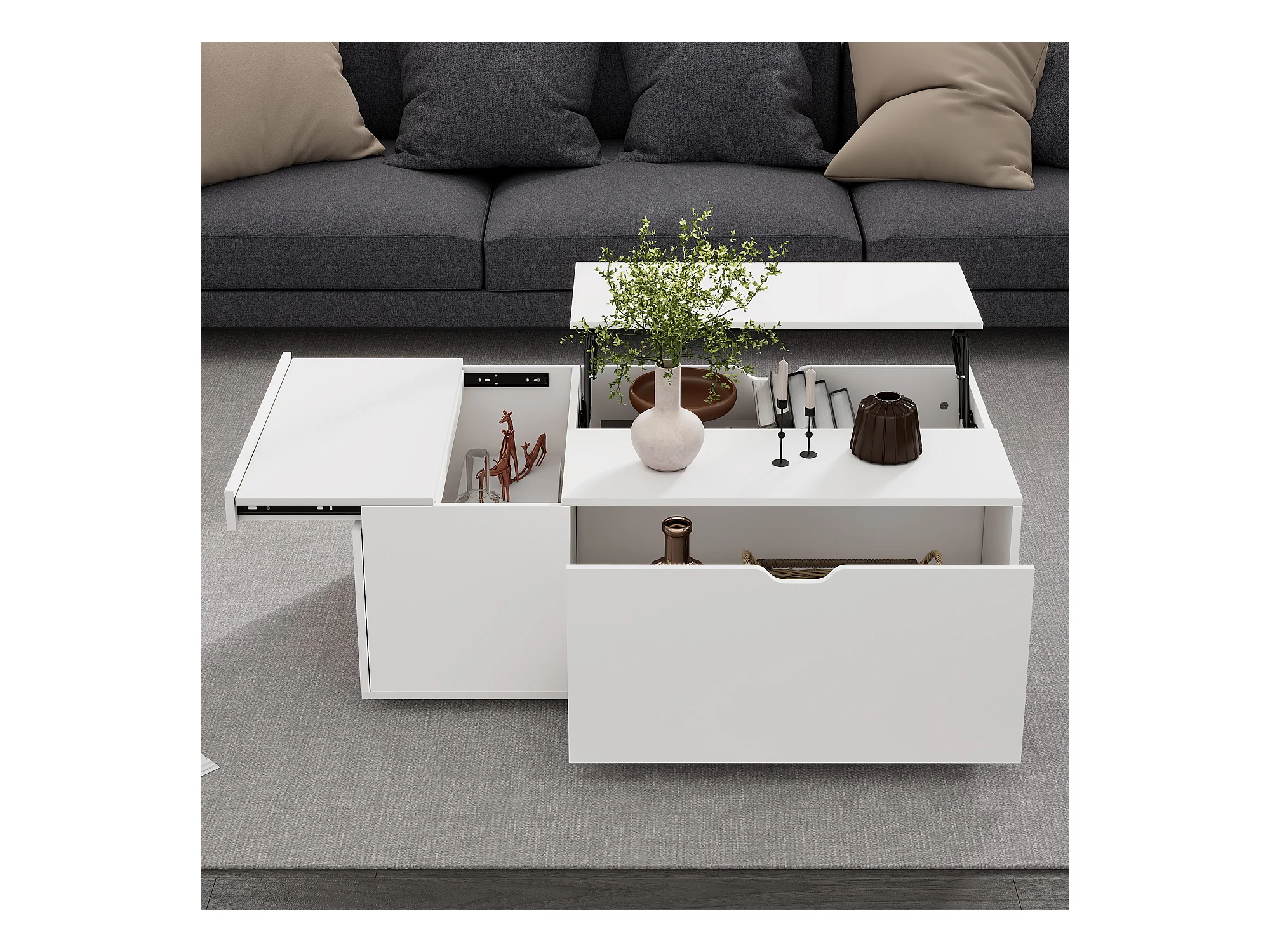 Table basse moderne lift-up avec tiroirs et portes coulissantes, design fonctionnel, bois aggloméré, blanc (120x65x45.5 cm)