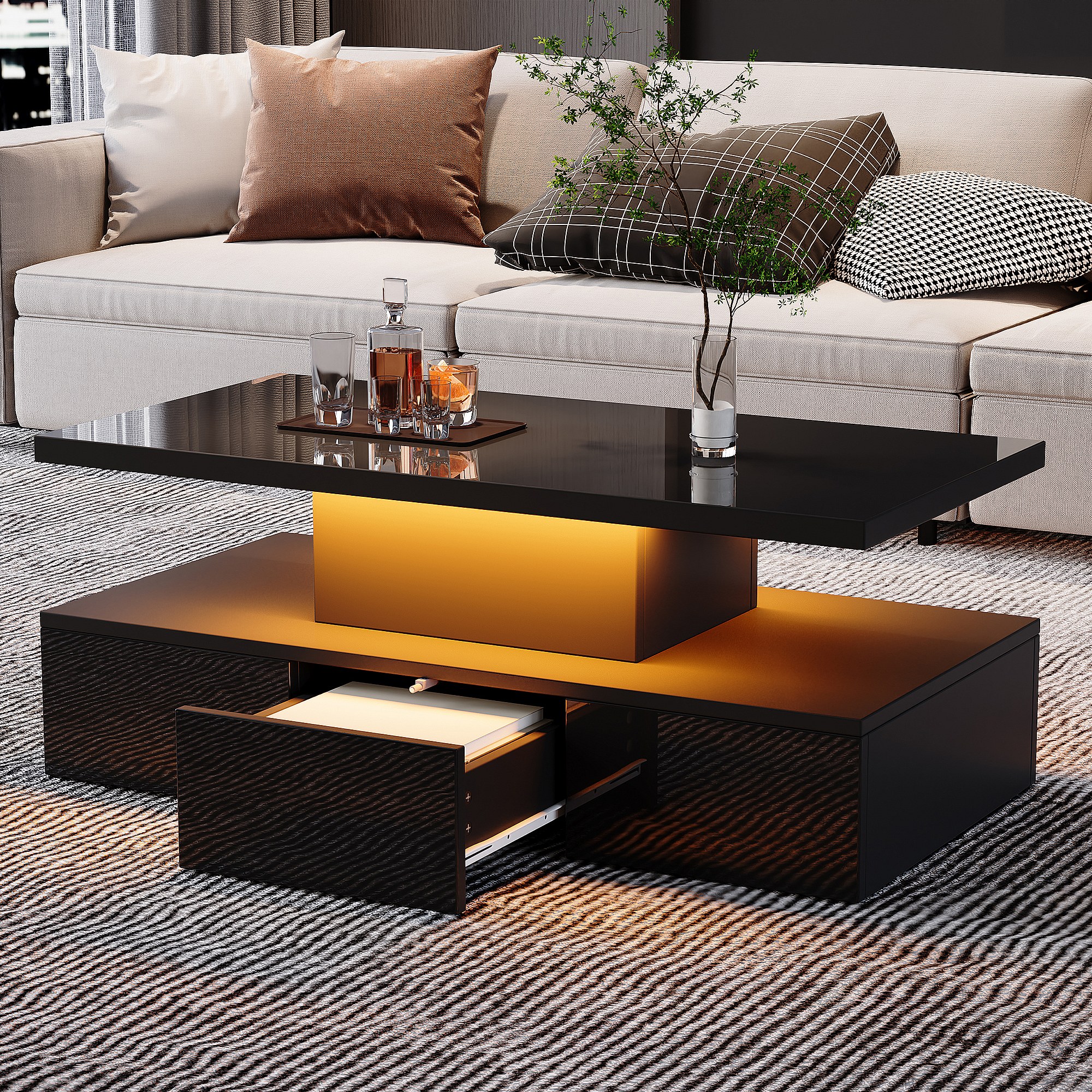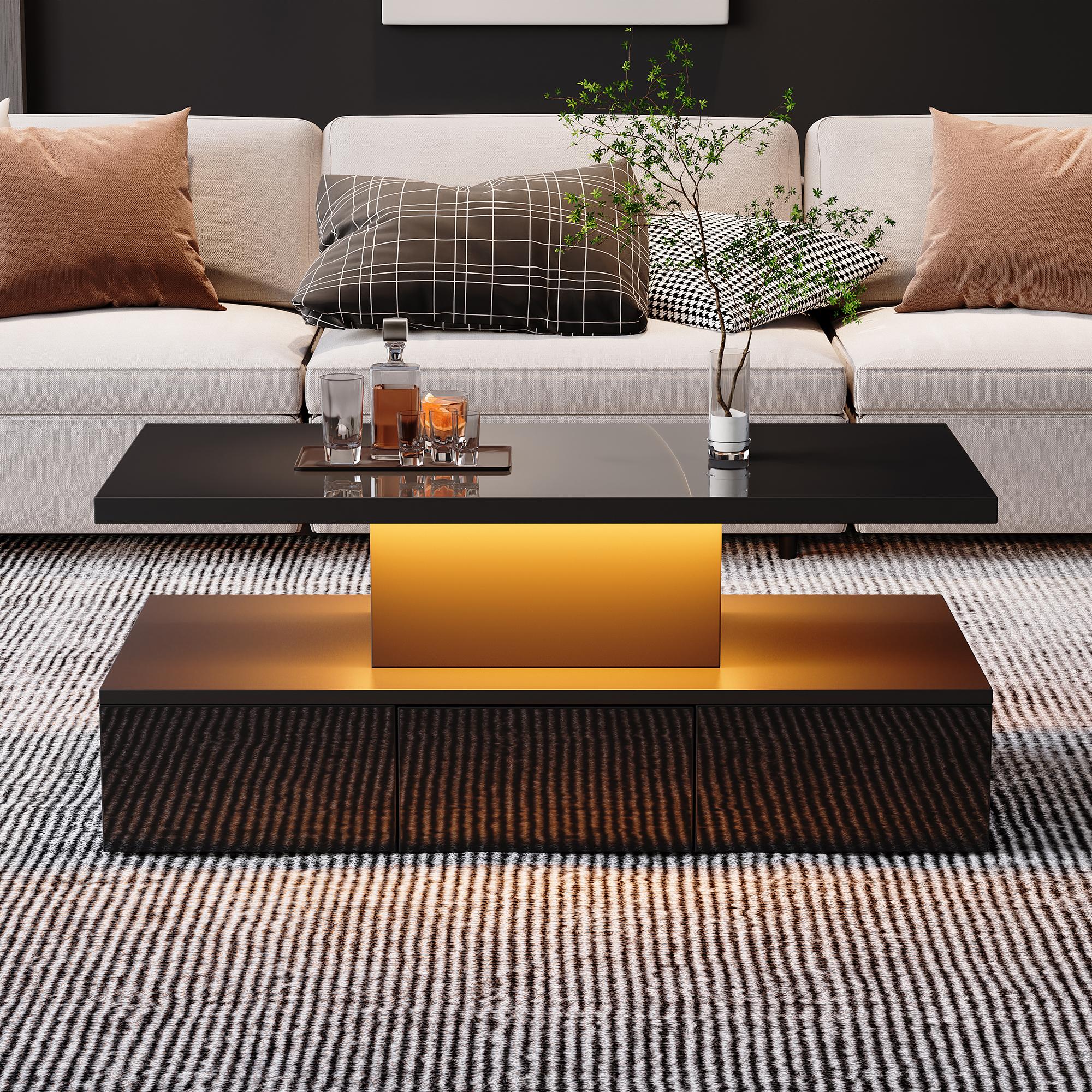 Table basse moderne rectangle noir laqué avec tiroir et LED