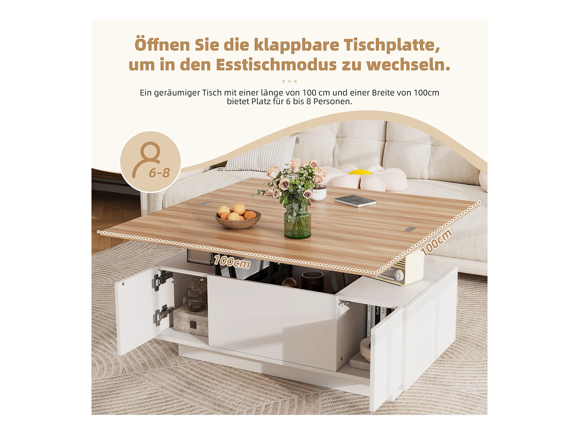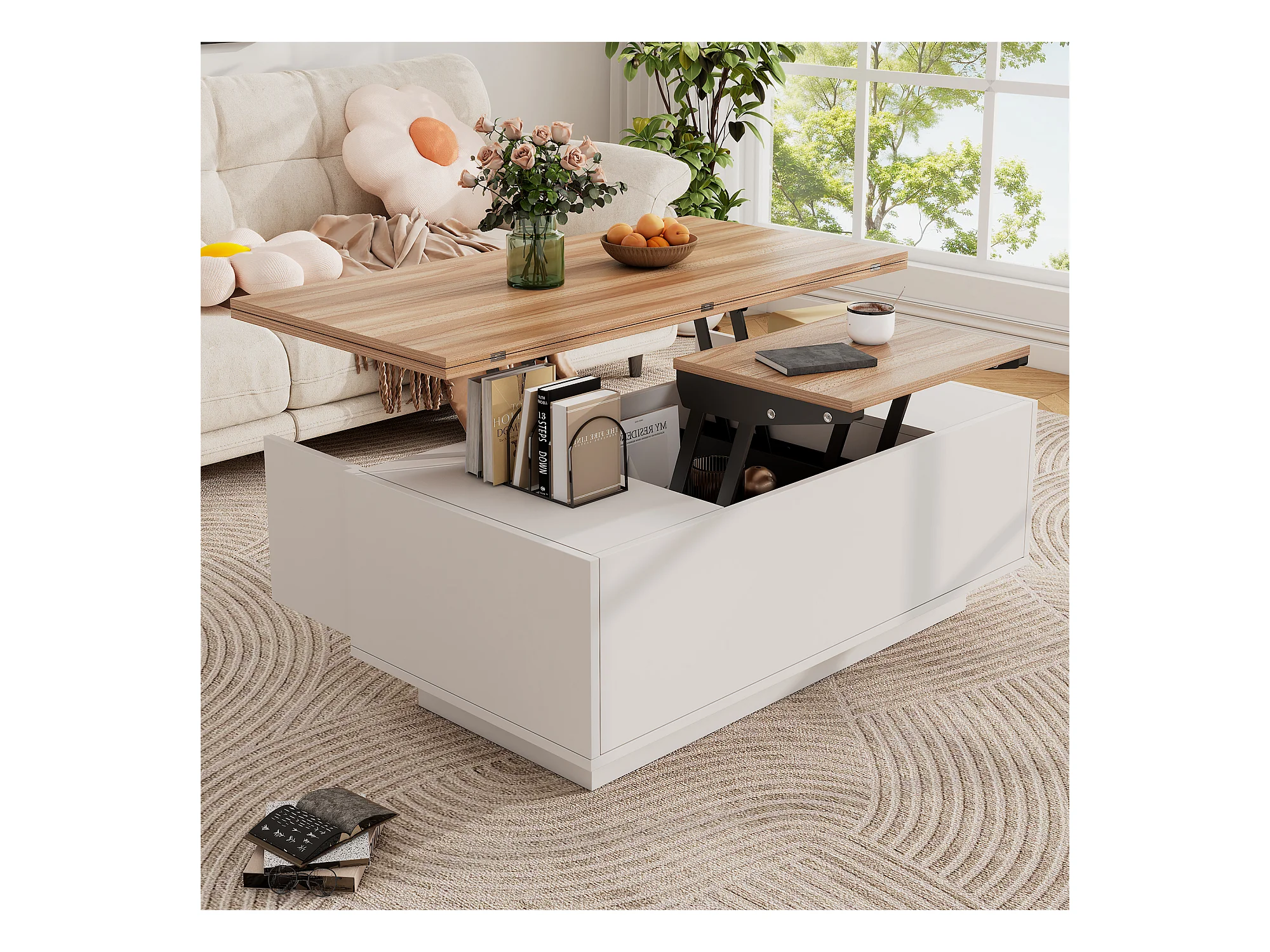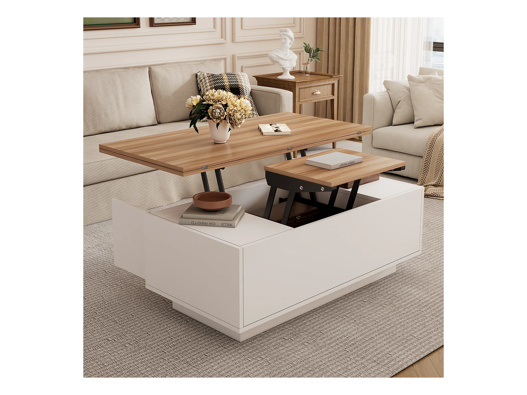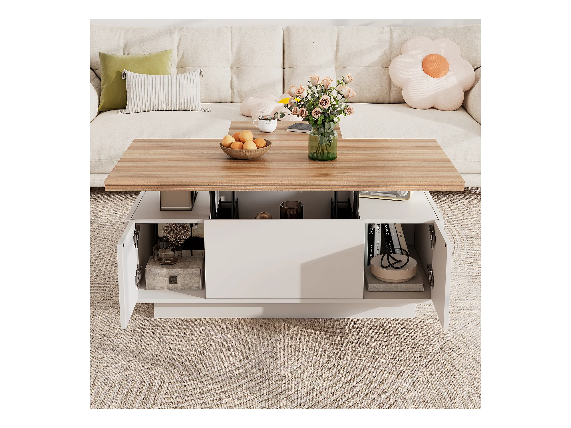 Table basse moderne relevable - 100 x 50 x 40 cm - avec 2 portes + rangement caché - aggloméré - blanc