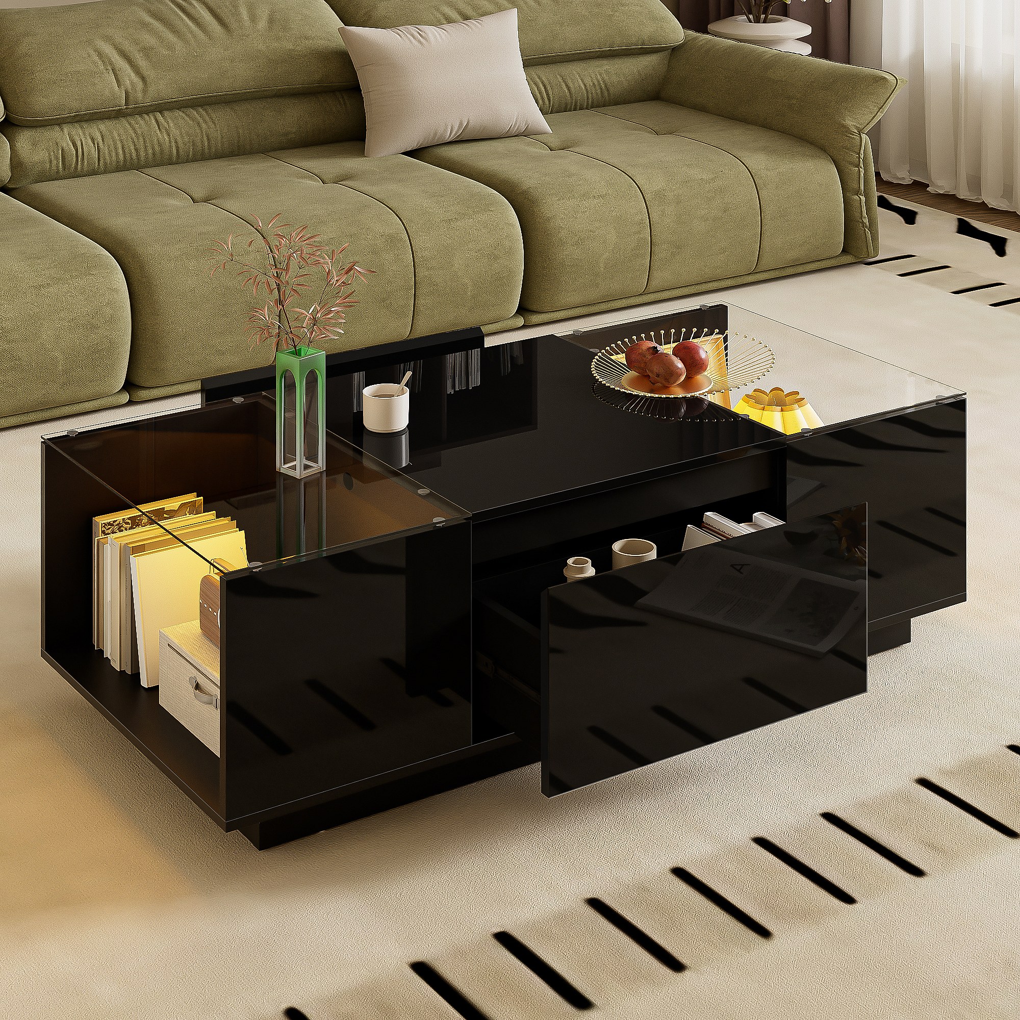 Table basse noir brillant, avec verre et éclairage LED – Élégance moderne pour salon