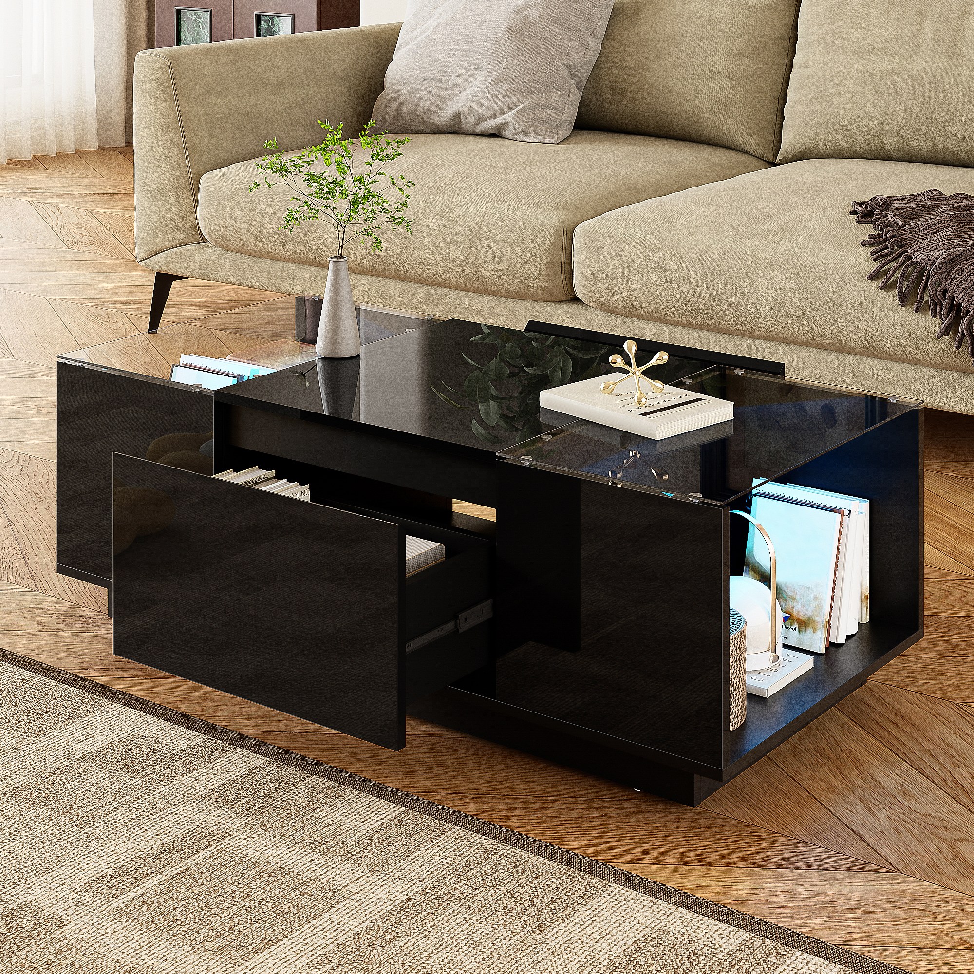 Table basse noire avec 2 tiroirs, éclairage LED et plateau en verre 105x50x35cm