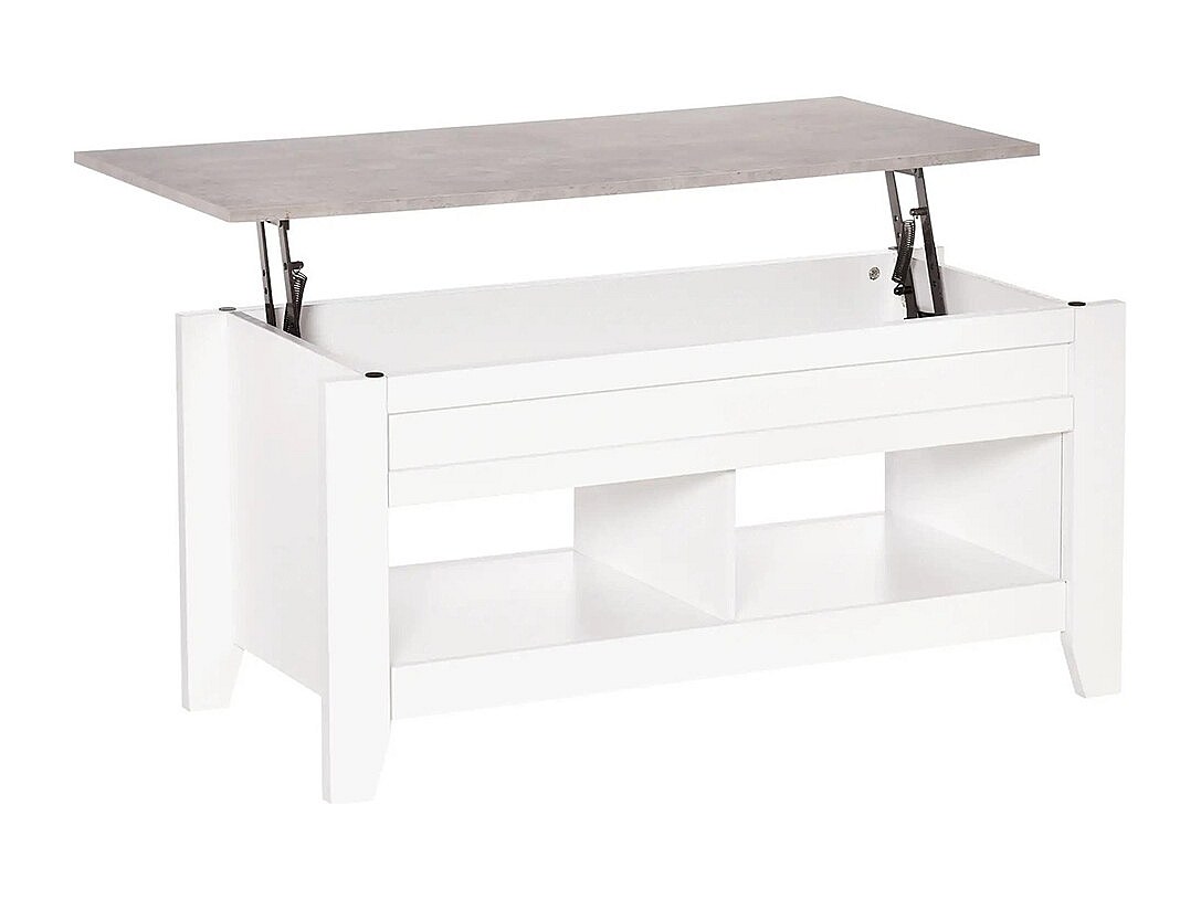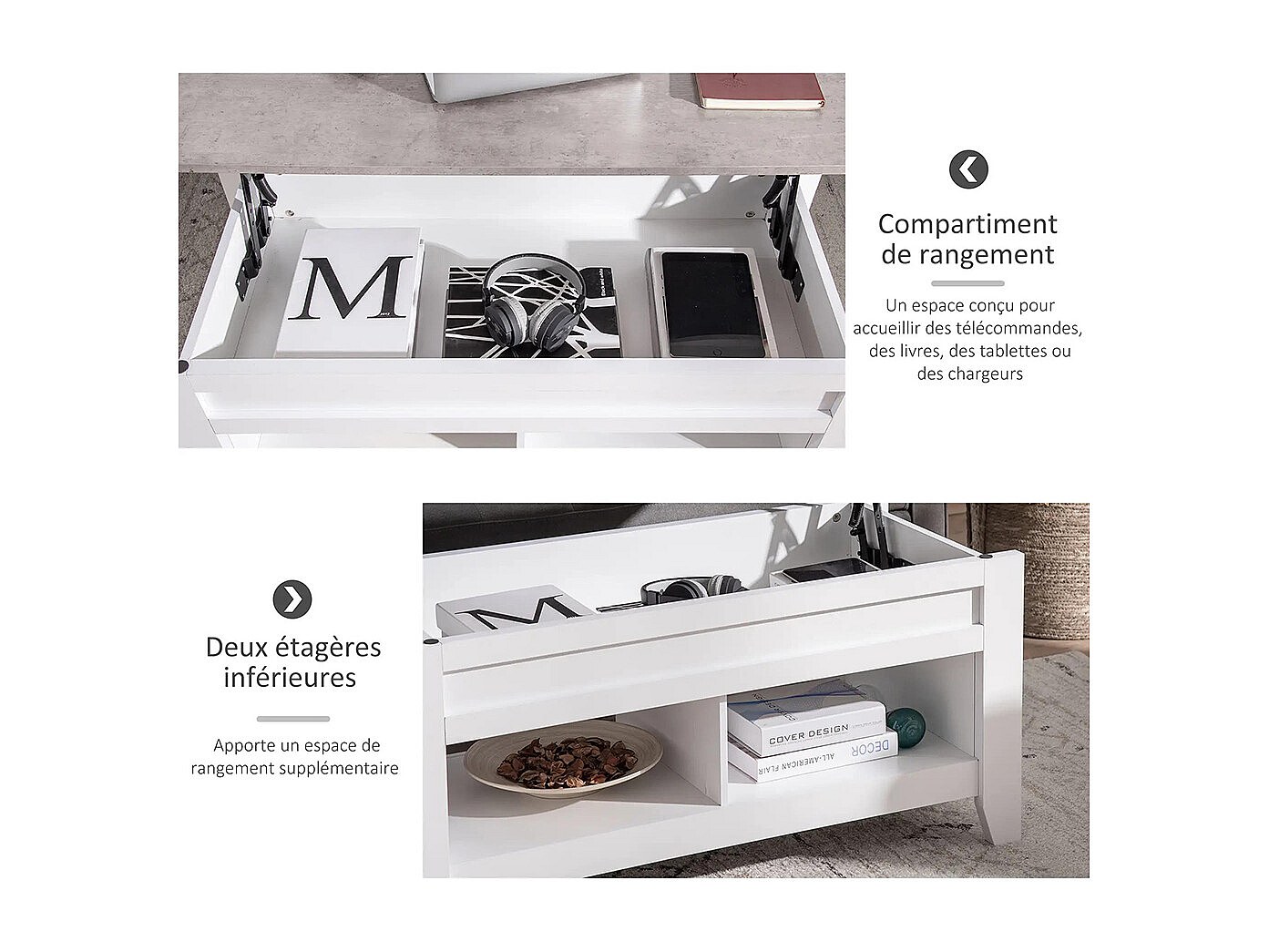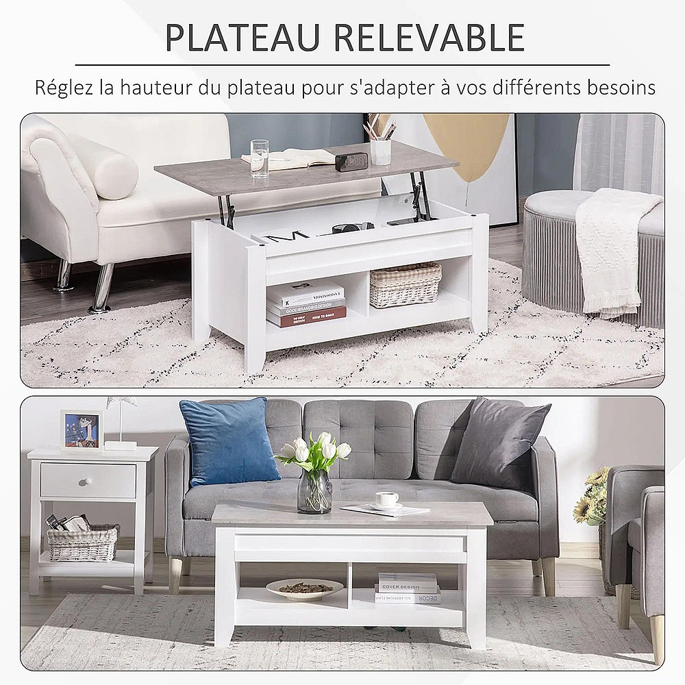 Table basse plateau relevable table de salon avec étagères et compartiment bois blanc