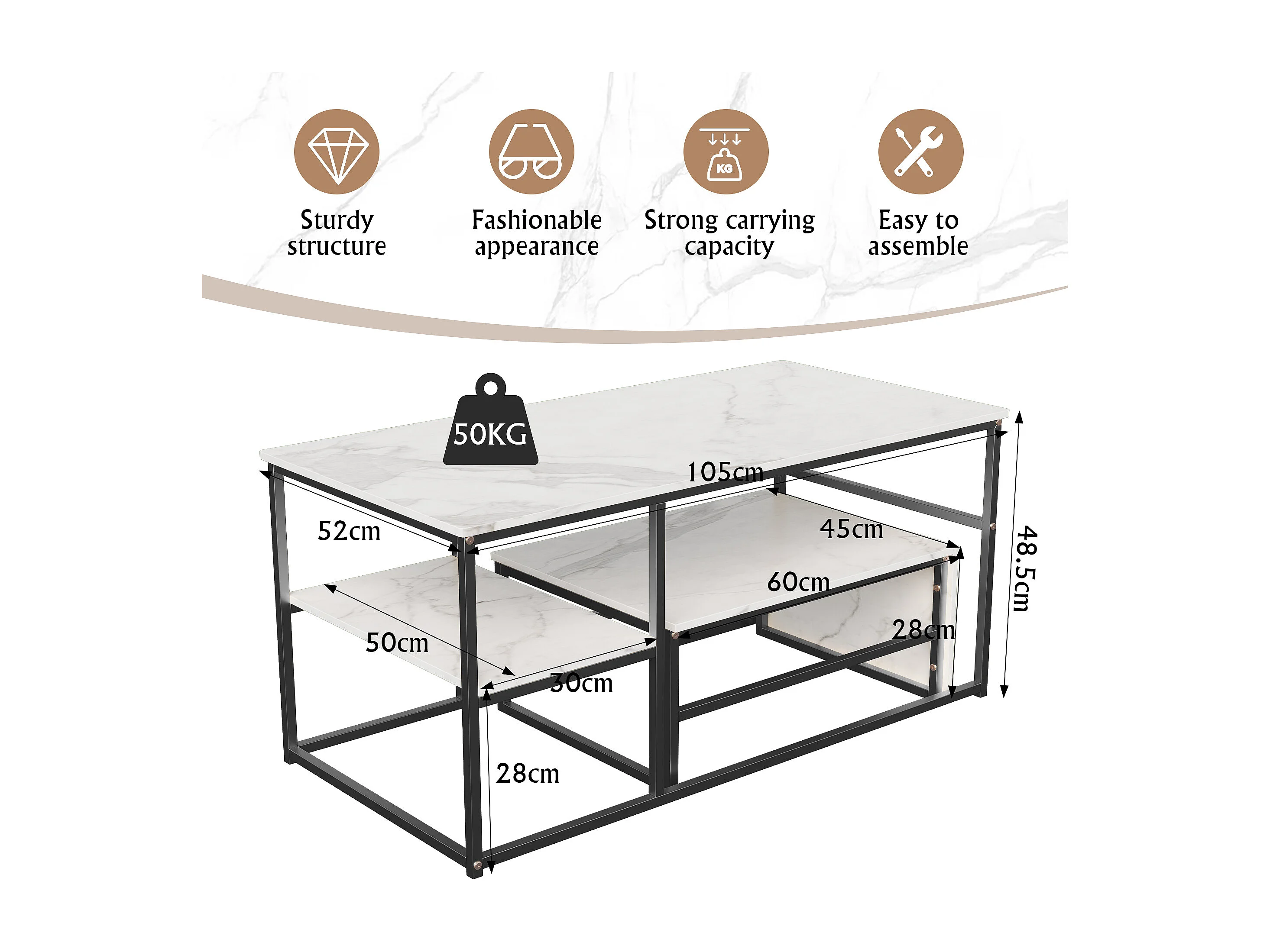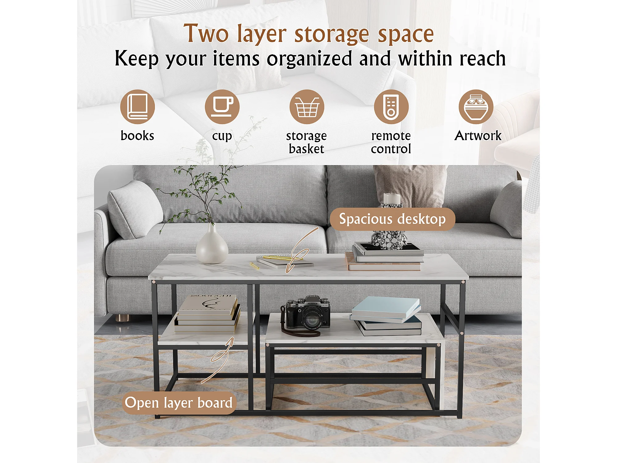 Table Basse Rectangulaire,Lot de 2 Tables Basses Gigognes,Table Basse Effet Marbre,Facile à Assembler,Utilisation Multifonctionnelle, Noir + Blanc
