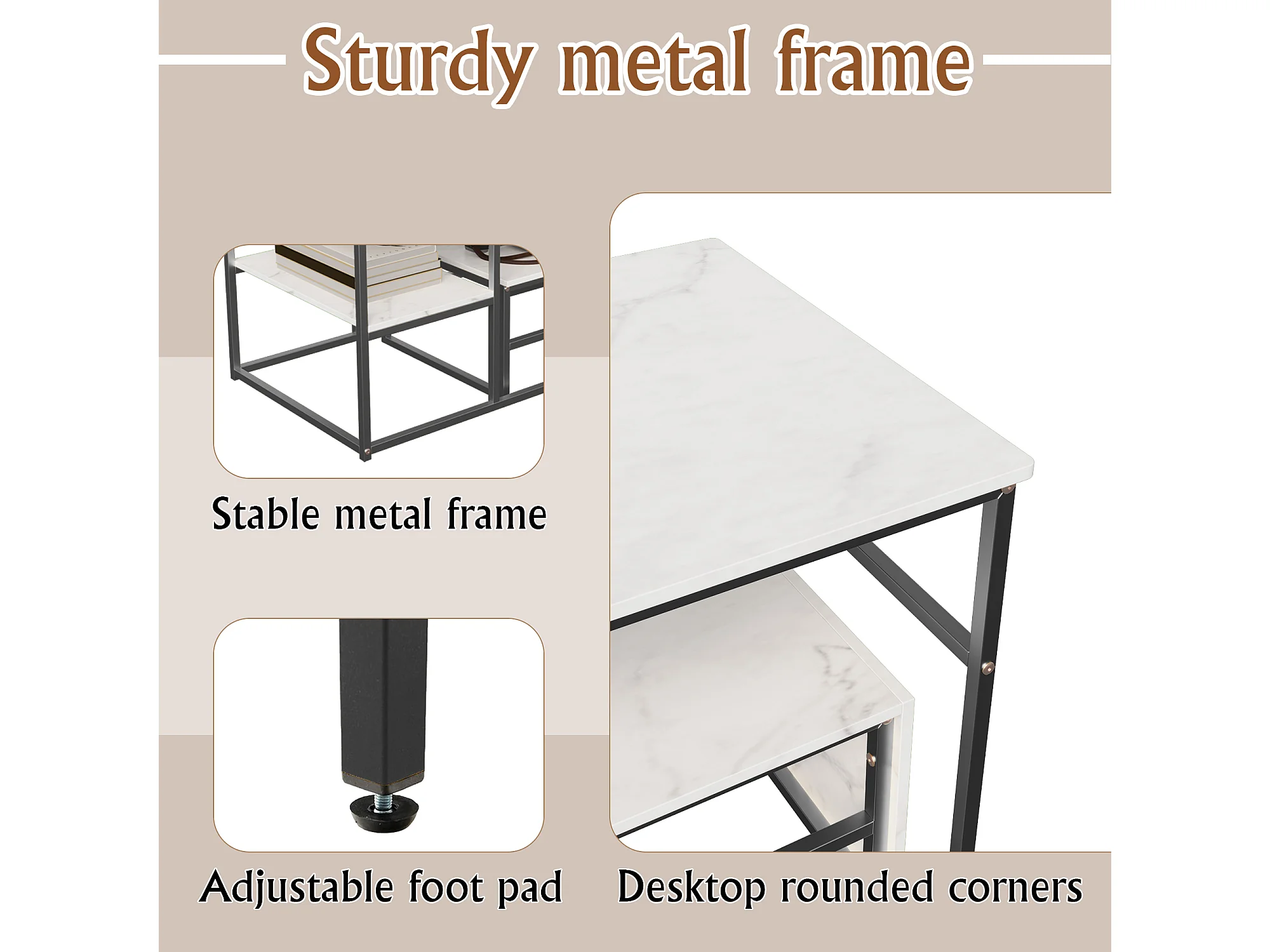 Lot de 2 Table basse gigogne, carrée, 60cm, avec plateau de effet marbre, brillante, tiroirs, pieds en métal, pour Salon, Manger - Blanc