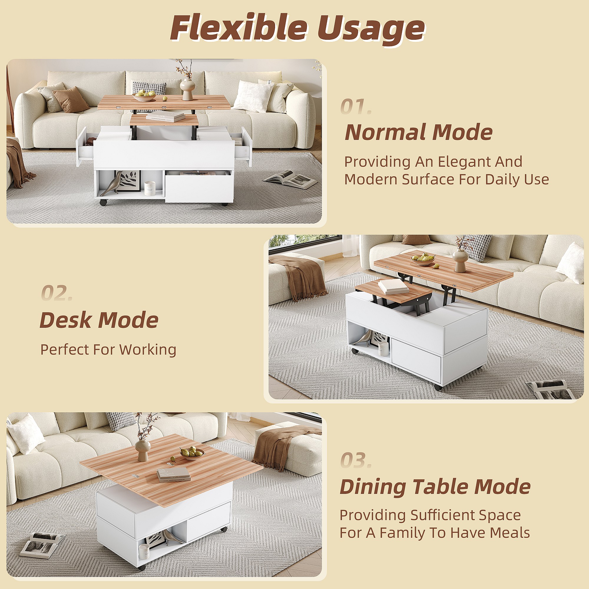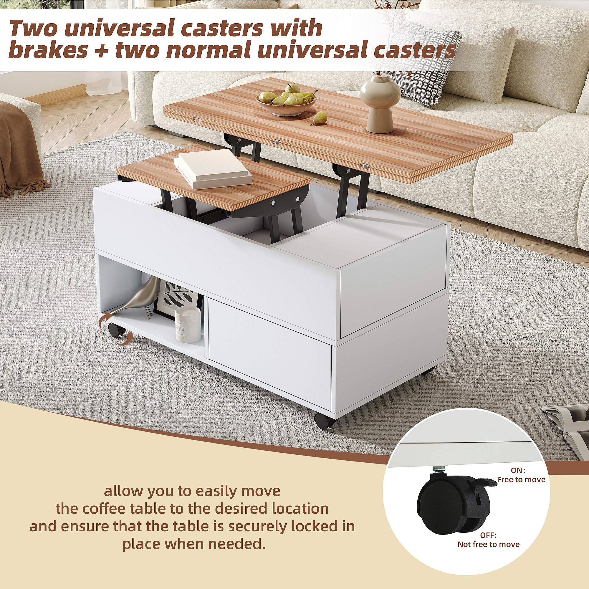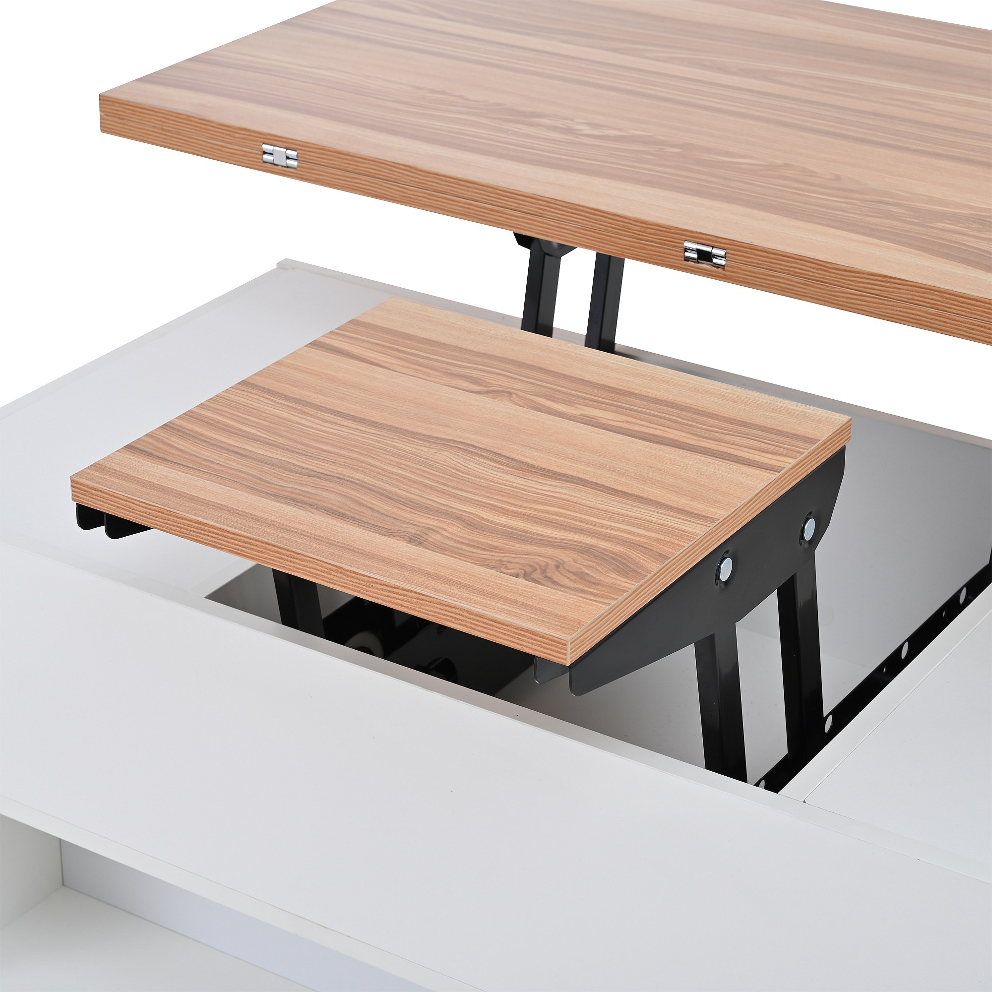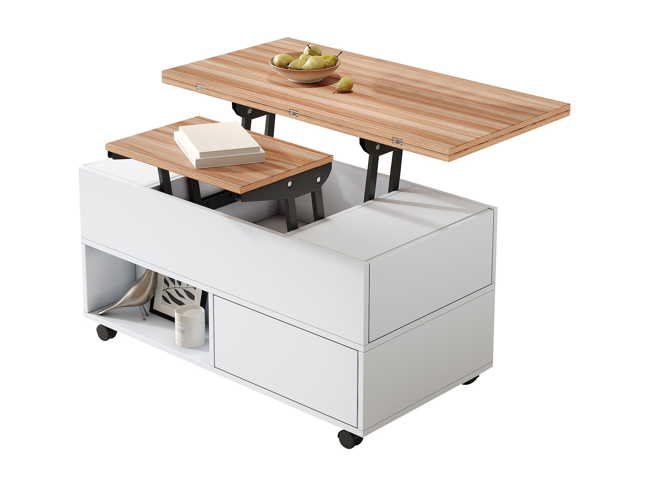 Table basse relevable 100x50x52 cm - avec 4 roulettes - 4 tiroirs - Rangement semi-ouvert - Blanc + Naturel