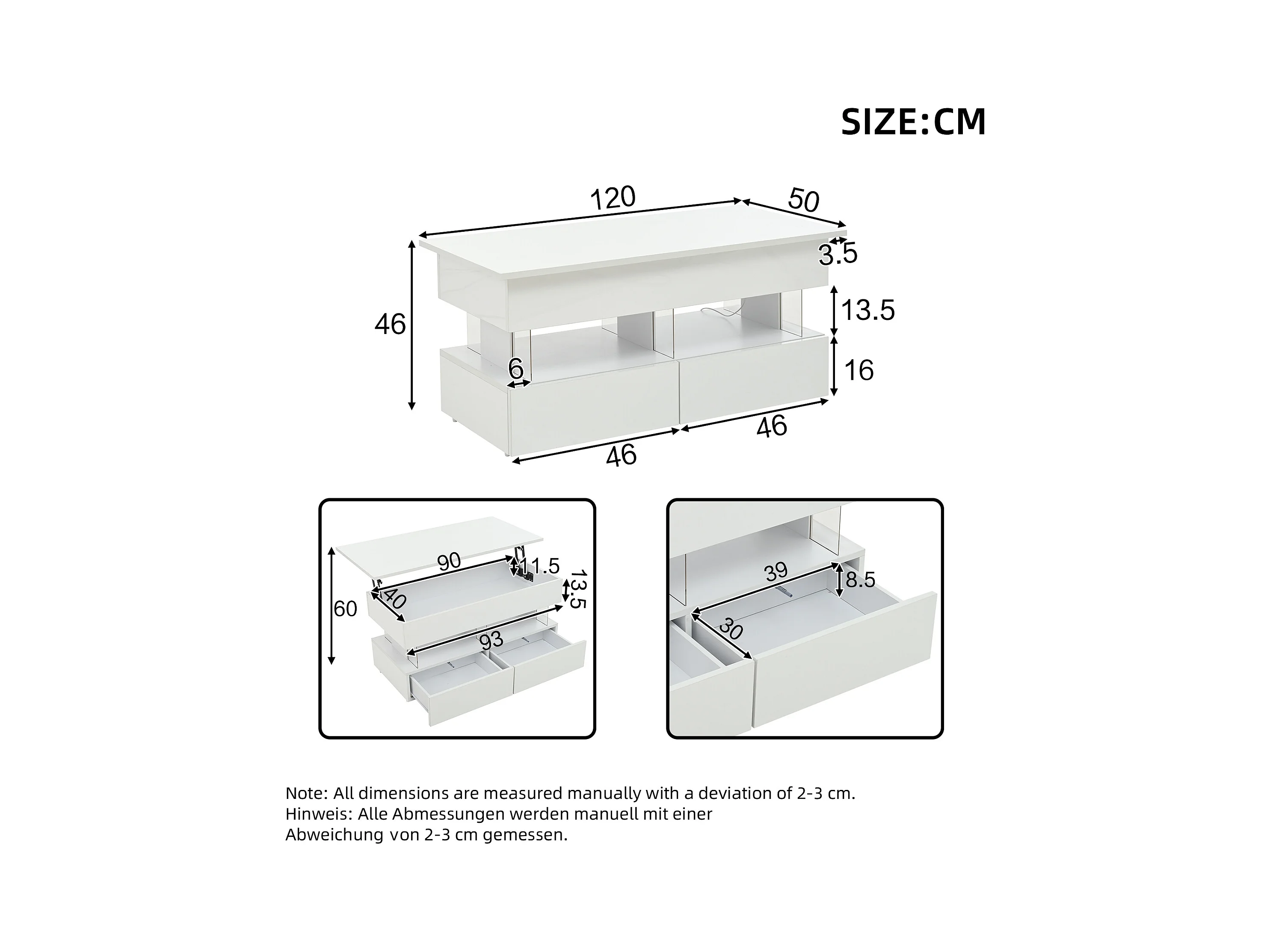 Table basse relevable 120x50x46 cm - avec éclairage LED - 2 tiroirs - MDF + verre trempé - blanc